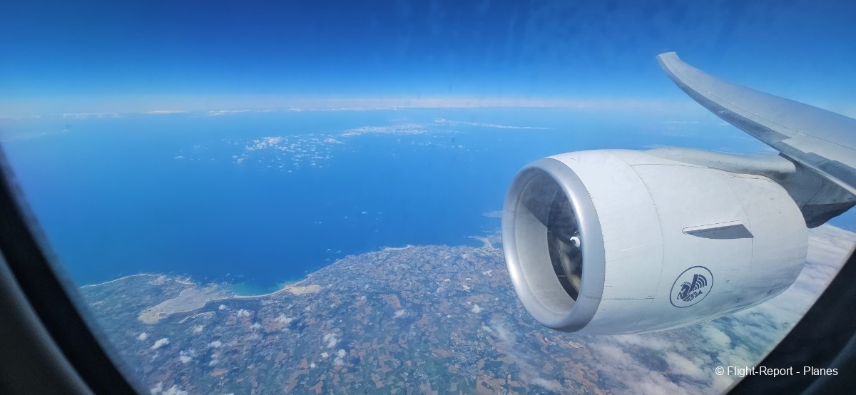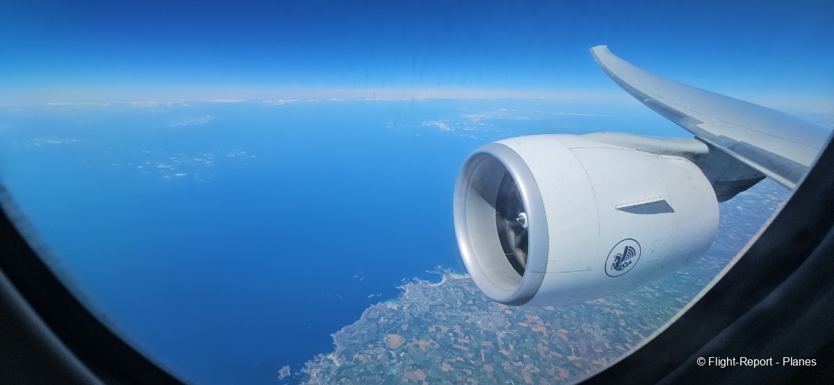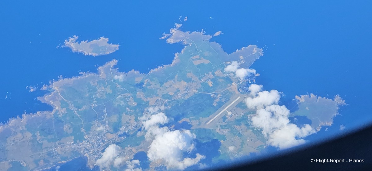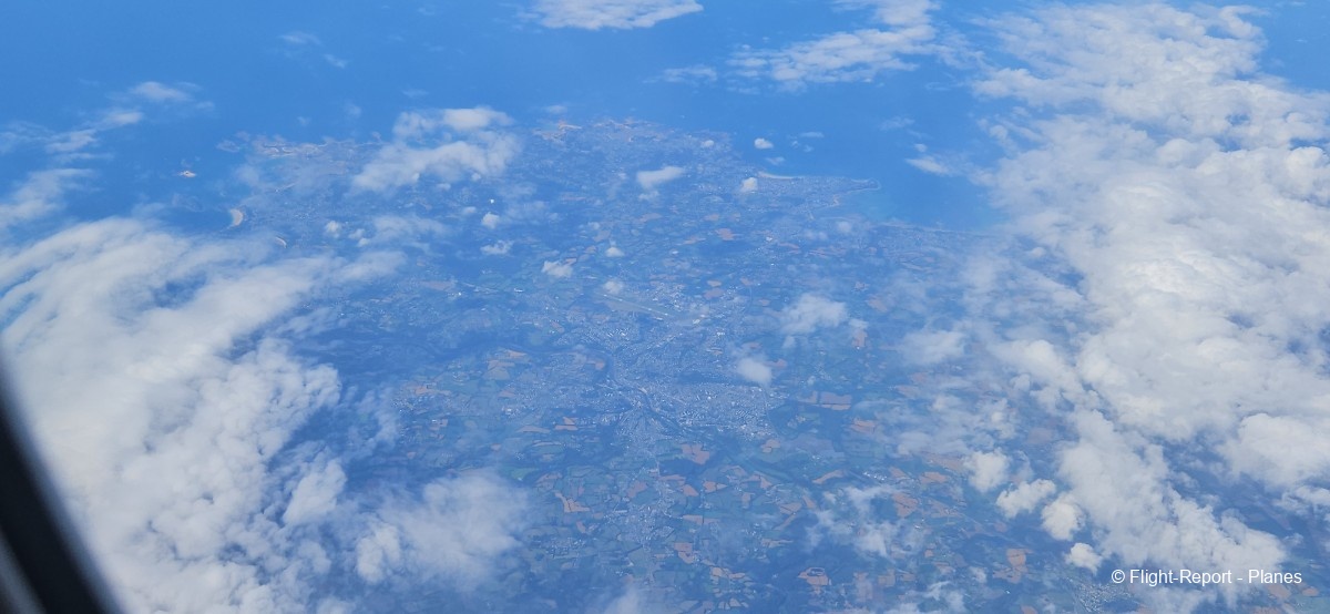 Environ 20 minutes après le décollage, nous atteignons notre altitude de croisière initiale fixée à 32 000 pieds, avec une vitesse de 435 nœuds (soit 802 km/h). Nous progressons vers la côte atlantique et survolons Granville, les îles Chausey,