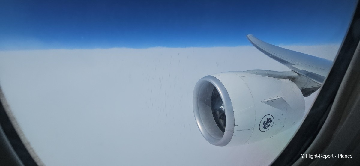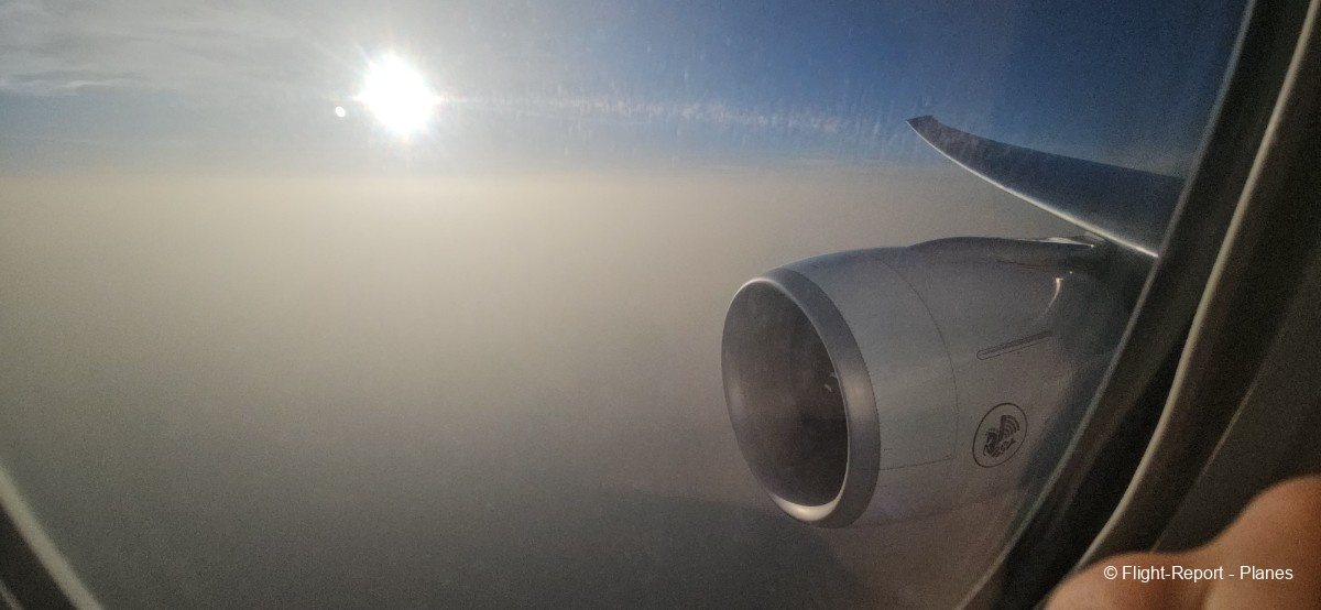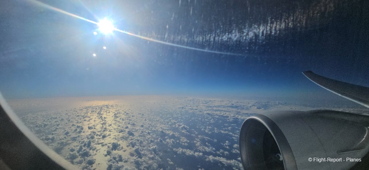 Le ciel devient progressivement couvert, et à ce moment il reste environ 6 heures de vol. Nous poursuivons la montée jusqu’à 34 000 pieds, à une vitesse de 488 nœuds (904 km/h).