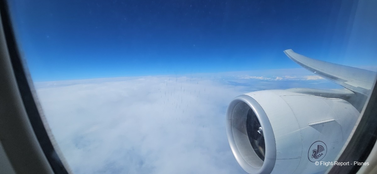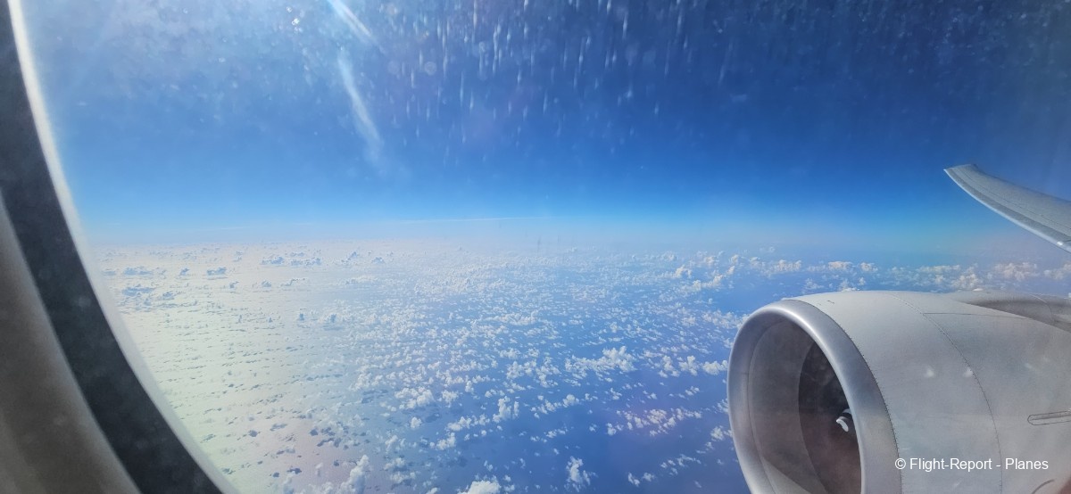 Comme annoncé par le commandant de bord, quelques turbulences modérées se manifestent sous un ciel partiellement nuageux. L’avion grimpe ensuite à 33 000 pieds.