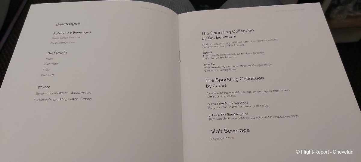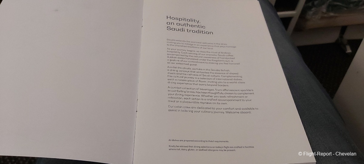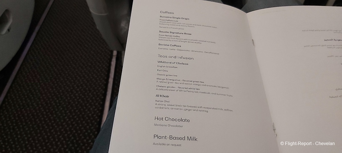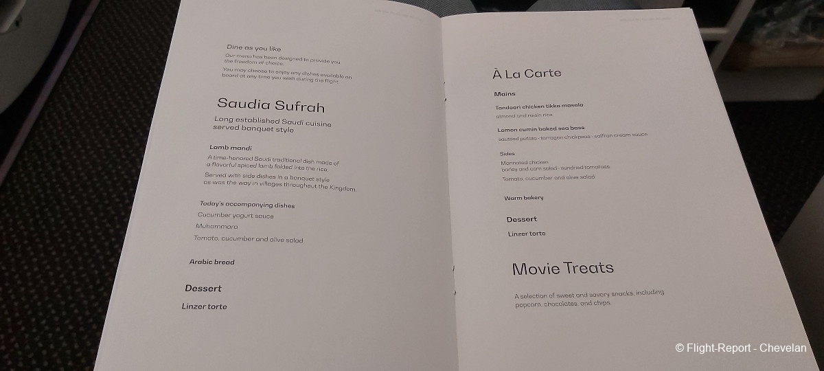 Le choix reste sobre mais correct, il est possible de sélectionner la cuisine saoudienne ou l'occidentale, aucun alcool n'est disponible sur les vols de la compagnie du Royaume.