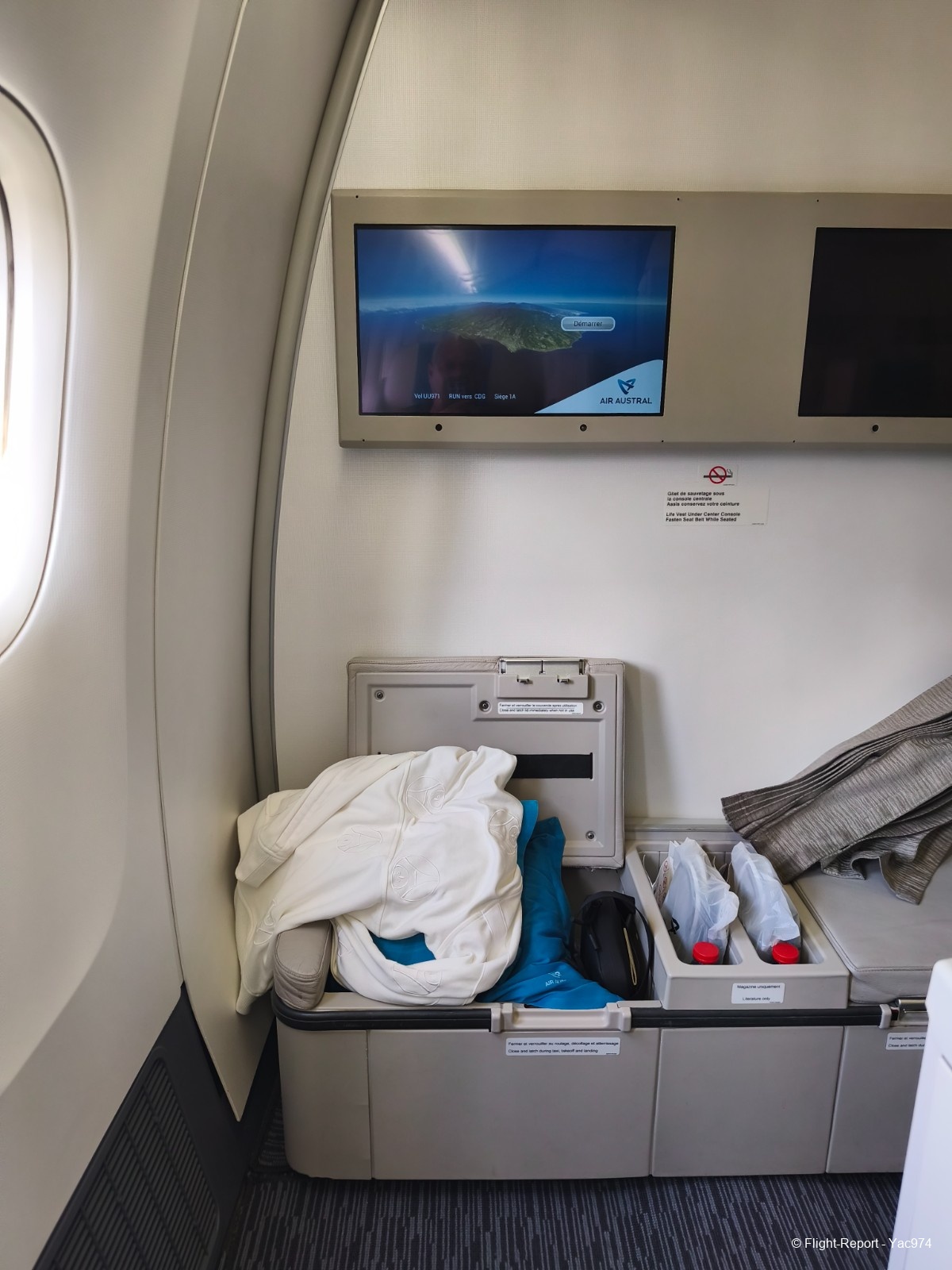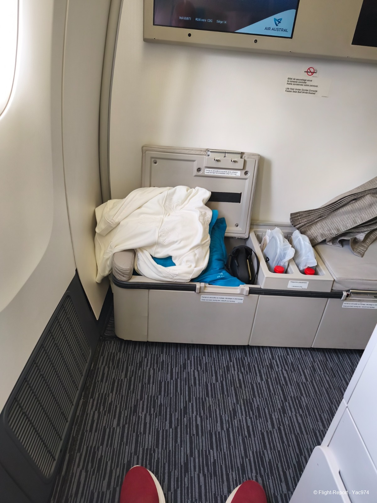 Juste après le décollage distribution d'une serviette chaude et de la trousse de confort de Air Austral (ancienne version) … les pantoufles étaient dans le compartiment prévu. et bouteille d'eau.