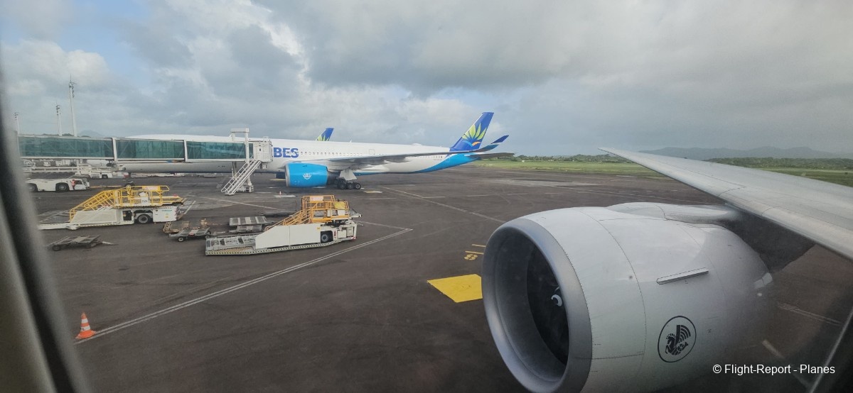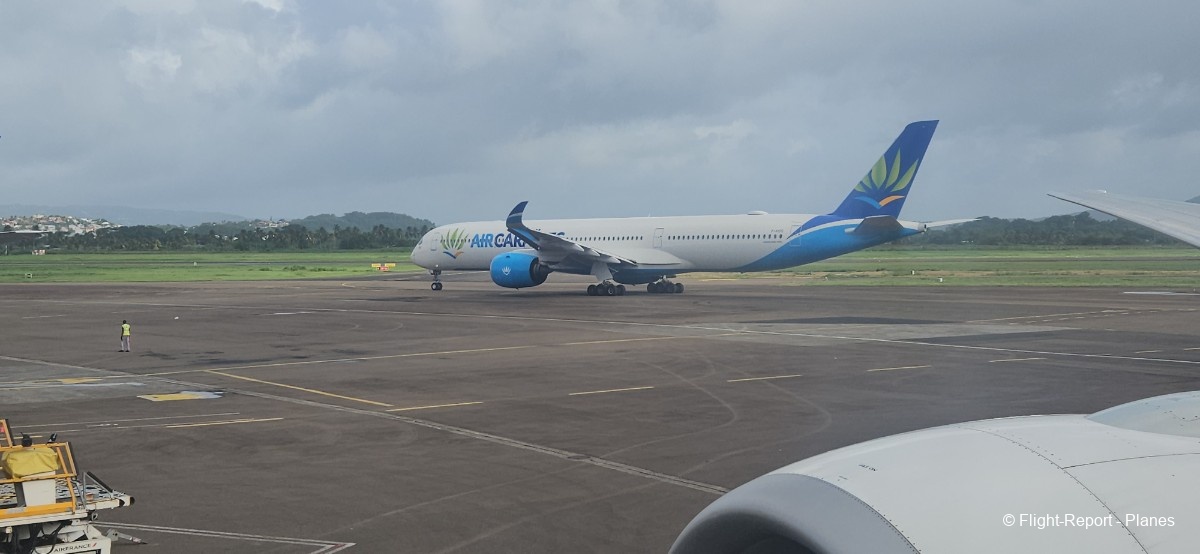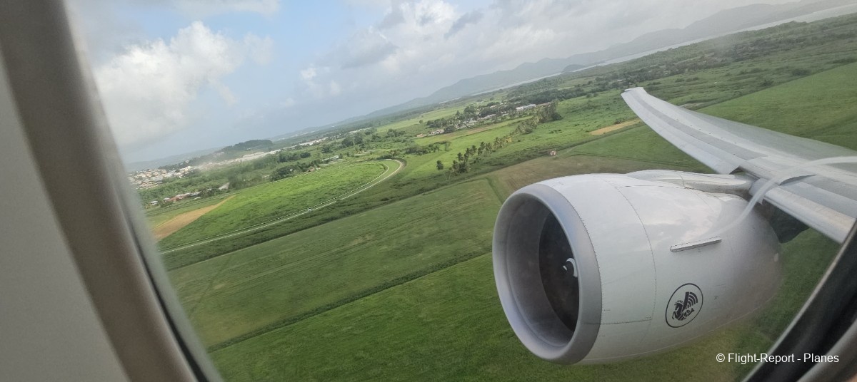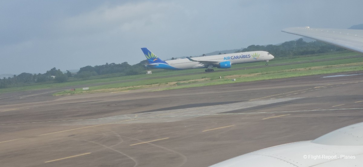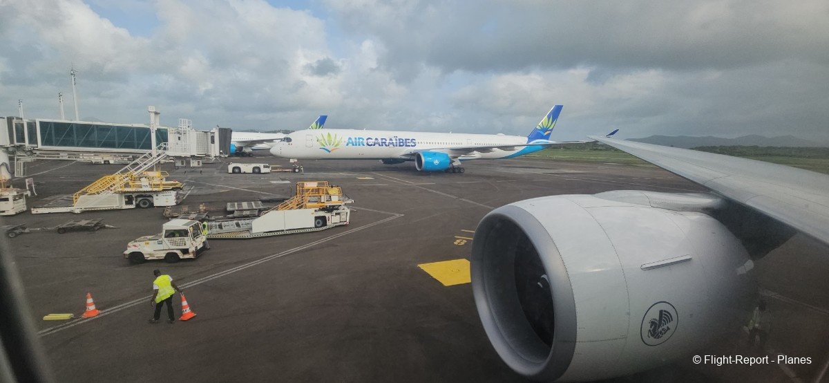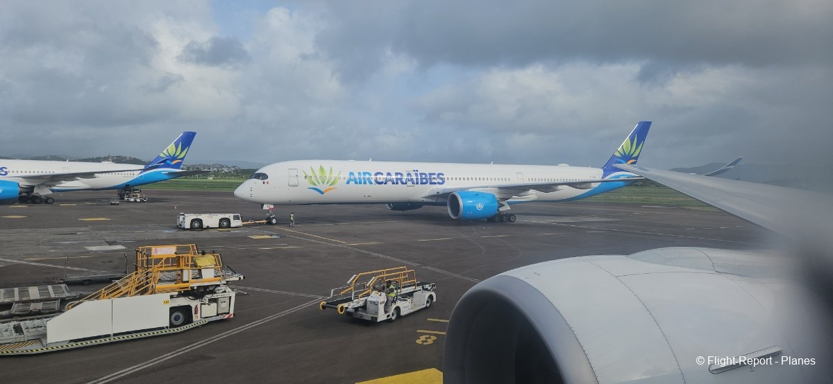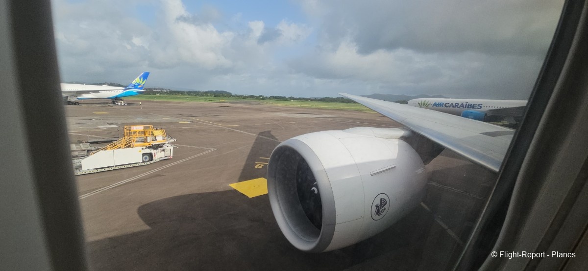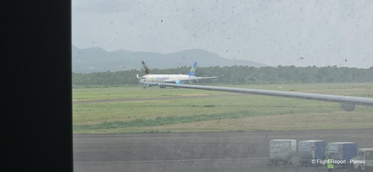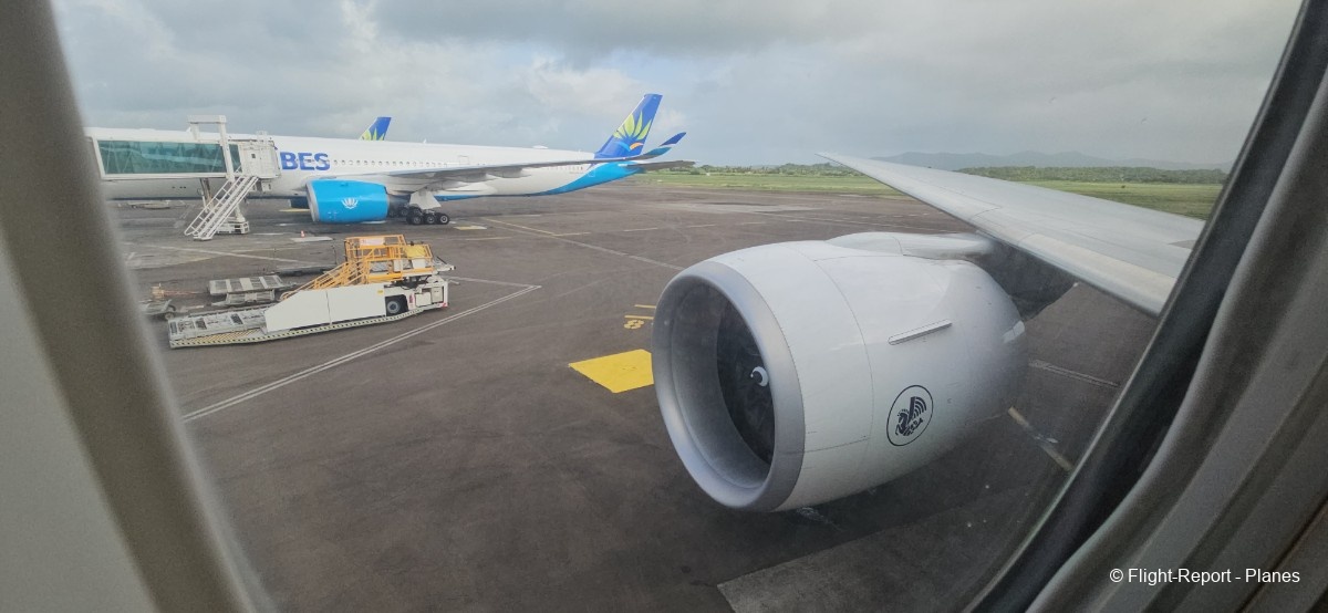 Je prends place au siège 14L, avec une superbe vue sur le moteur GE90. À 16h28, nous apercevons l’Airbus A350-1000 d’Air Caraïbes repousser pour son vol vers Paris-Orly, tandis qu’un ATR d’Air Antilles en provenance de Pointe-à-Pitre rejoint également le tarmac.