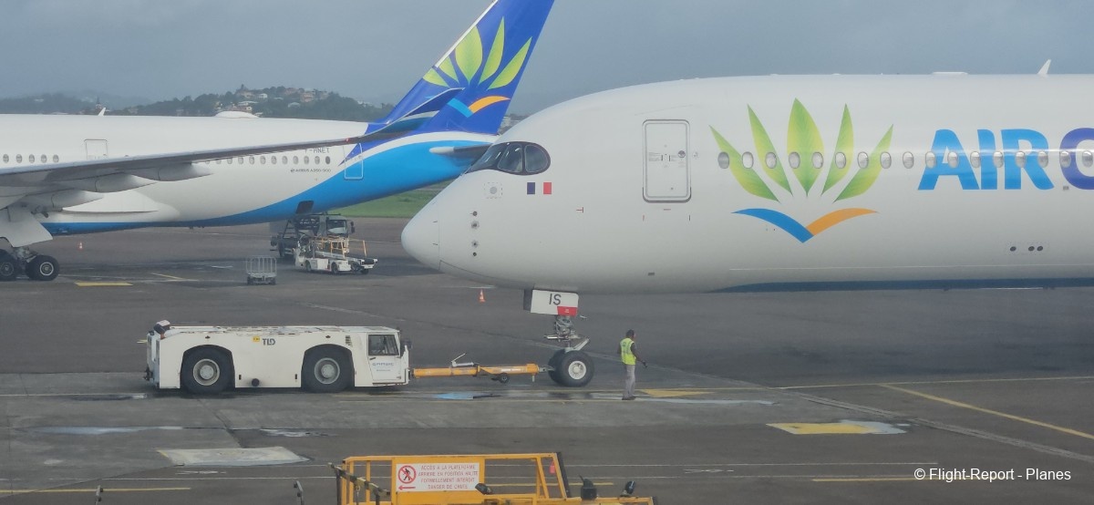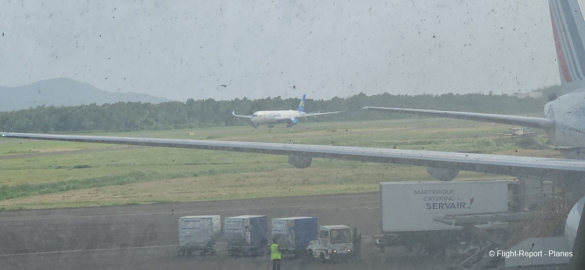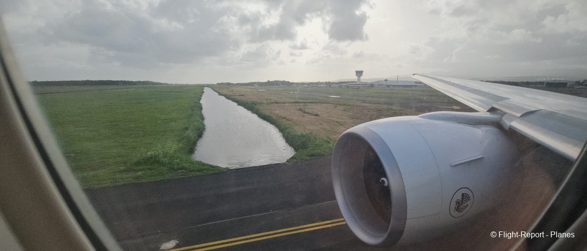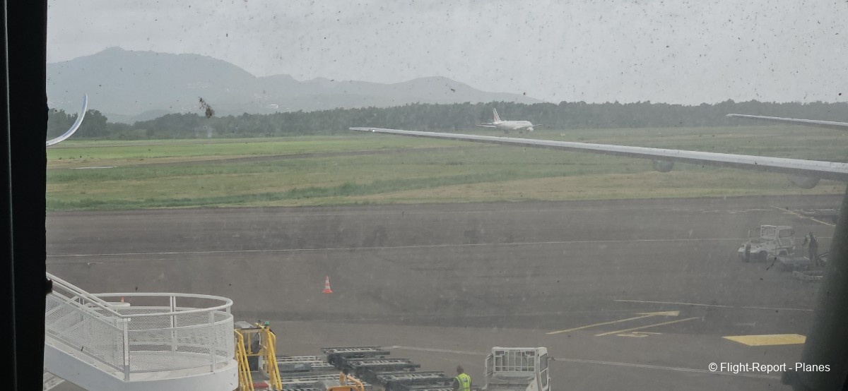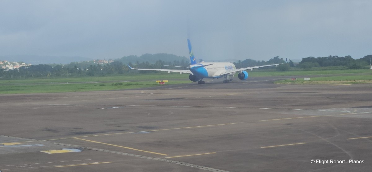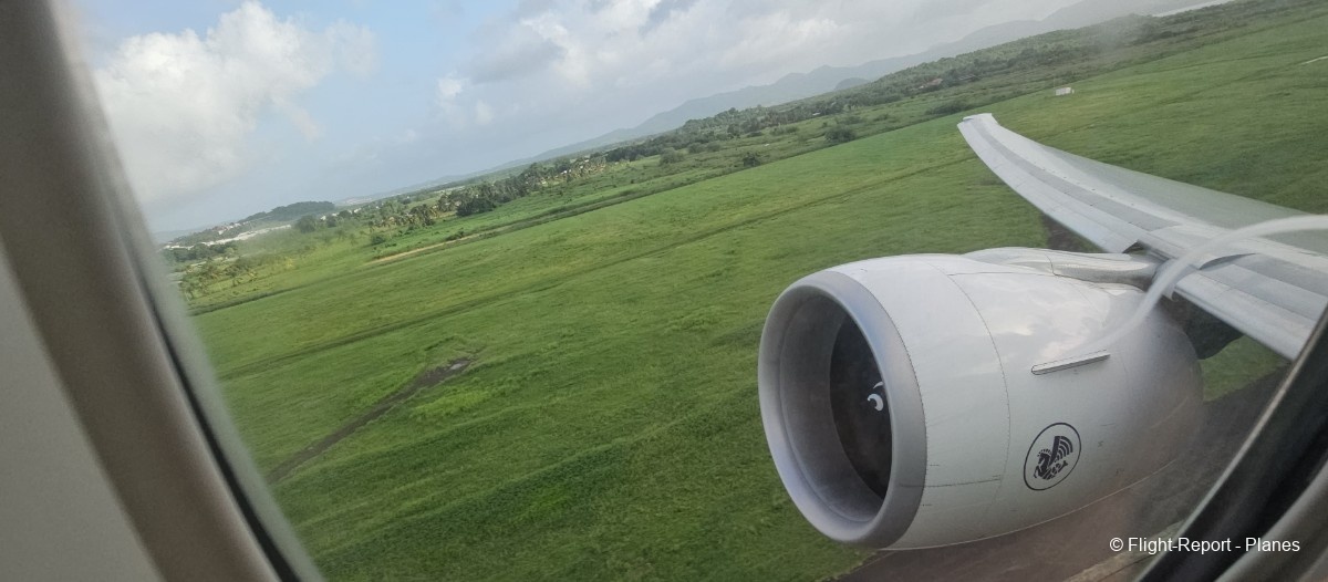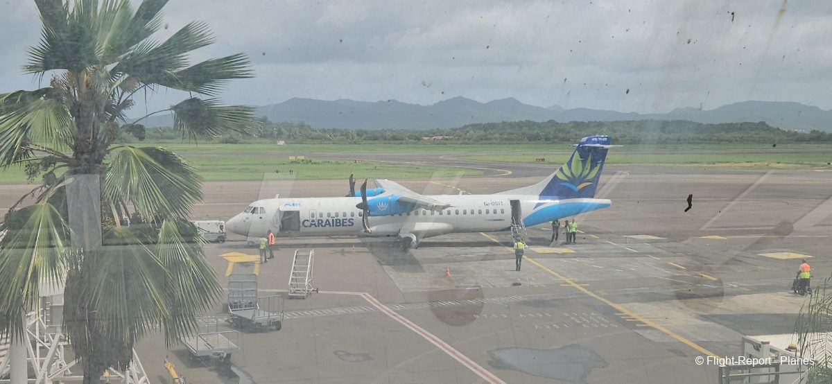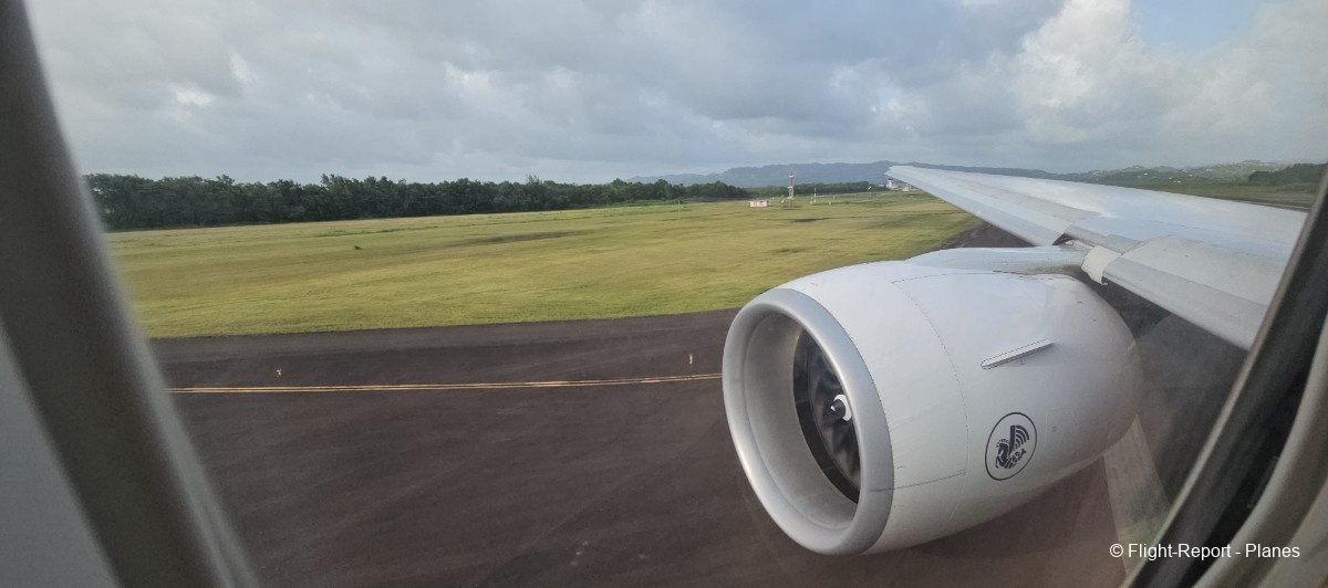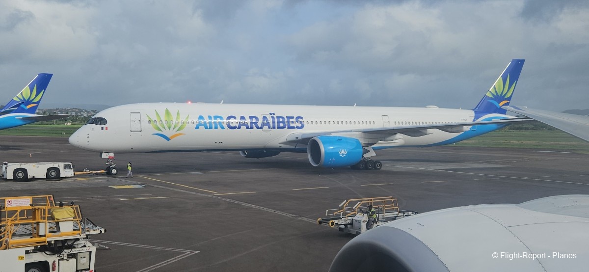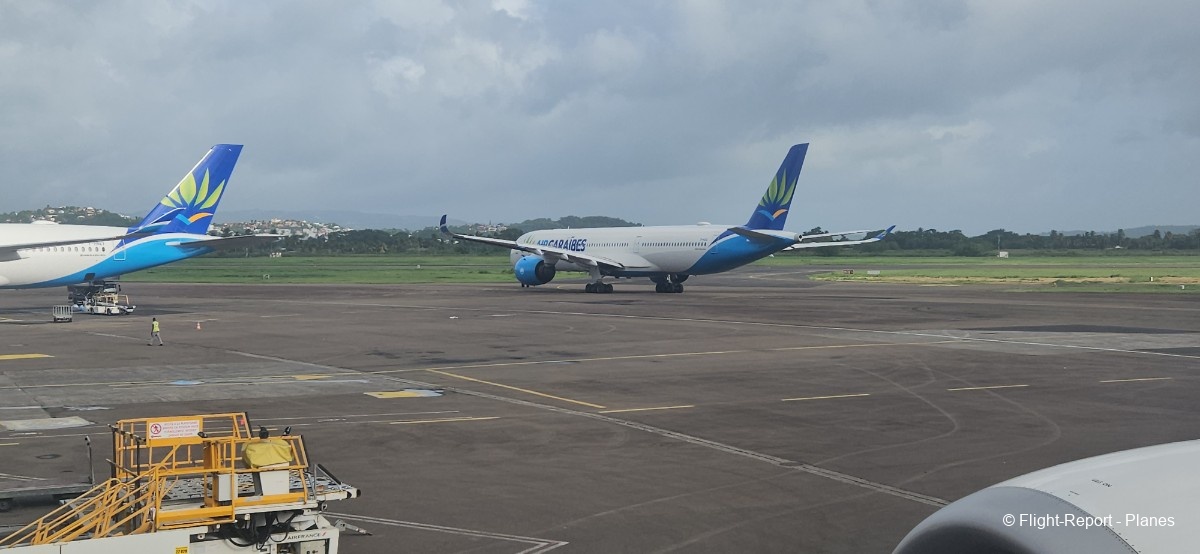 Je prends place au siège 14L, avec une superbe vue sur le moteur GE90. À 16h28, nous apercevons l’Airbus A350-1000 d’Air Caraïbes repousser pour son vol vers Paris-Orly, tandis qu’un ATR d’Air Antilles en provenance de Pointe-à-Pitre rejoint également le tarmac.