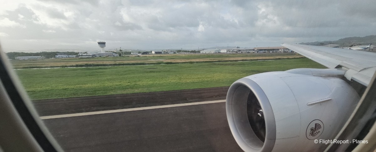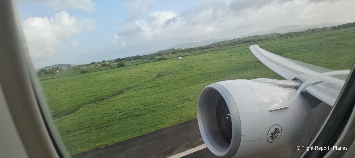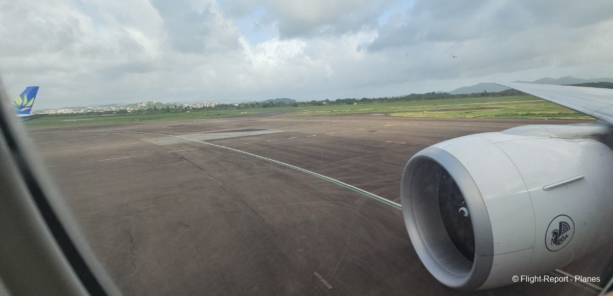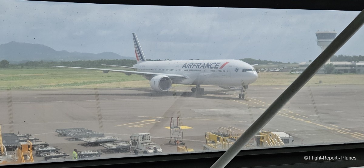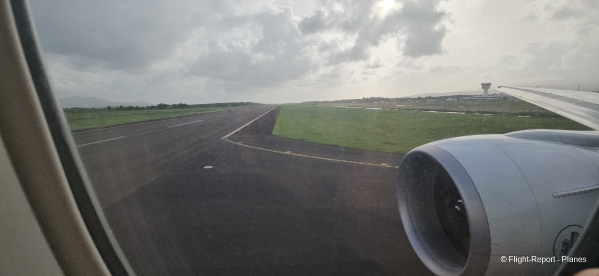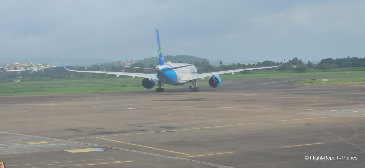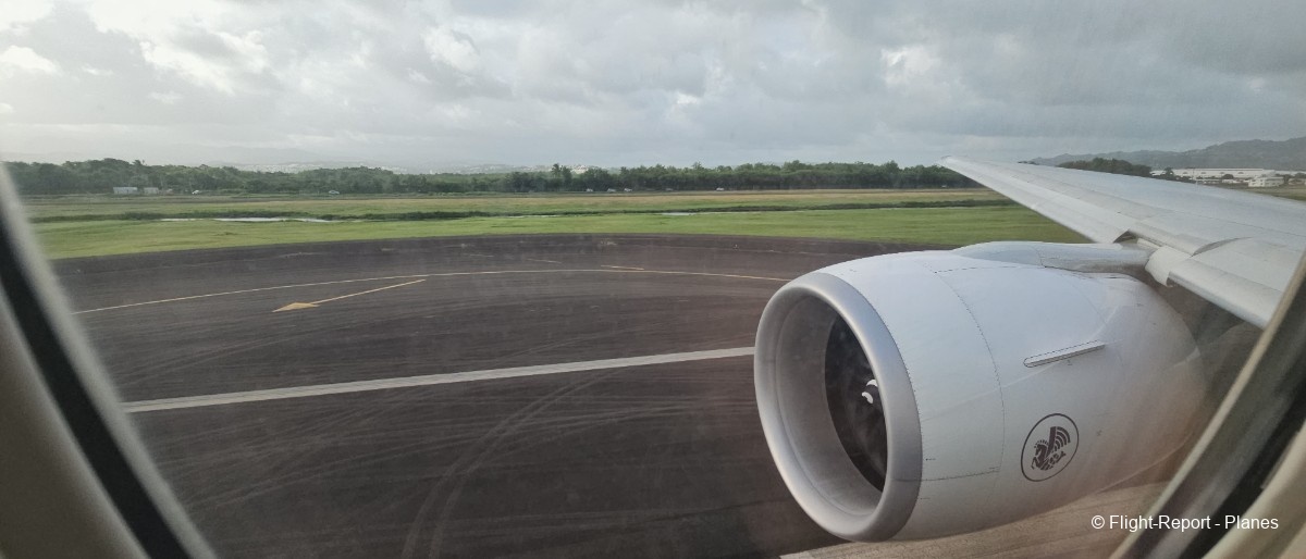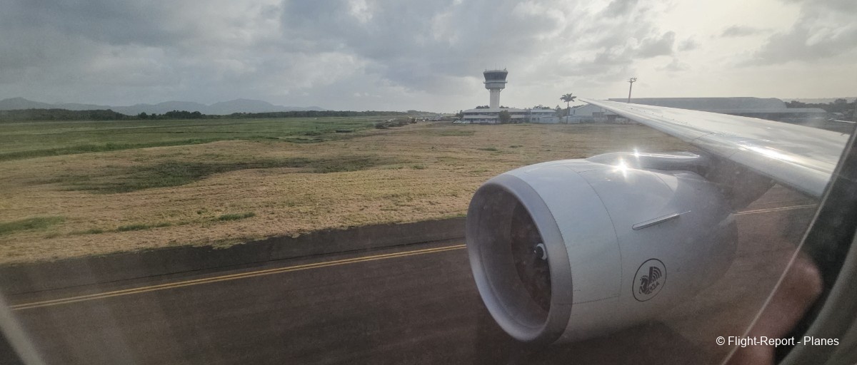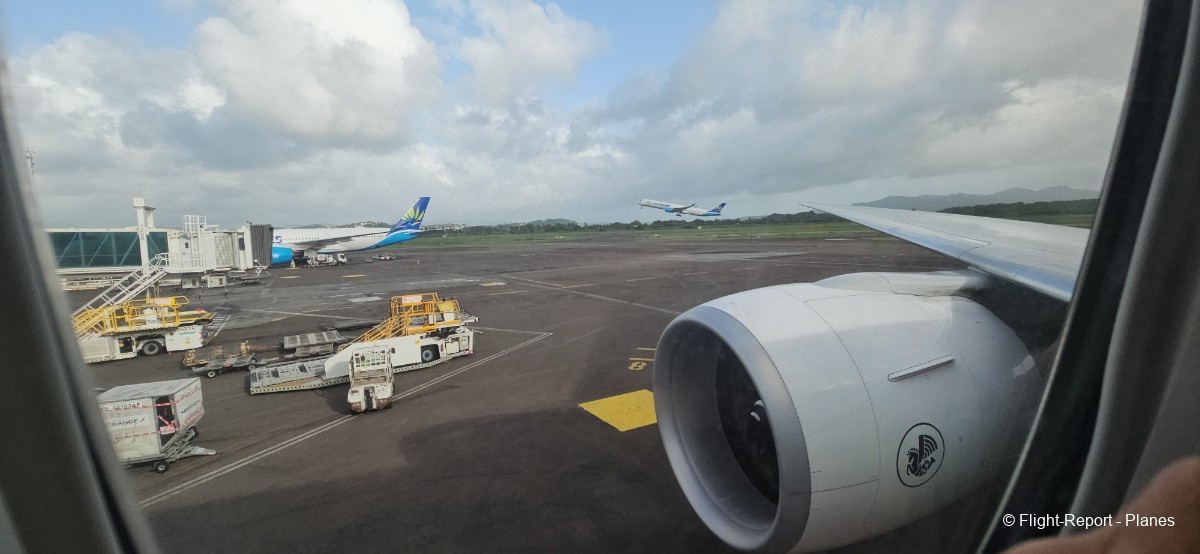 Je prends place au siège 14L, avec une superbe vue sur le moteur GE90. À 16h28, nous apercevons l’Airbus A350-1000 d’Air Caraïbes repousser pour son vol vers Paris-Orly, tandis qu’un ATR d’Air Antilles en provenance de Pointe-à-Pitre rejoint également le tarmac.