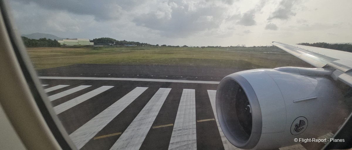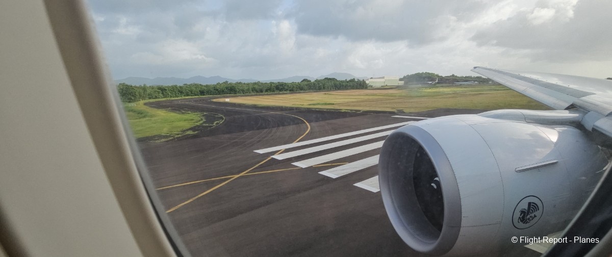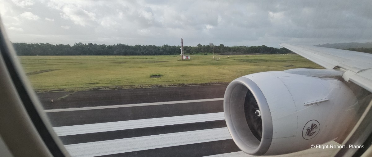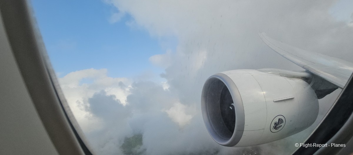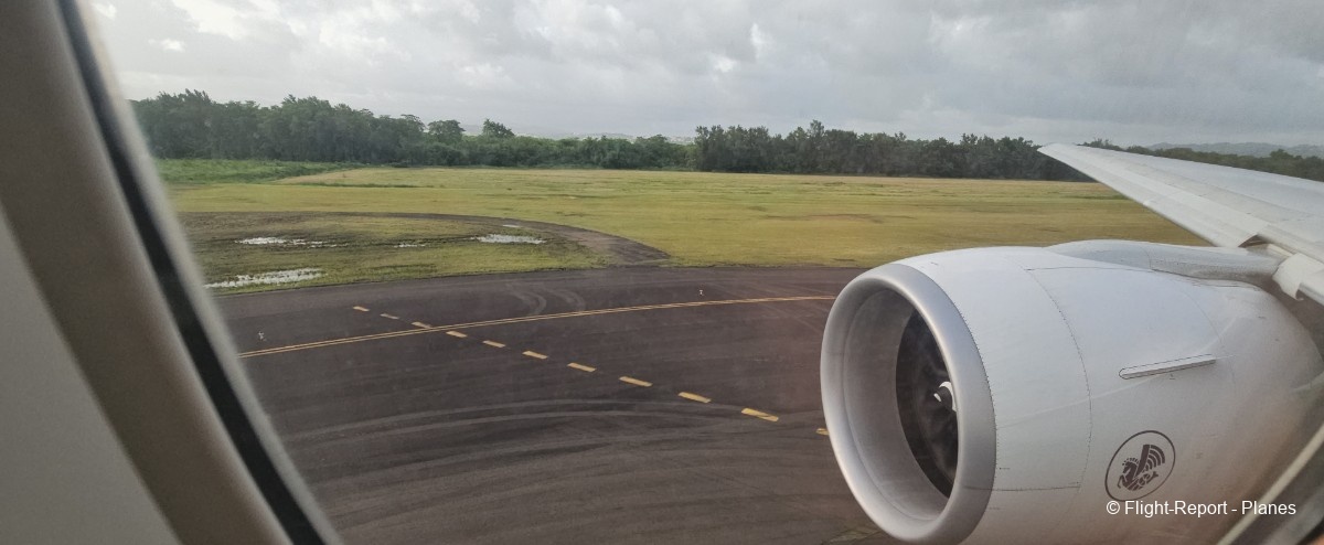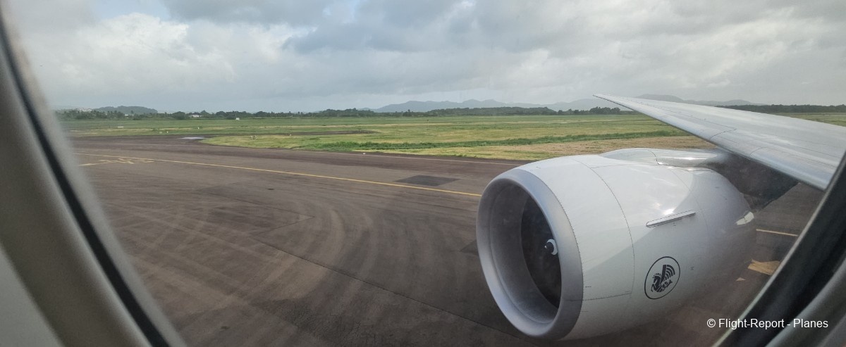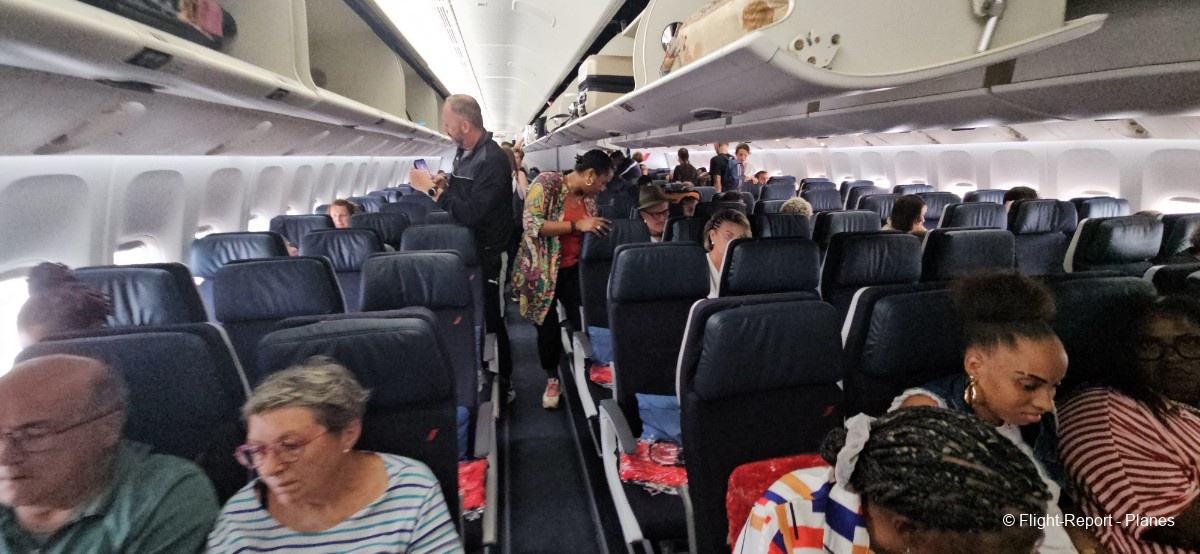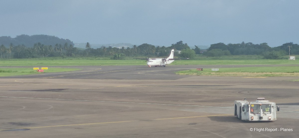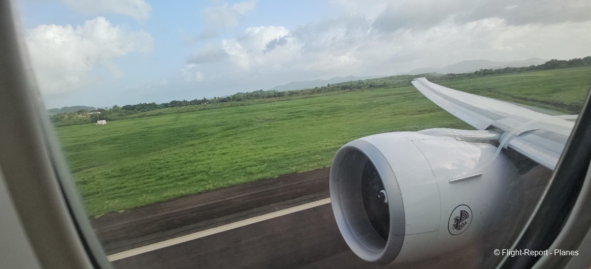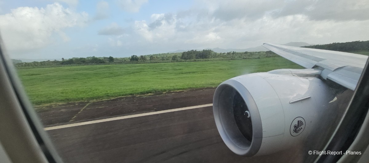 Je prends place au siège 14L, avec une superbe vue sur le moteur GE90. À 16h28, nous apercevons l’Airbus A350-1000 d’Air Caraïbes repousser pour son vol vers Paris-Orly, tandis qu’un ATR d’Air Antilles en provenance de Pointe-à-Pitre rejoint également le tarmac.