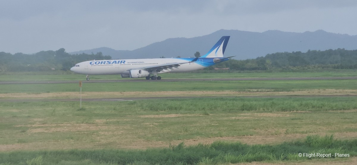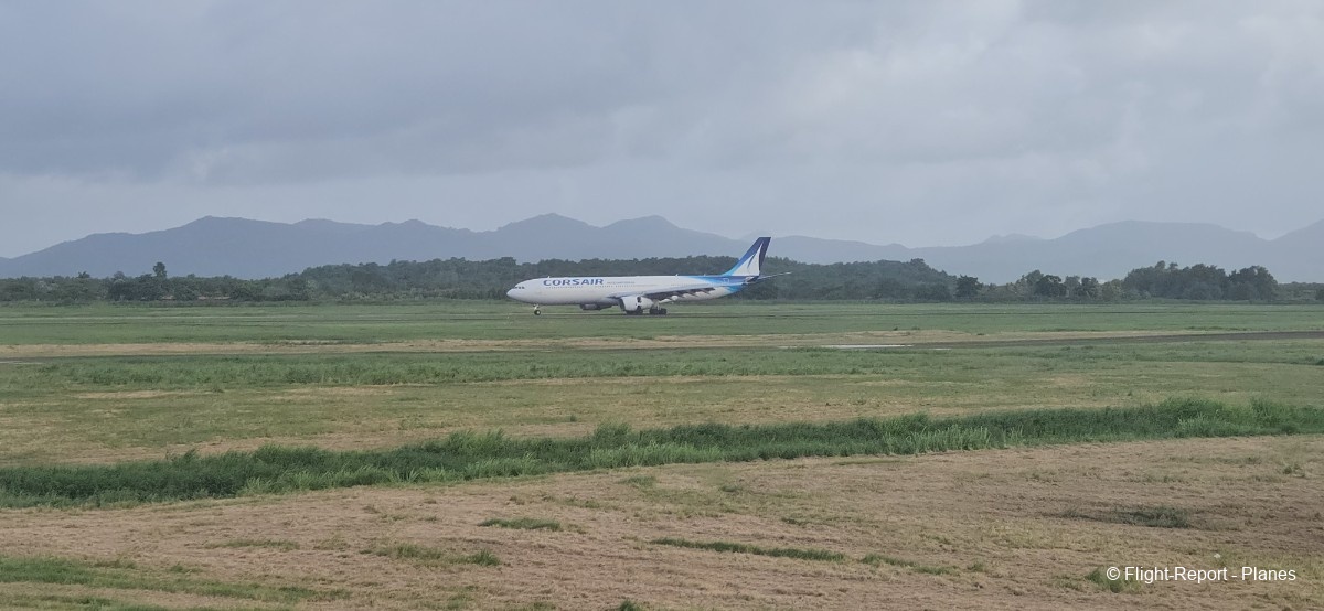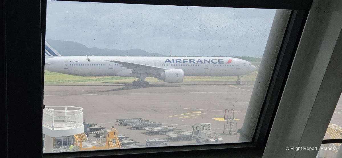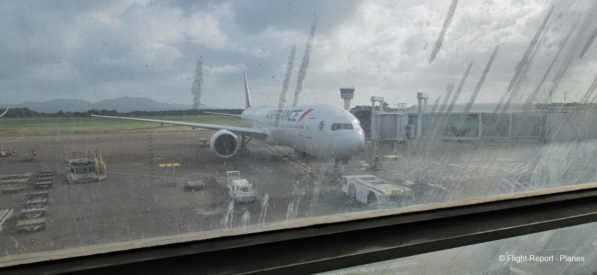 Le débarquement débute, en passant d’abord par la cabine Premium Economy, puis la Business. Depuis la passerelle, on admire encore notre imposant B777-300ER Air France, avec en arrière-plan un A330neo de Corsair fraîchement arrivé de La Réunion.
