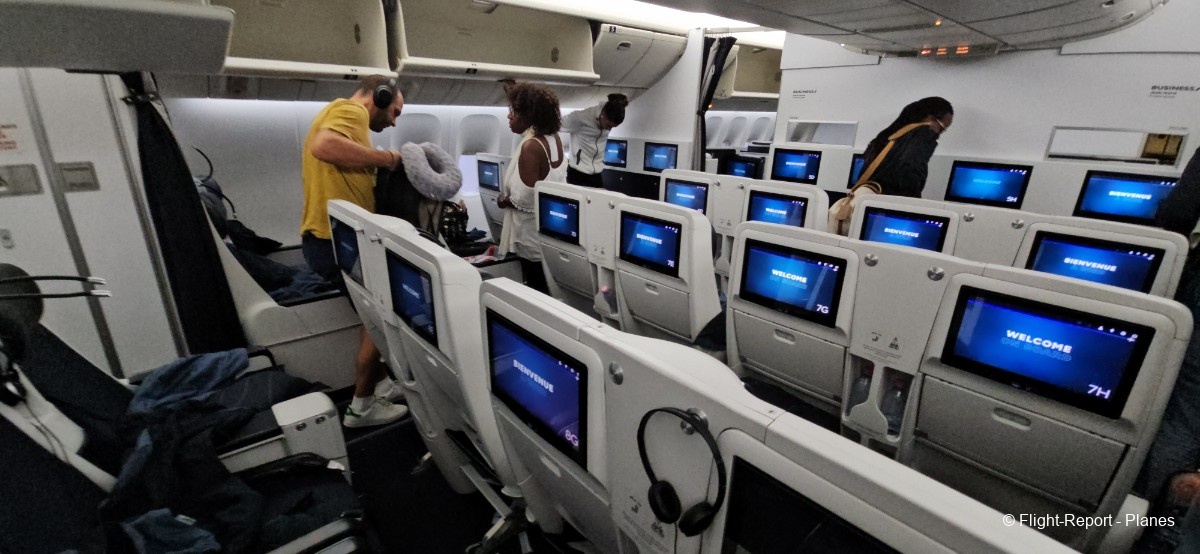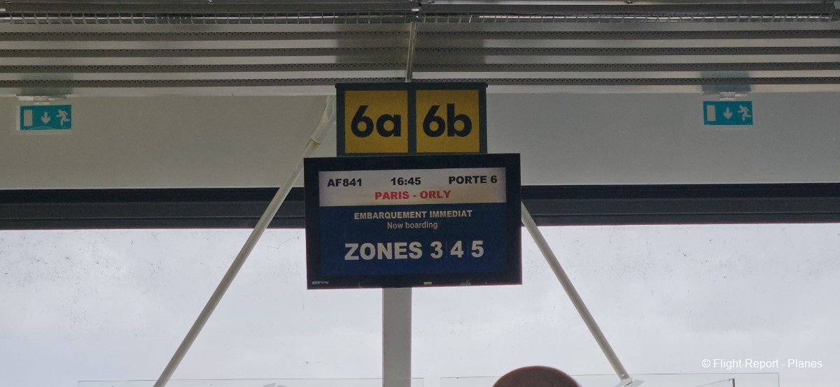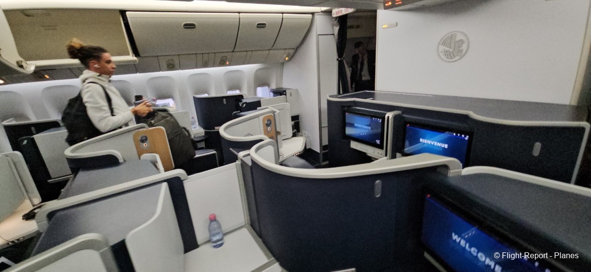 L’embarquement débute finalement à 16h13, soit avec 58 minutes de retard par rapport à l’horaire prévu. Pour rappel, le décollage était annoncé à 16h45. La procédure se fait par zones, au nombre de cinq, et étant dans la zone 5, je fais partie du dernier groupe à embarquer. L’attente depuis le passage des contrôles de sécurité commence à se faire longue, mais elle est compensée par la belle vue qu’offre la passerelle sur notre appareil du jour : un Boeing 777-300ER immatriculé F-GZNG, baptisé Belfort.