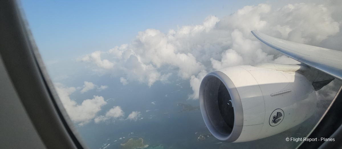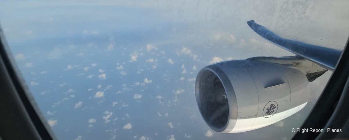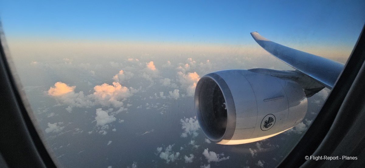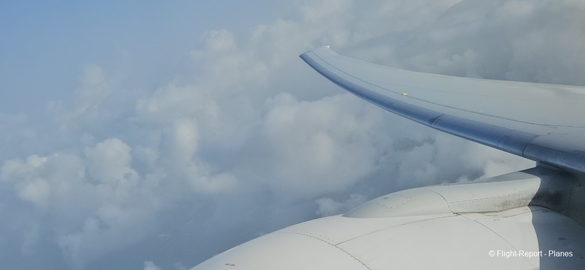 Peu après, le commandant de bord prend la parole : 399 passagers sont à bord, accompagnés de 12 membres d’équipage. La durée de vol est estimée à 7h55, avec des turbulences prévues environ 5 heures après le décollage, pour une trentaine de minutes. L’arrivée à Orly est annoncée sous un ciel nuageux et brumeux, avec une température de 23°C. Quelques minutes plus tard, depuis mon hublot, je peux observer le décollage du majestueux A350-1000 d’Air Caraïbes.
