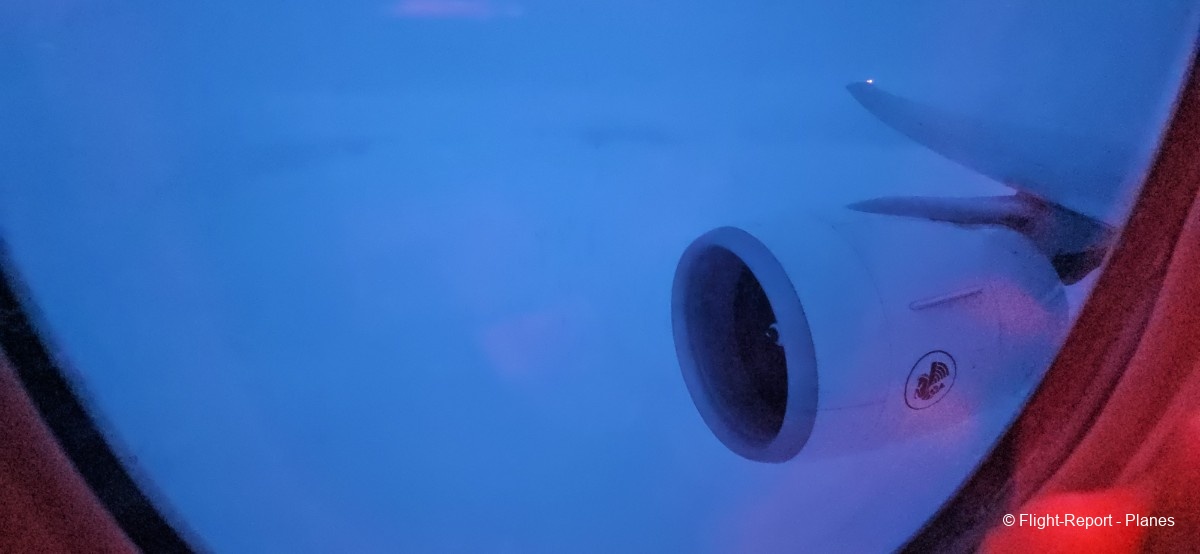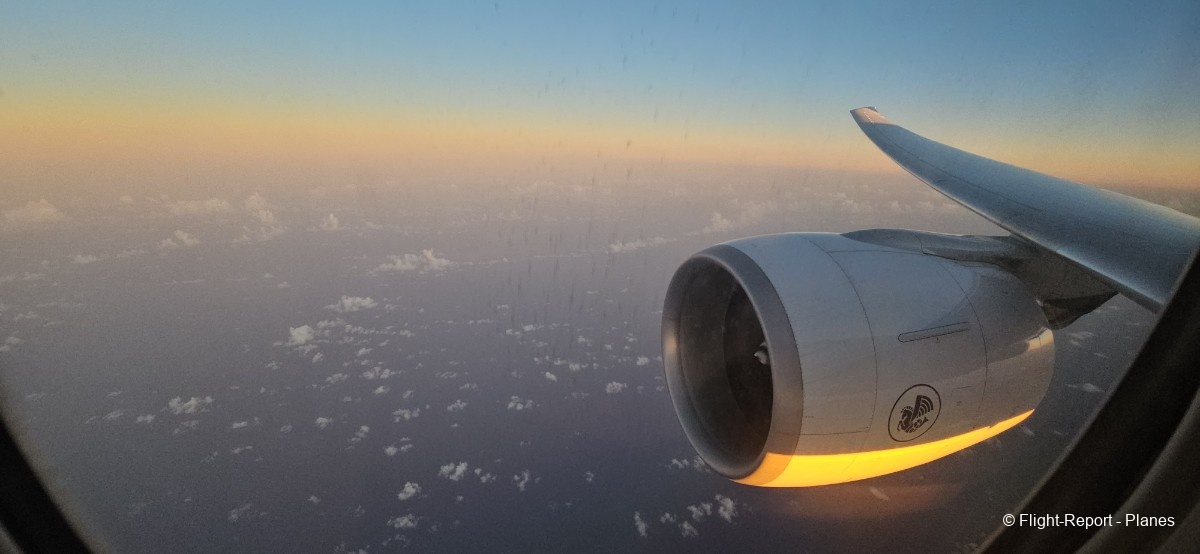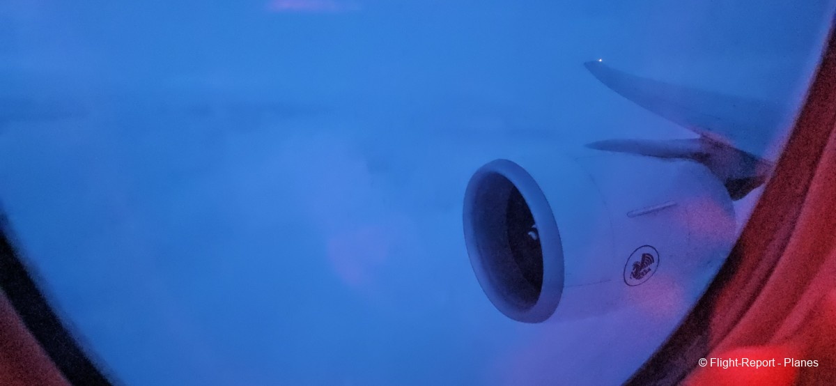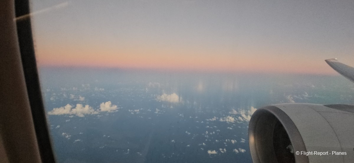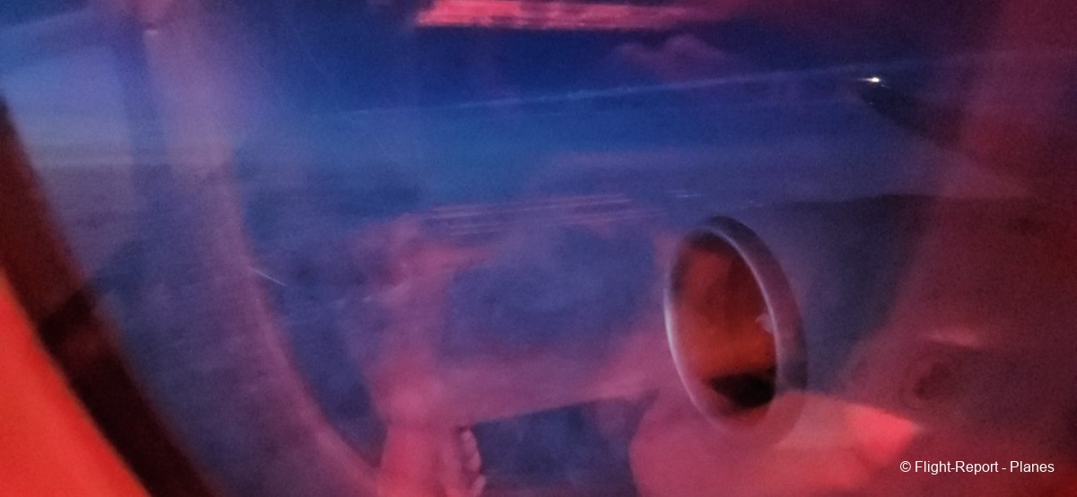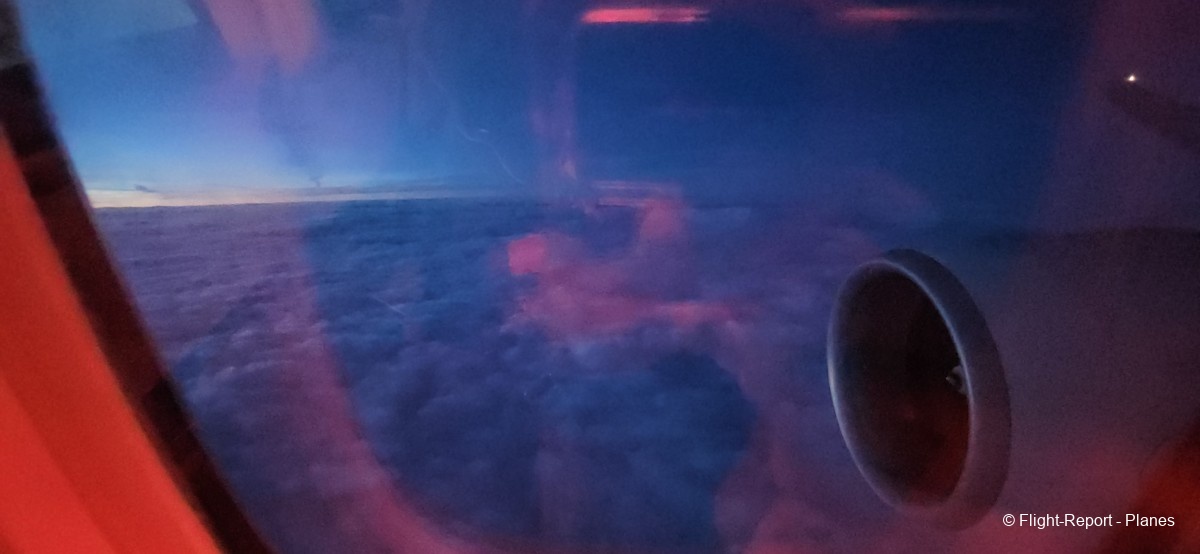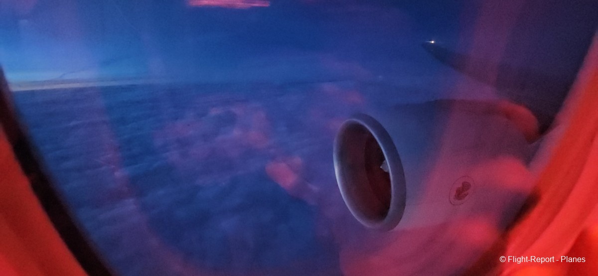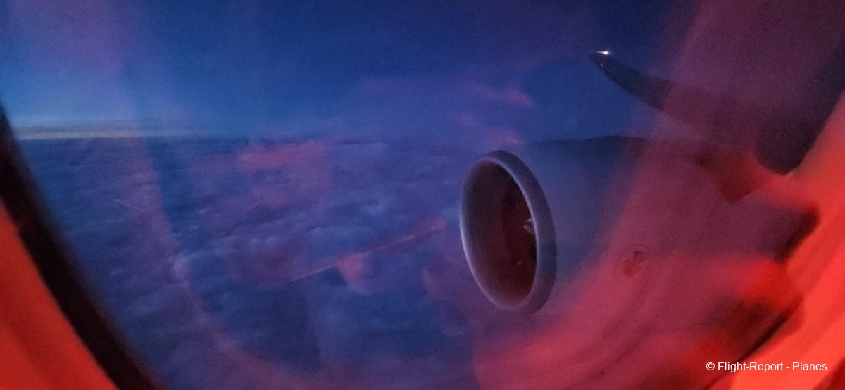 Le soleil commence à se coucher peu à peu, offrant de magnifiques couleurs à travers les hublots. Puis la nuit tombe et les lumières de la cabine s’éteignent. Nous filons désormais à 511 kts (946 km/h), avec encore 4h58 de vol.