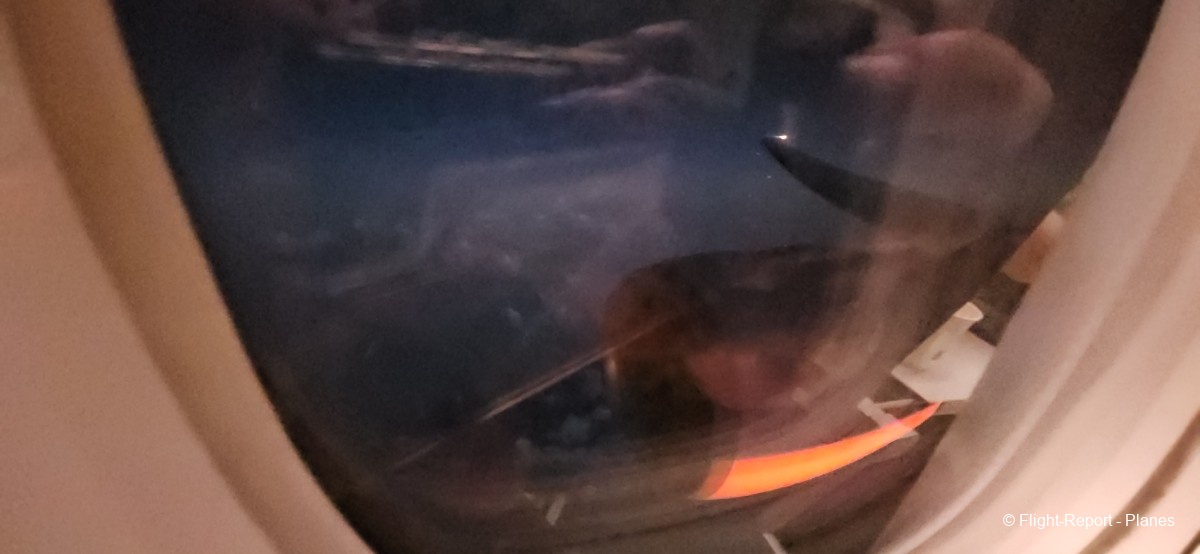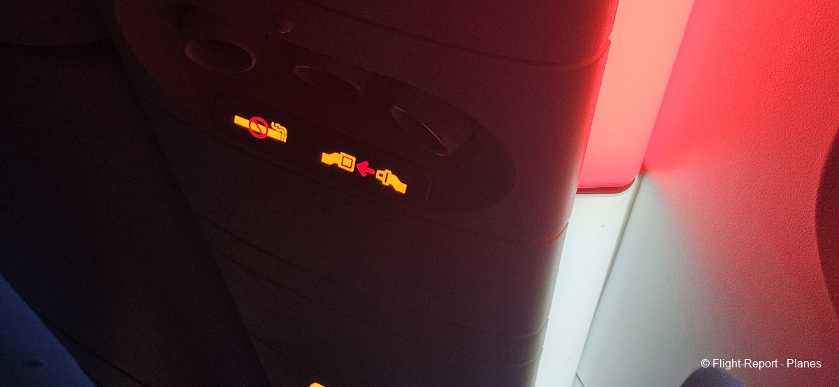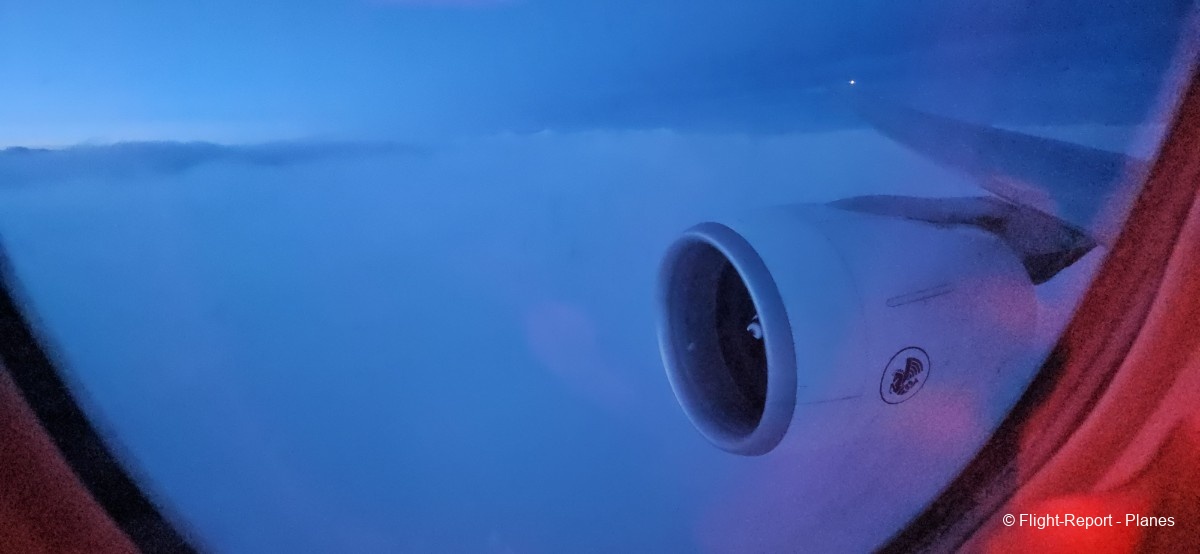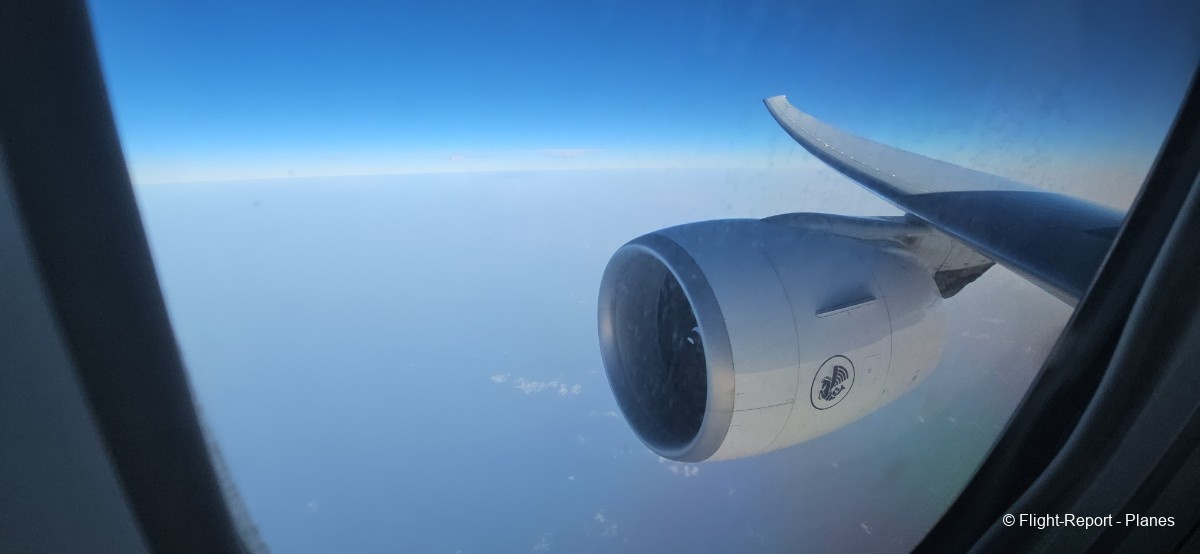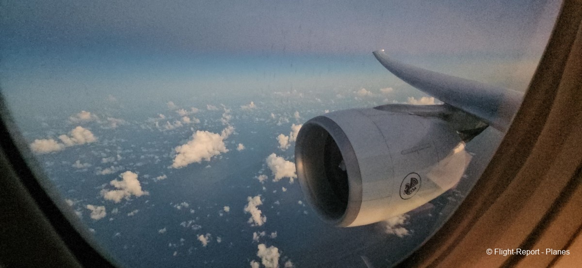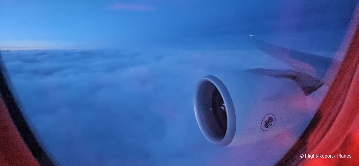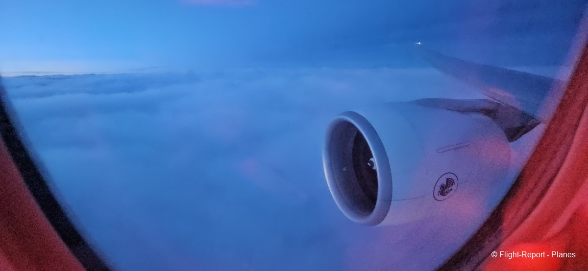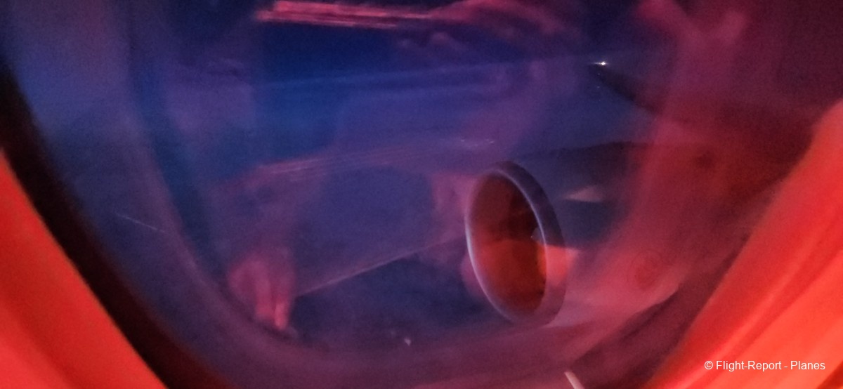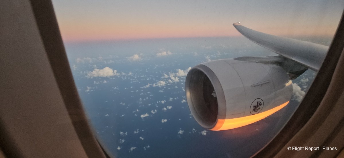 Le soleil commence à se coucher peu à peu, offrant de magnifiques couleurs à travers les hublots. Puis la nuit tombe et les lumières de la cabine s’éteignent. Nous filons désormais à 511 kts (946 km/h), avec encore 4h58 de vol.