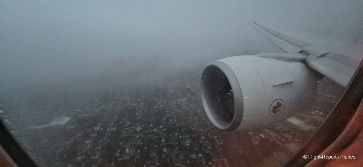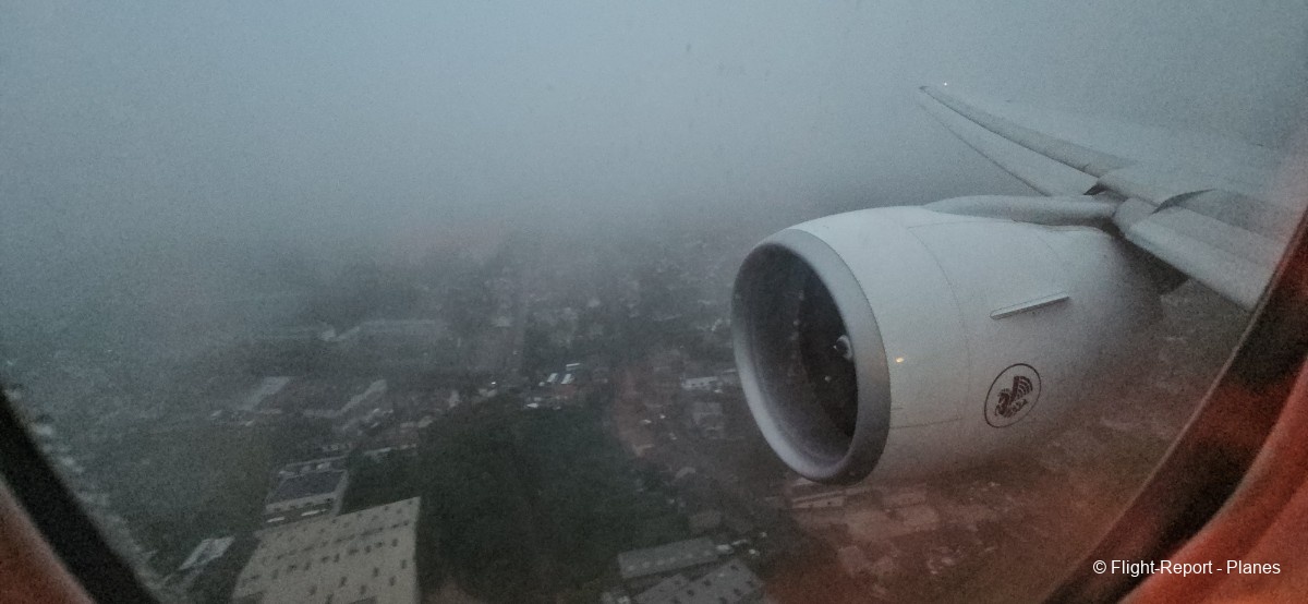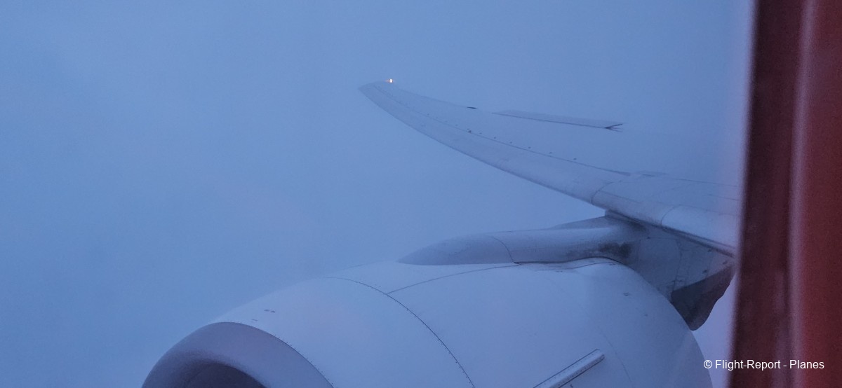 Nous traversons une première couche nuageuse, puis une deuxième. À 10 000 ft, le signal lumineux de la ceinture de sécurité s’allume et les aérofreins sont déployés pour réduire la vitesse. Une troisième couche nuageuse suit, rendant l’approche particulièrement "opaque".