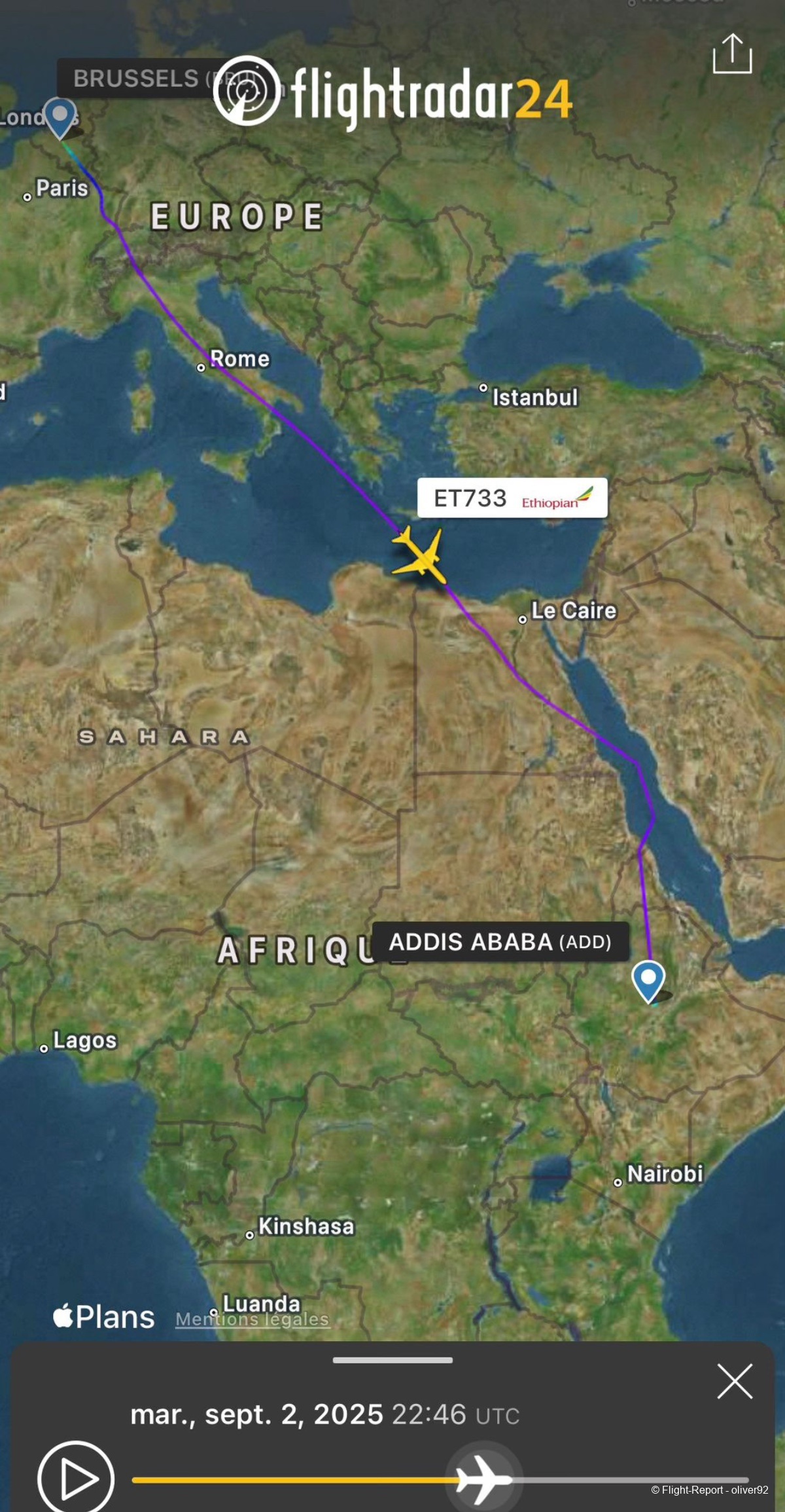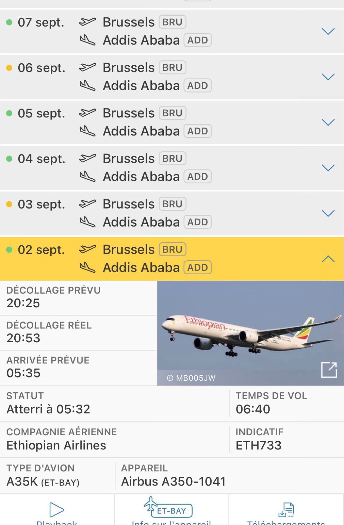 C'est l'occasion de tester l'Airbus A350 sur cette ligne quotidienne BRU-ADD et cerise sur le gâteau je m’aperçois la veille sur FR24 que je voyagerais avec la version-1000, un appareil récemment arrivé au sein d'Ethiopian airlines fin 2024 et qui est déployé très rarement sur BRU (6 ème fois depuis le début de l'année et dernière fois le 27 mai), autant vous dire que la chance est avec moi.