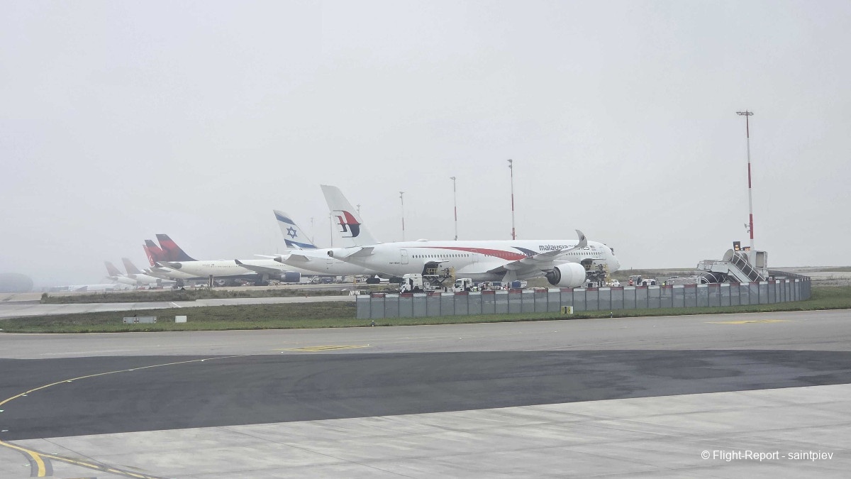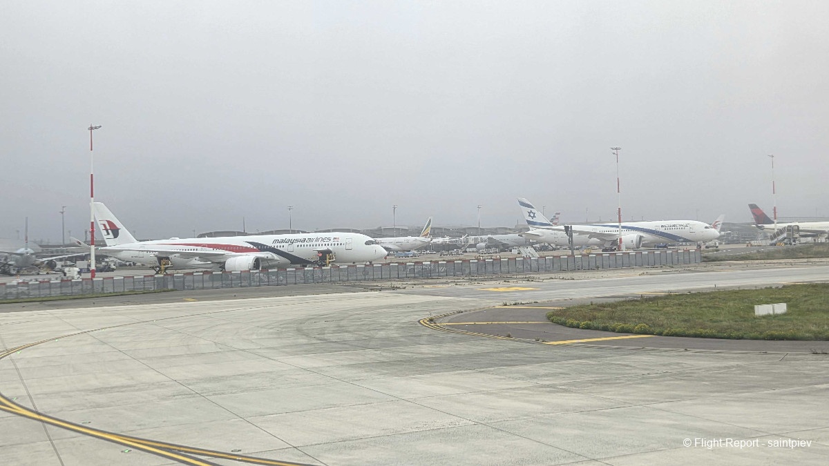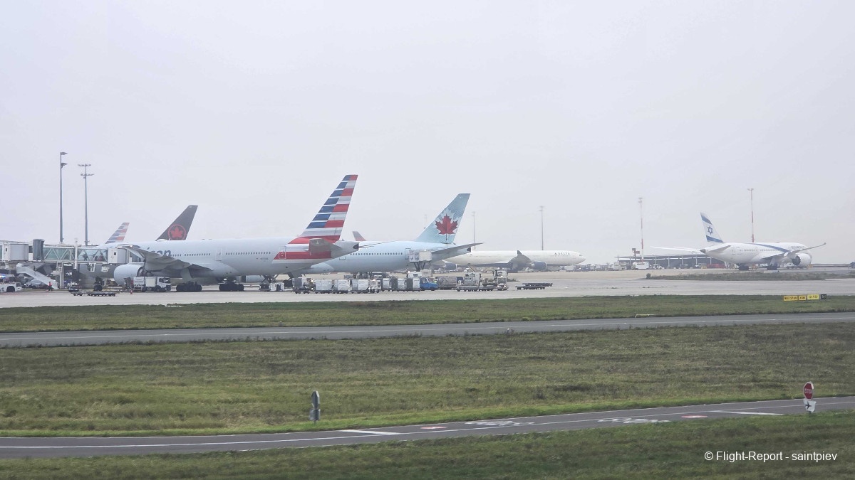 Embarquement terminé (nous ne serons que 2 sur le triplet) ; ça aura pris du temps. De plus, le CDB nous annonce un grand retard au départ suite au brouillard sur CDG, bien qu'il a tendance à se lever. Puis un nouveau retard est annoncé. Au final nous repoussons avec 1h de retard.