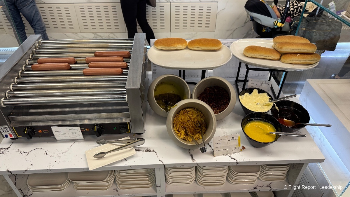 La large zone de restauration, il y a beaucoup de choix avec des plats chauds et des alcools forts qui arrivent un peu avant midi.