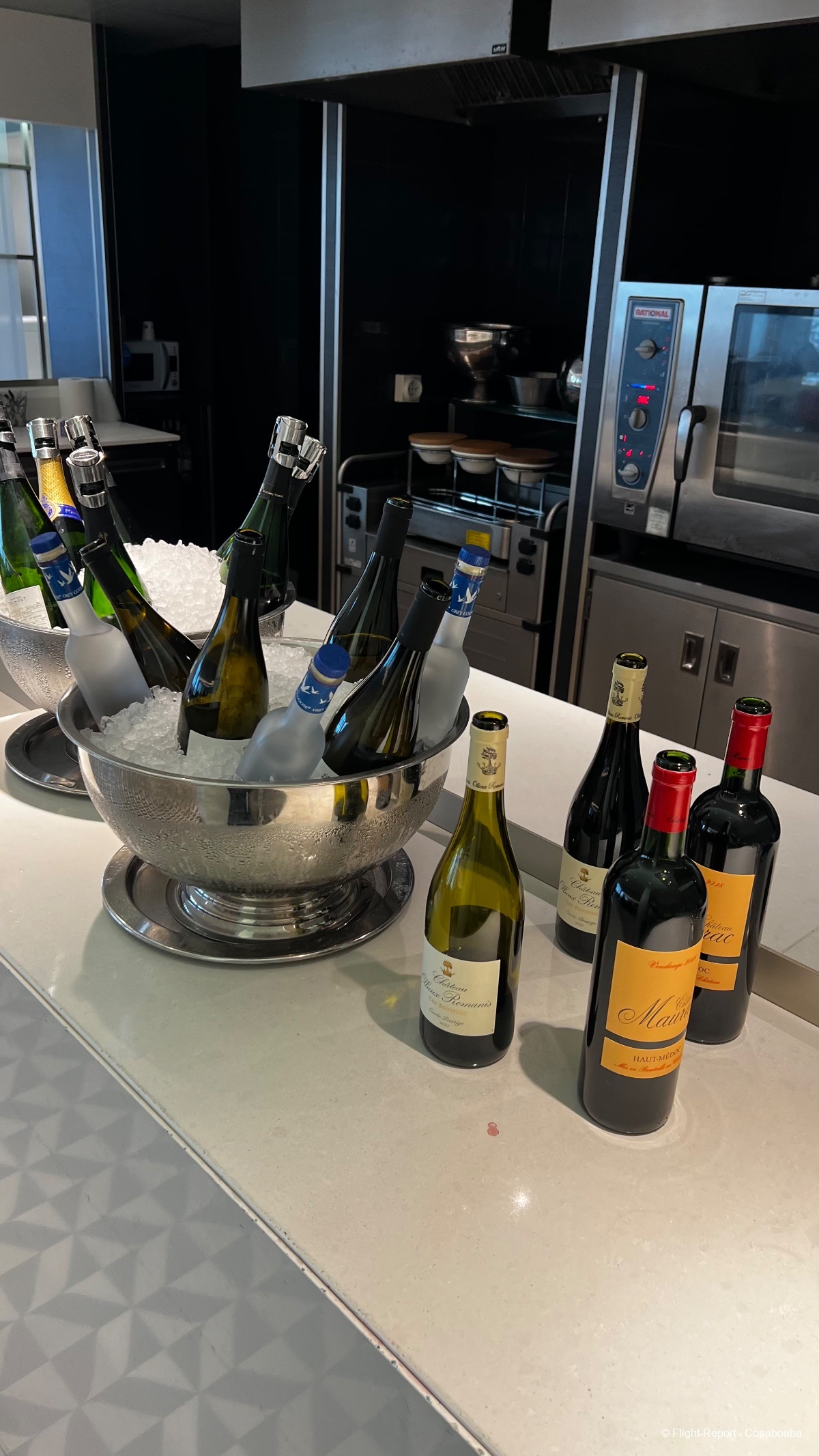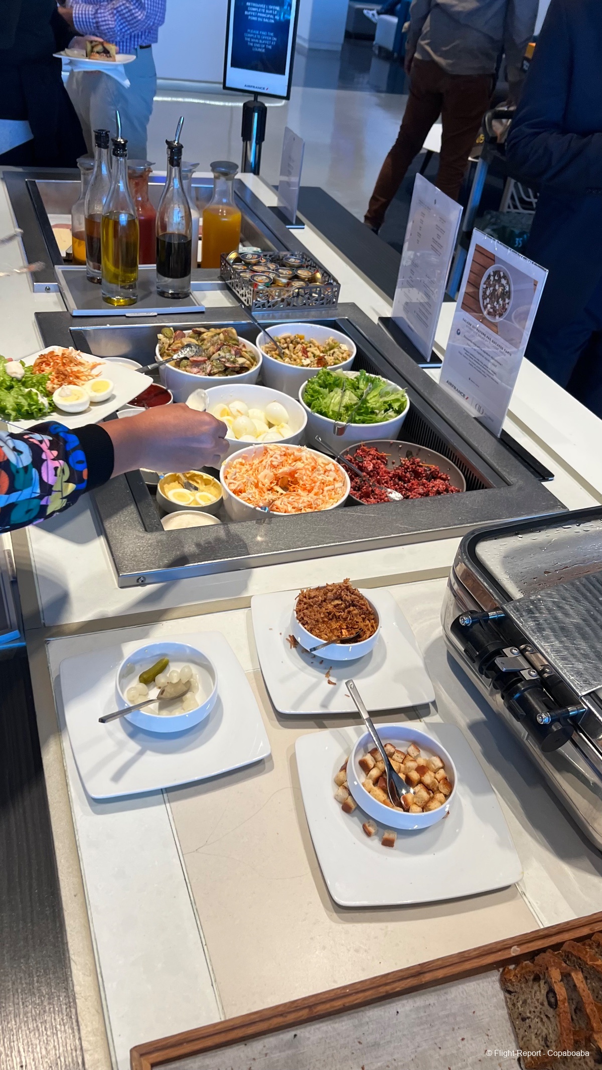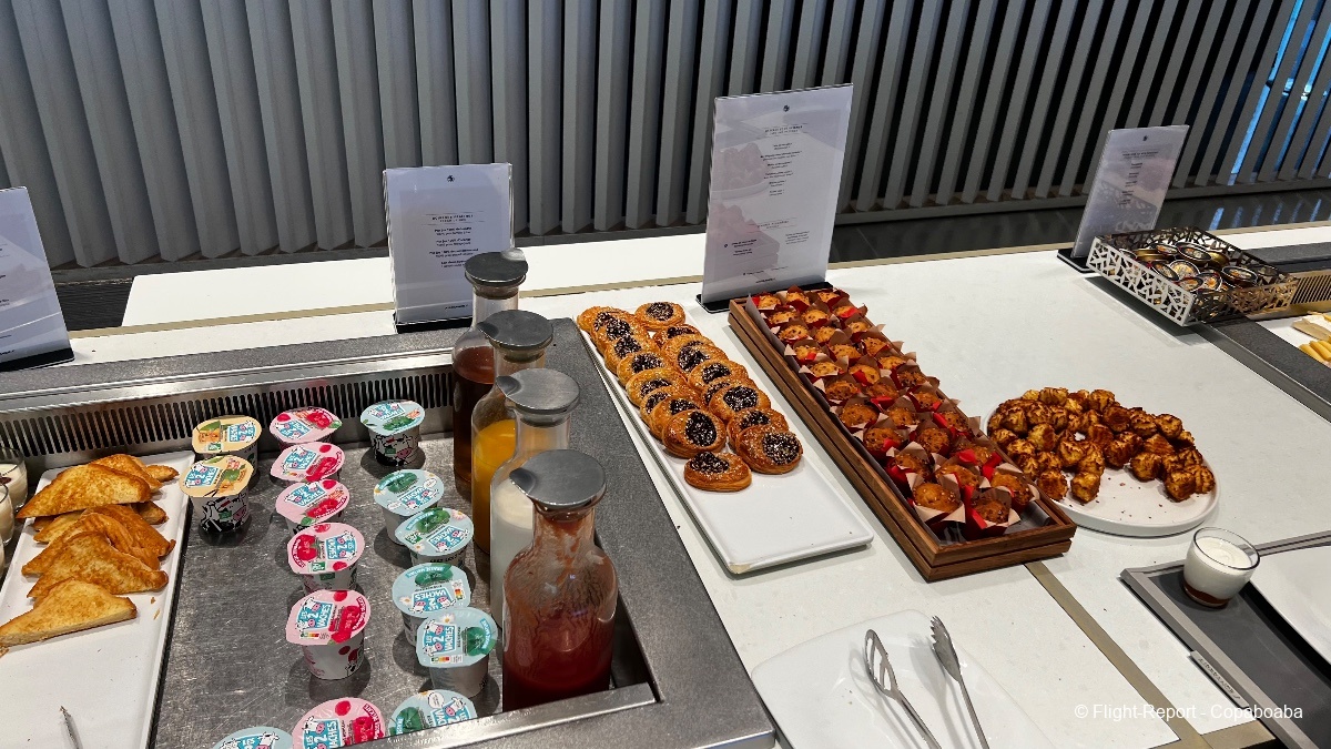 Et deuxième espace avec un chef qui prépare à la demande un plat que l'on retrouvera comme option du déjeuner léger avant l'atterrissage sur notre vol : coquillettes aux champignons et comté