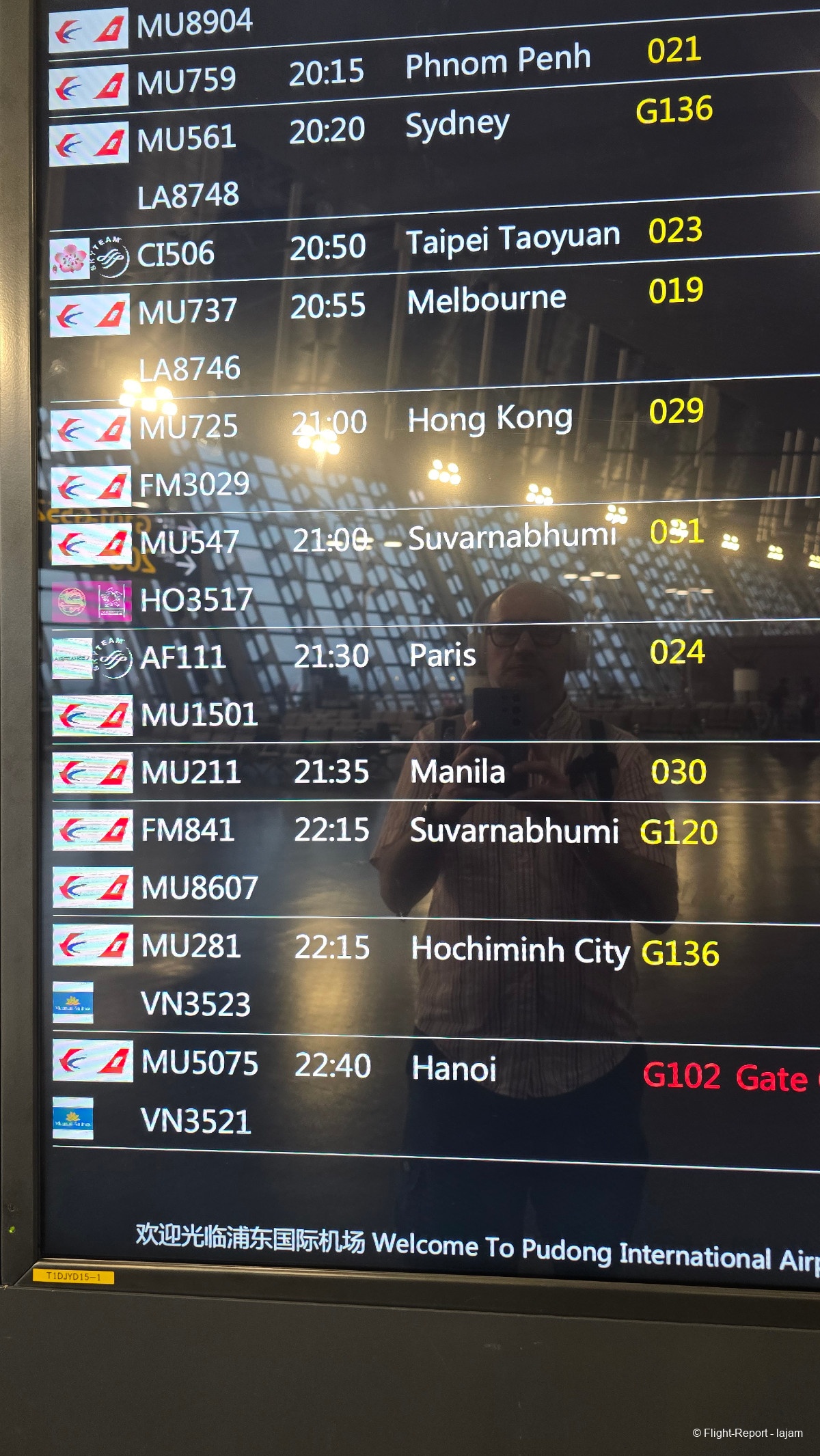 Après une semaine de travail à Hangzhou, retour pour la France. J'avais pris Xiamen Airlines à l'aller mais pour des raisons de logistique, je reviens par Shanghai avec Air France. Donc je dois trouver une solution pour faire le trajet entre Hangzhou et l'aéroport de Shanghai-Pudong. Je décide de prendre un bus qui part en début d'après-midi du centre de Hangzhou. 3h de bus. Faut faire confiance au conducteur. Un peu sport et le chauffeur n'était pas très patient. Mais 3h de bus un vendredi après-midi, ce n'est pas pire. Et ce n'est quasiment que de l'autoroute tout le long, même si les paysages ne sont pas totalement mémorables. Mais c'est bon à savoir pour la prochaine fois.