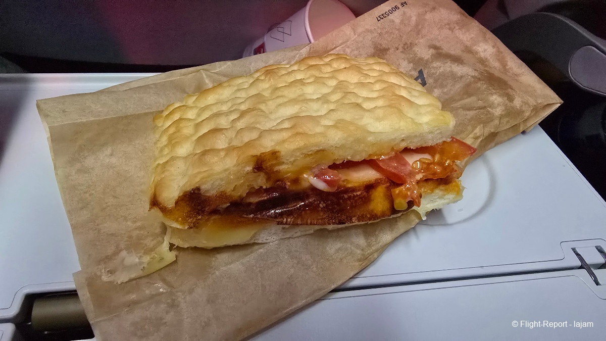 Les lumières sont allumés 1h35 avant l’atterrissage. Le petit déjeuner est servi, dans cette fameuse boîte, où tu mets des miettes partout !!!