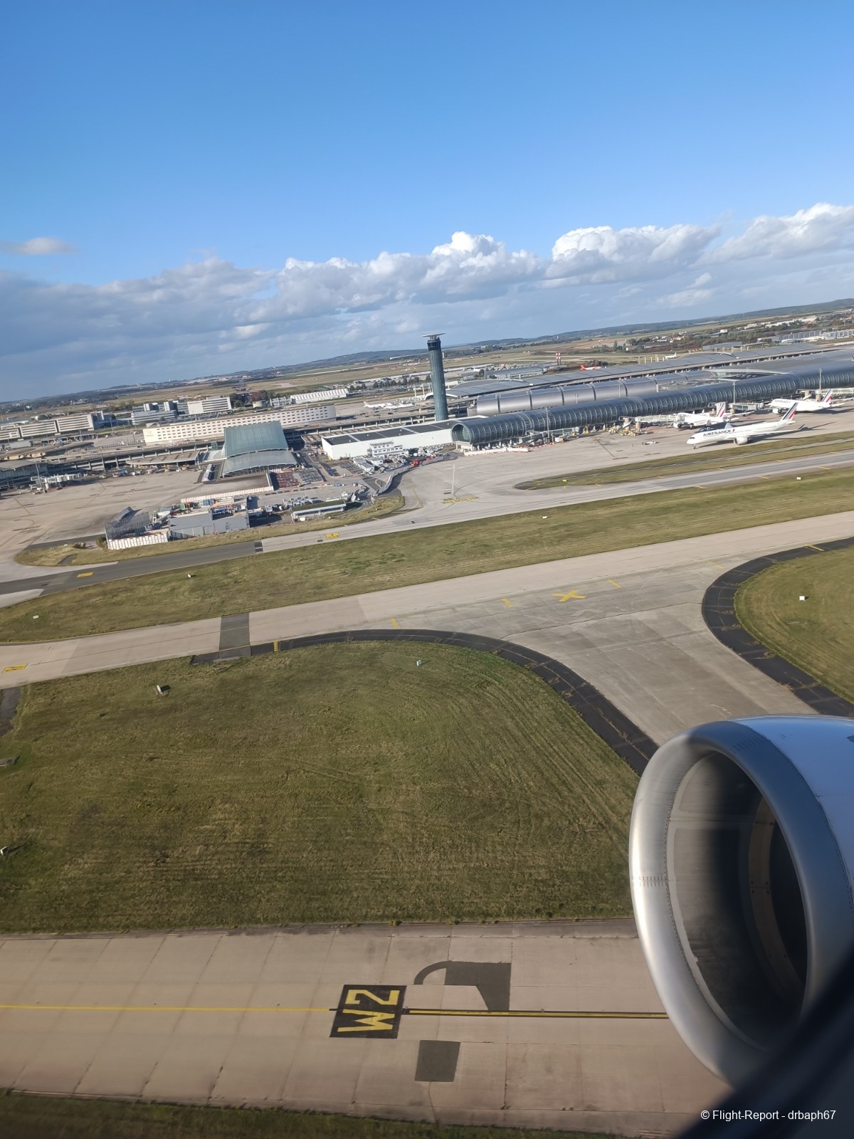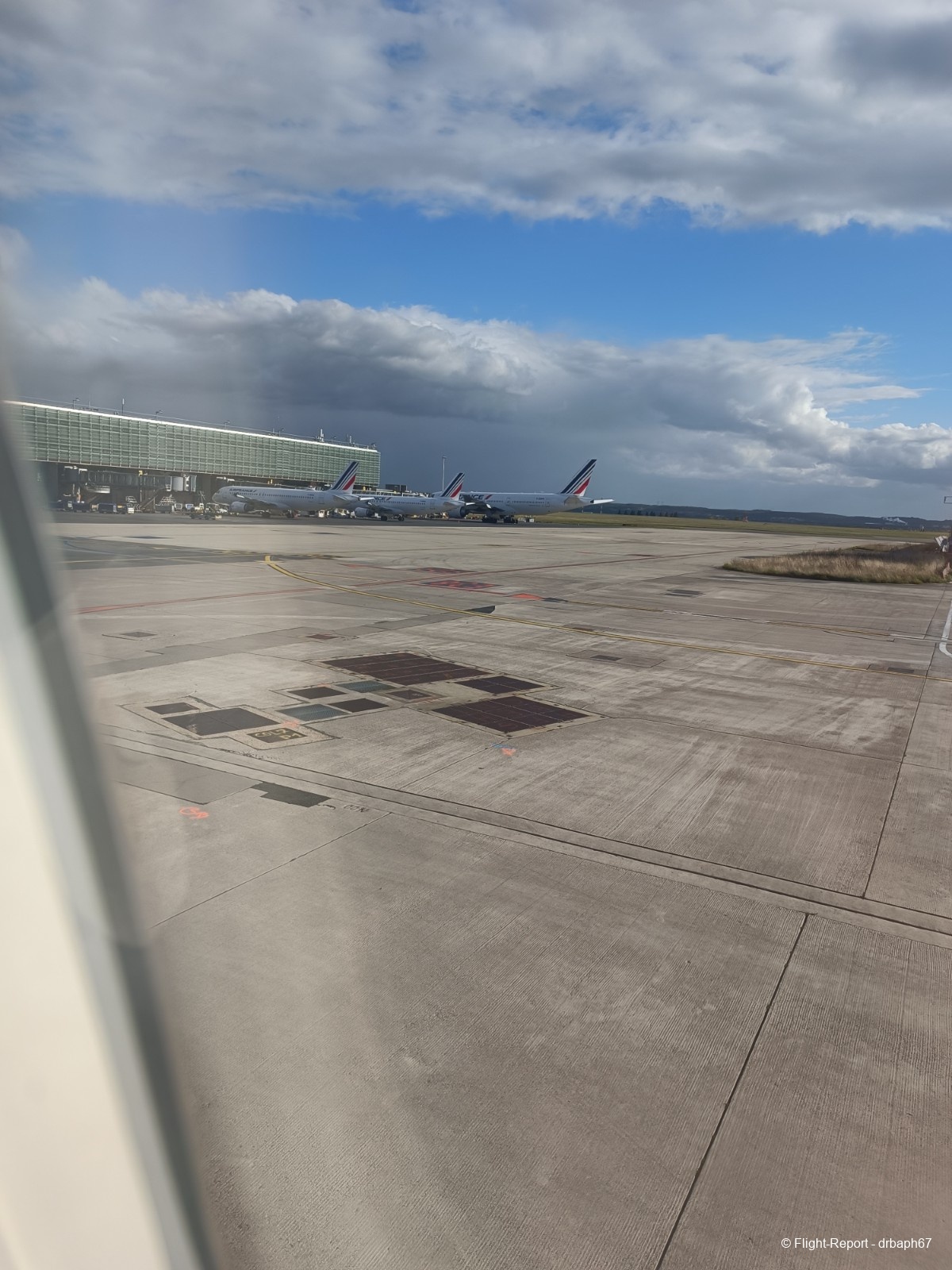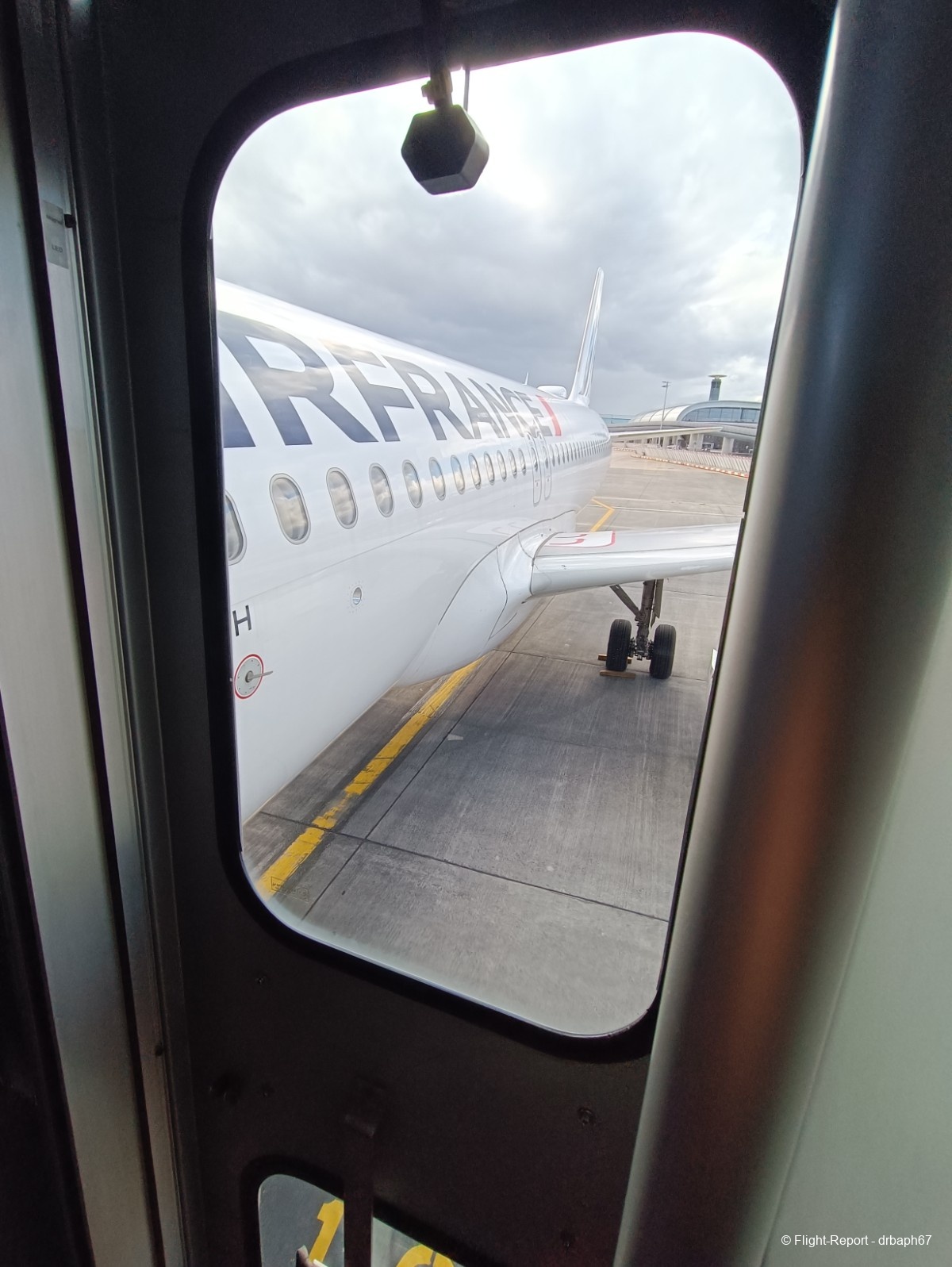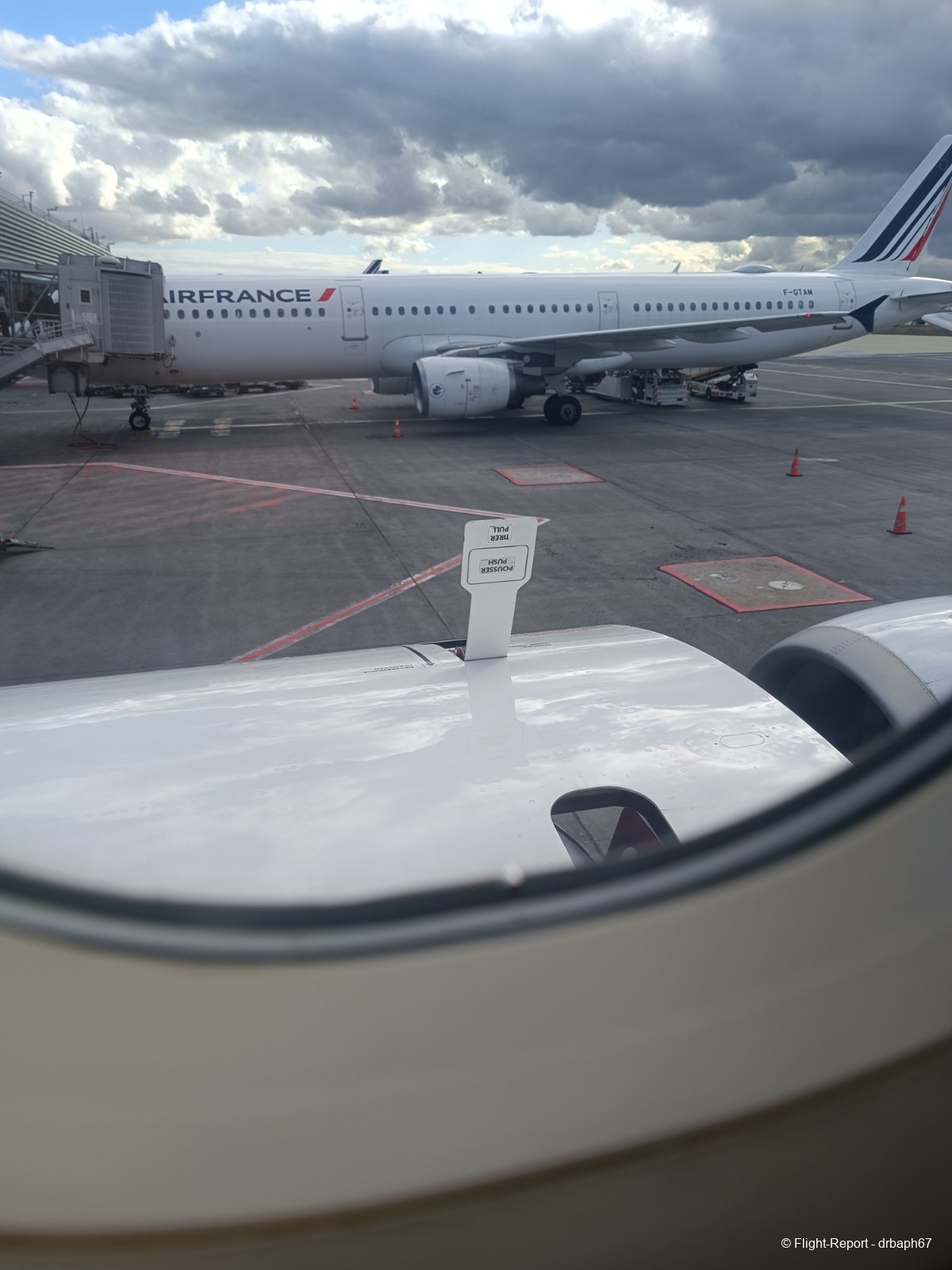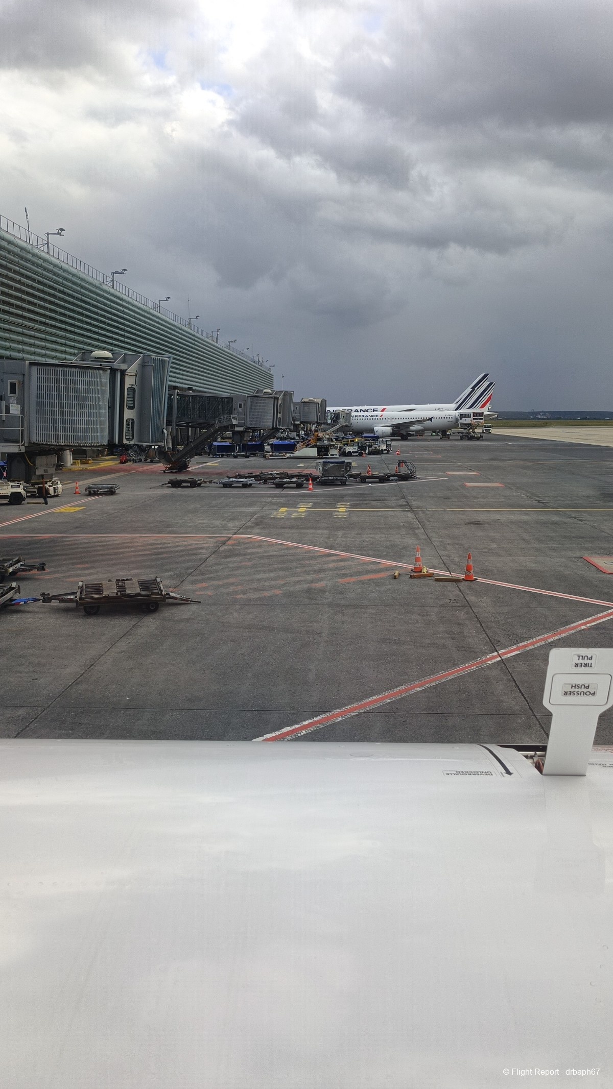 Nous quitterons la porte d'embarquement avec 38 min de retard. J'utiliserai le temps assis à mon siège pour un peu de plane spoting. Les avions Air France dont je verrai l'immatriculation partiront pour Munich, Budapest ou San Salvador. Nous roulons enfin puis décollons.