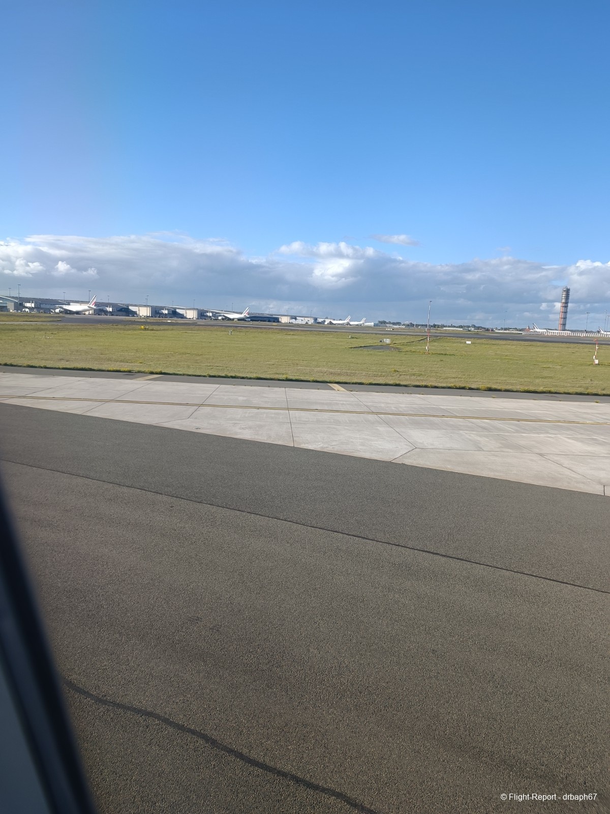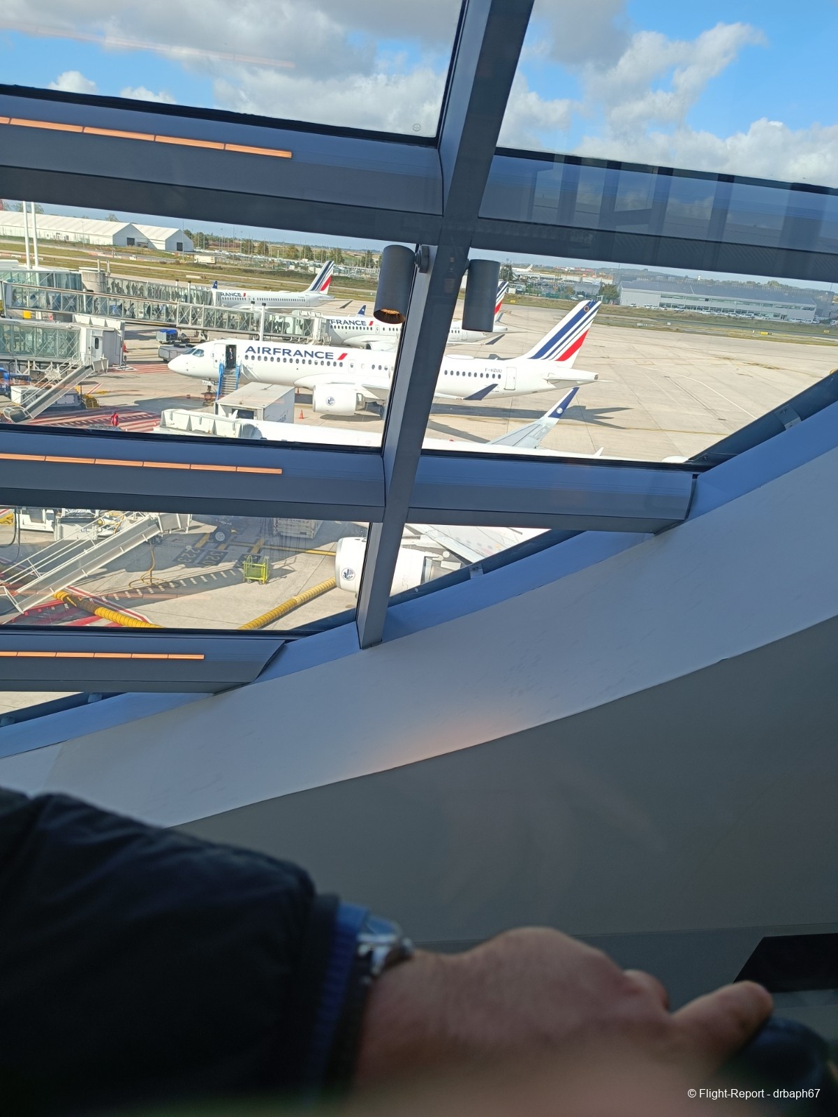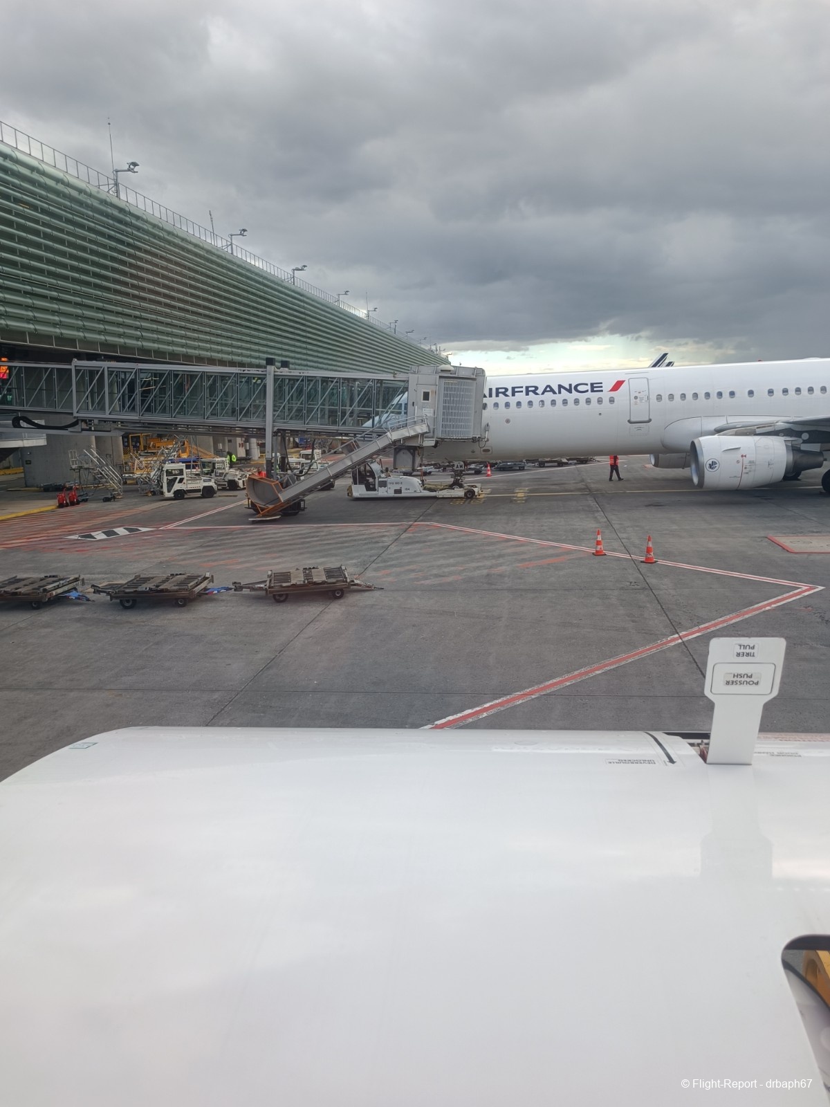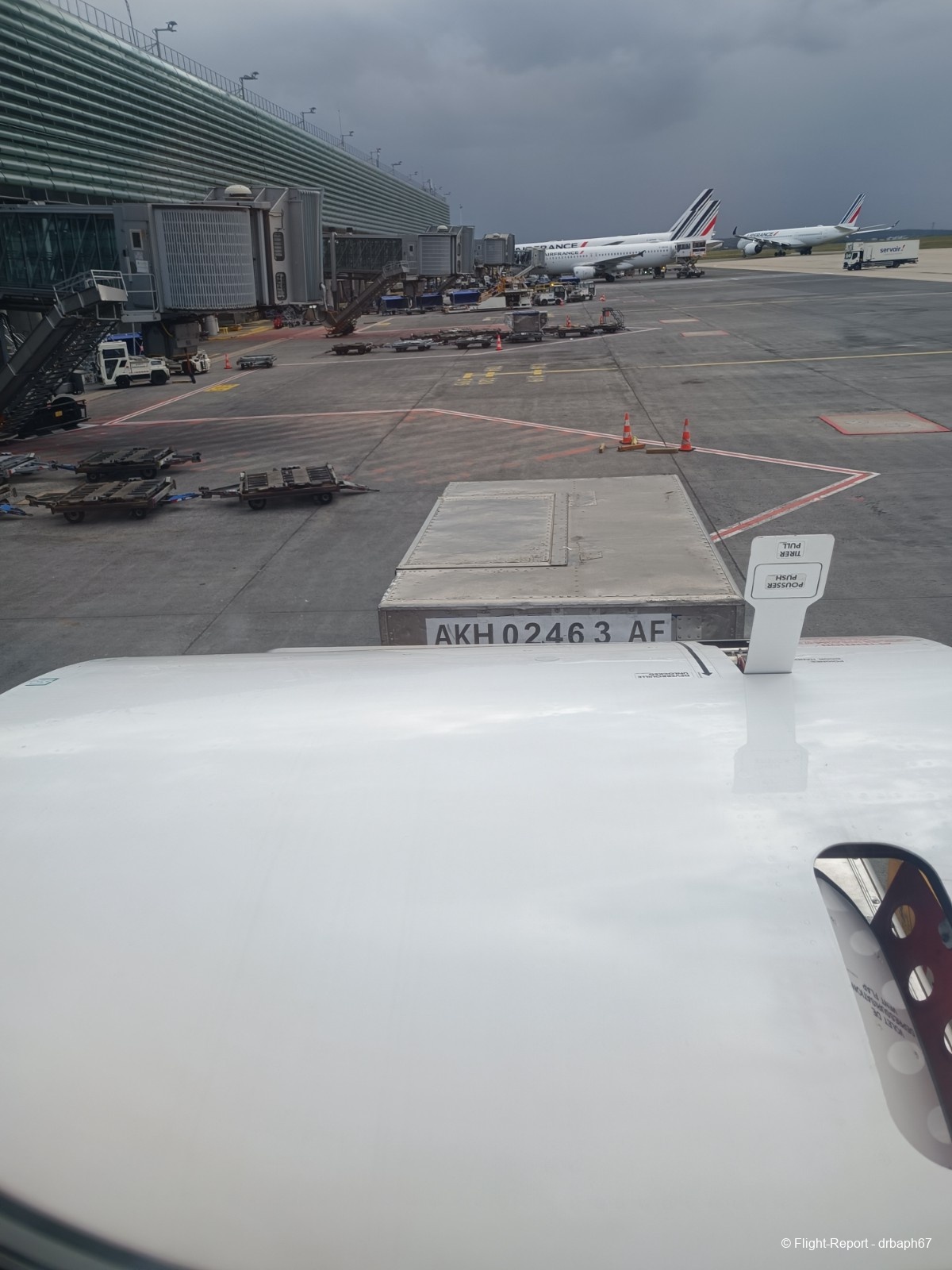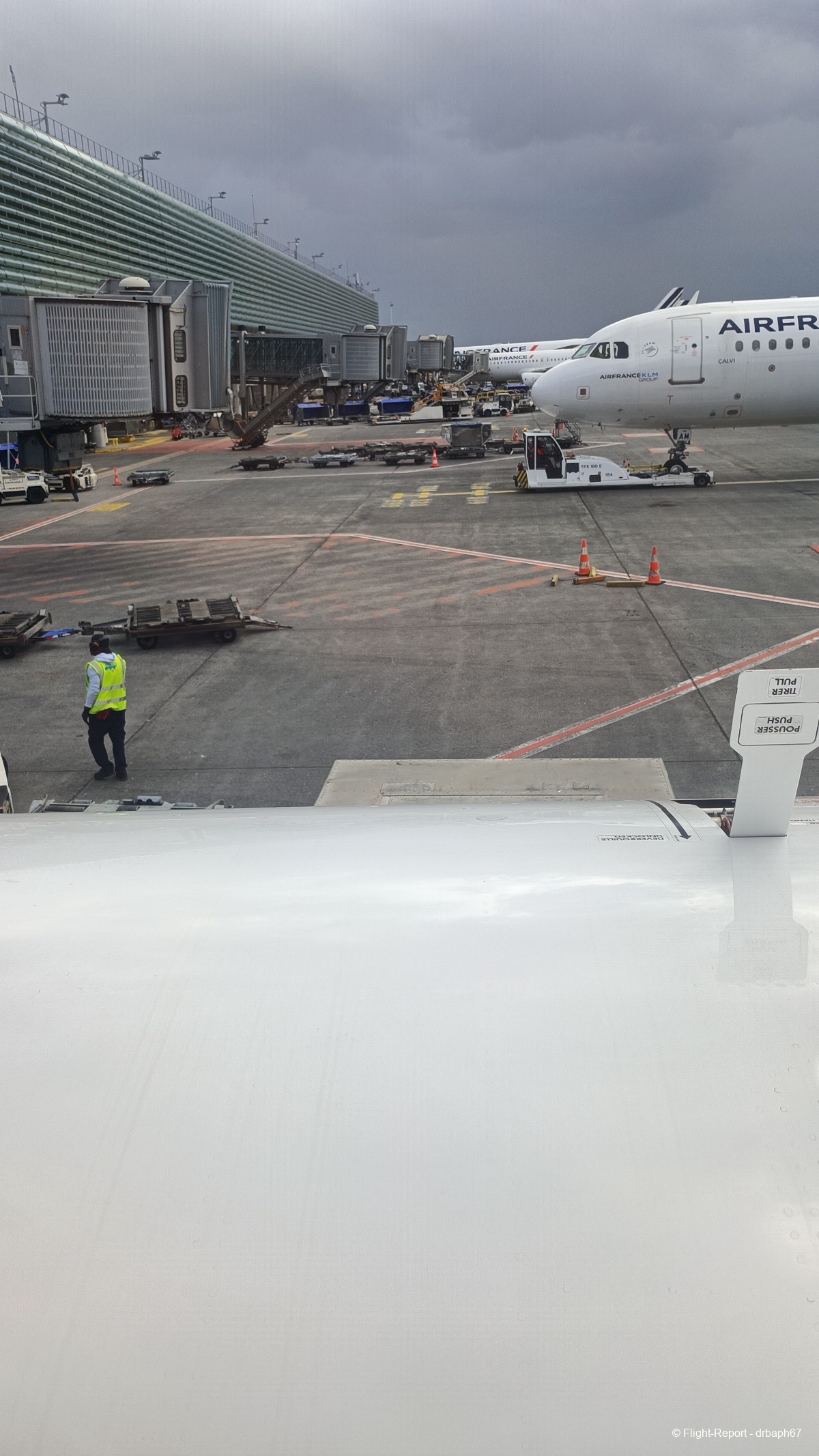 Nous quitterons la porte d'embarquement avec 38 min de retard. J'utiliserai le temps assis à mon siège pour un peu de plane spoting. Les avions Air France dont je verrai l'immatriculation partiront pour Munich, Budapest ou San Salvador. Nous roulons enfin puis décollons.