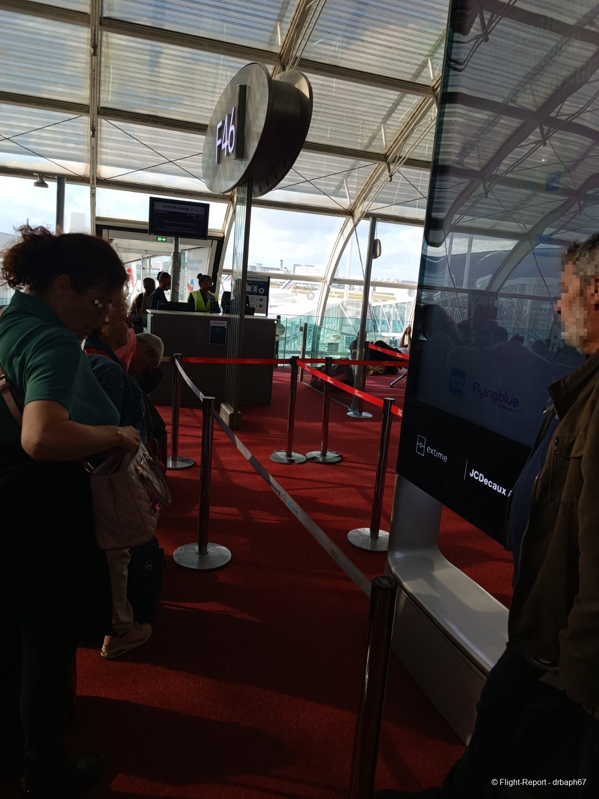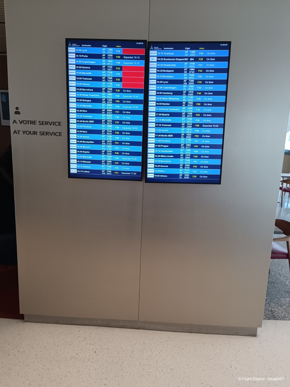 5 minutes avant l'embarquement je me dirigerai vers la porte F46. Nous aurons 15 min de retard à l'embarquement.
