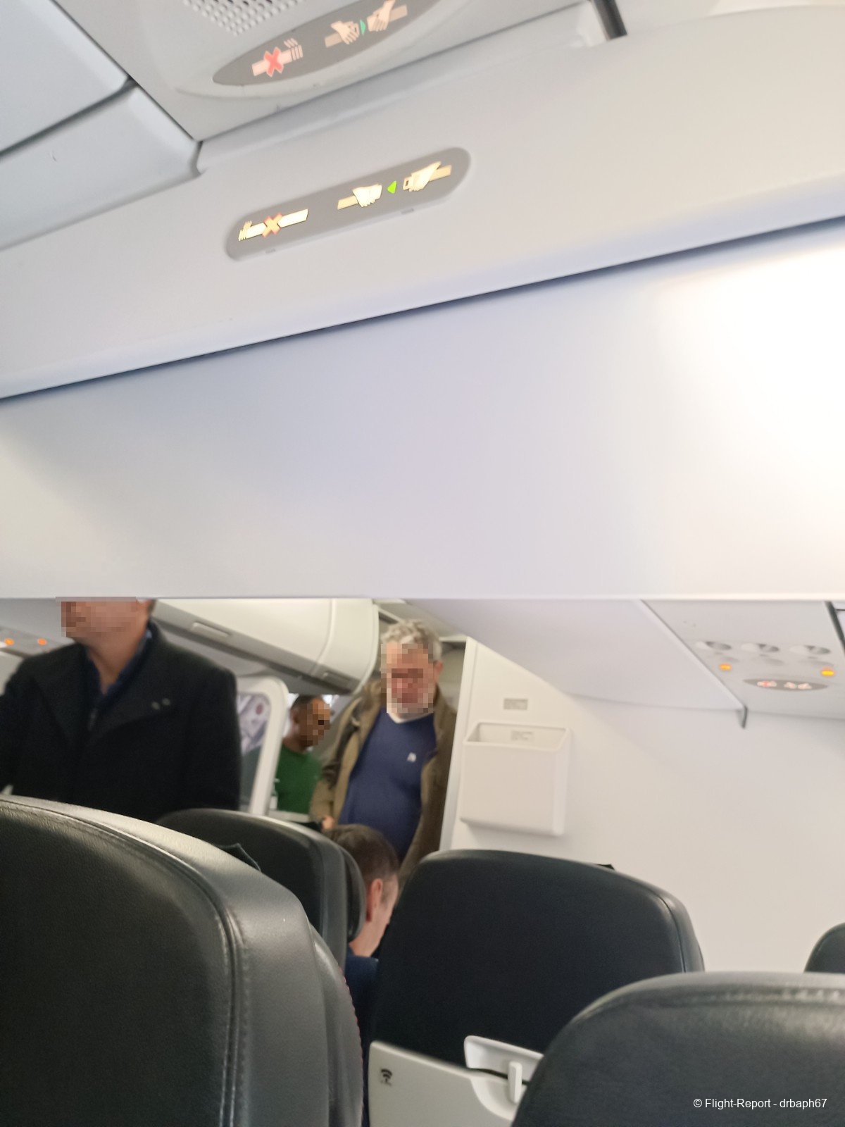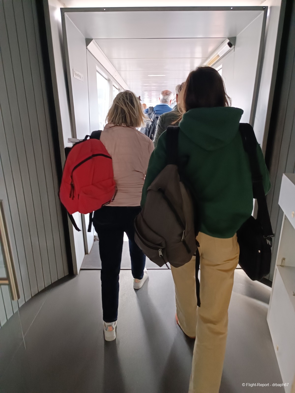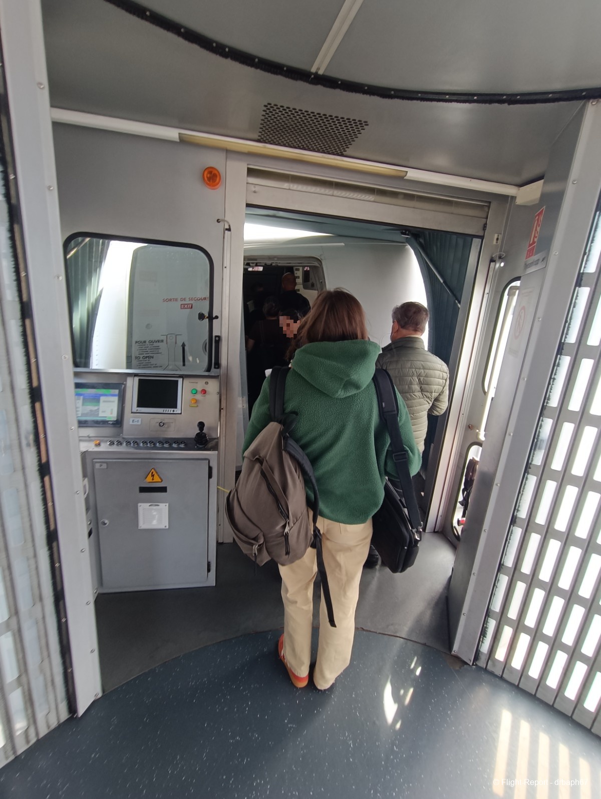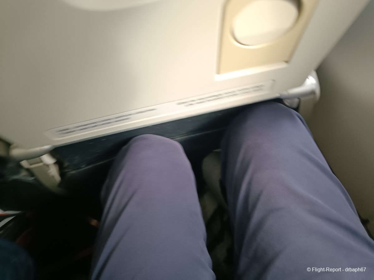 Nous voici enfin à la porte d'embarquement, nous passerons par une 2nde passerelle. Nous nous dirigeons vers l'avion et je ferai connaissance avec mon siège 3F, juste derrière la business class et un peu serré à mon goût mais pour une heure de vol je m'en accommoderai. L'avion semble récent.