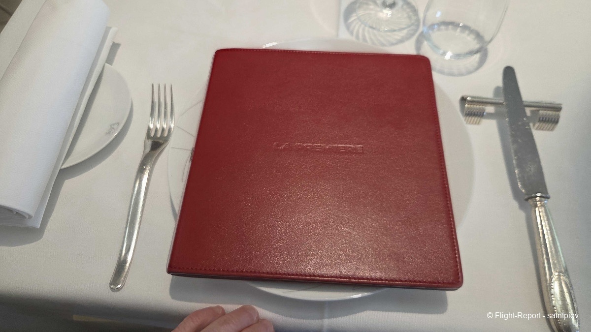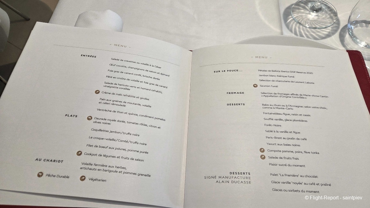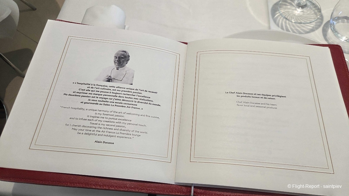 Vers 20h, la responsable du salon, qui passe régulièrement pour voir si l'on manque de rien, s'inquiète de ne pas me voir passer à table. Je lui dit que je n'ai pas vraiment faim et qu'il y a un repas à bord. D'ailleurs elle me montre le menu qui m'attend à bord, sur sa tablette. Elle insiste pour que je profite du menu exceptionnel Ducasse proposé au salon. C'est très gentil mais je vais déjà me forcer pour prendre celui à bord. Elle est presque déçu pour moi et j'aurai aimé lui faire plaisir mais non, je ne veux pas louper celui à bord même s'il est probablement de qualité inférieure. Toujours est-il que, compte tenu de l'heure d'embarquement, si je change d'avis je peux dîner jusqu'à 22h.