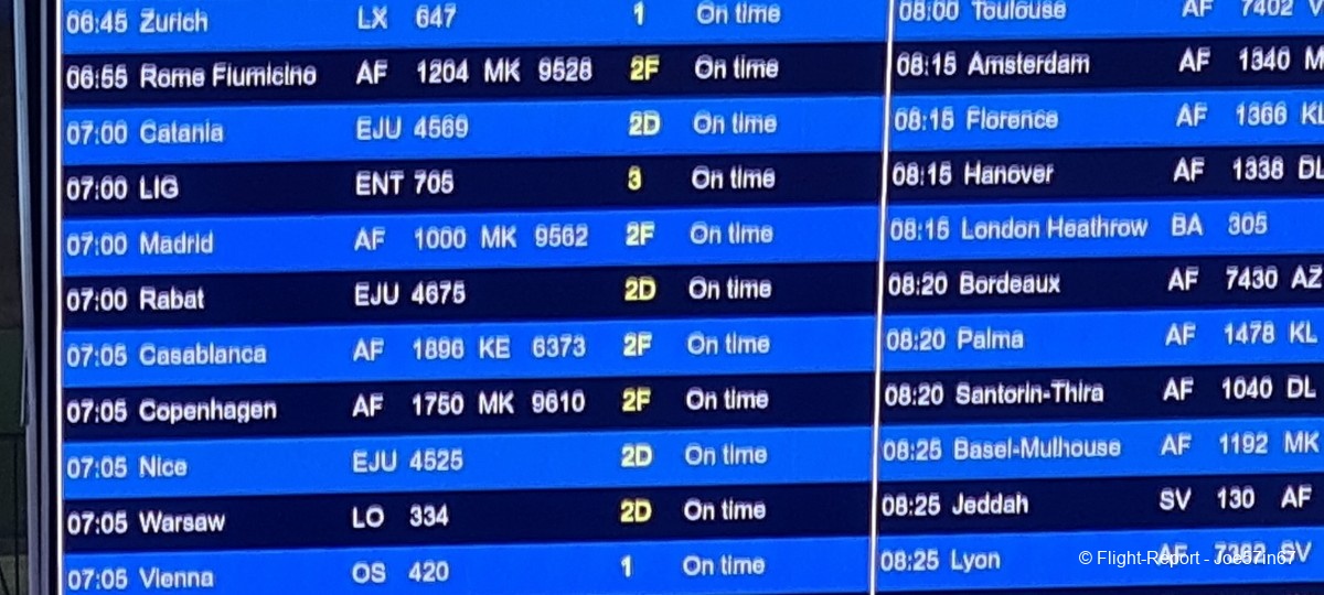Arrivé au 2F, voici le FIDS du jour. Je suis particulièrement étonné de voir les enregistrement pour CMN et RAK au 2F avec un embarquement au 2E (hall L). Bizarre ne de pas envoyer directement les PAX au 2E.