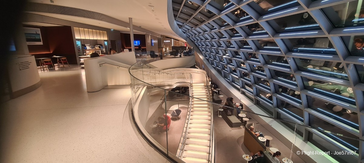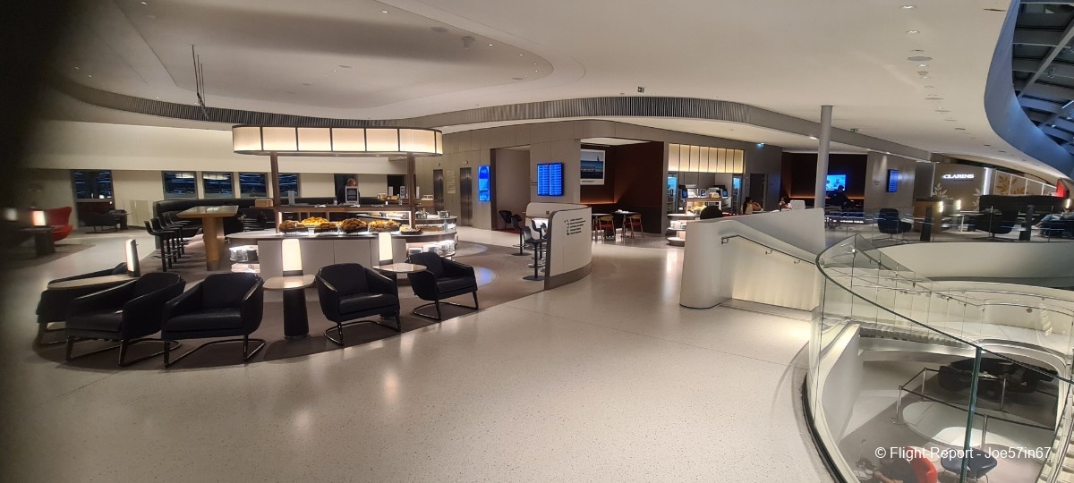 L'endroit est plutôt calme malgré le départ de tous les MC AF. Et je trouve le salon très joli avec ce bel escalier. Il y a tout de même des reflets sur les fenêtres qui font qu'on ne peut pas trop admirer les mouvements sur le tarmac.