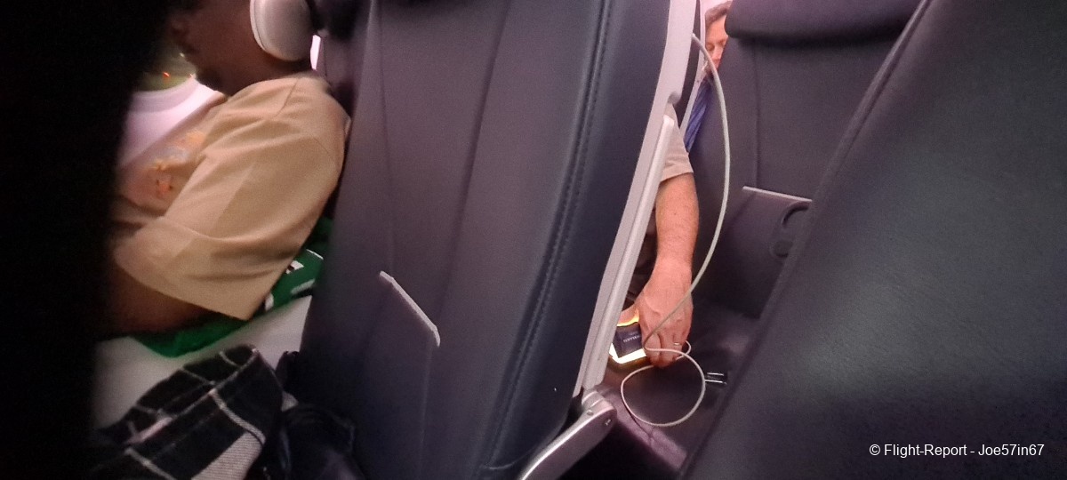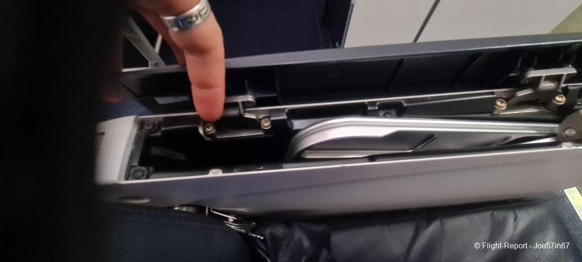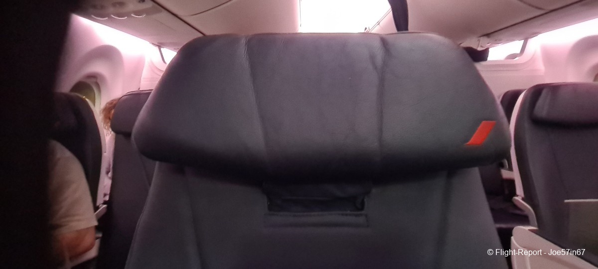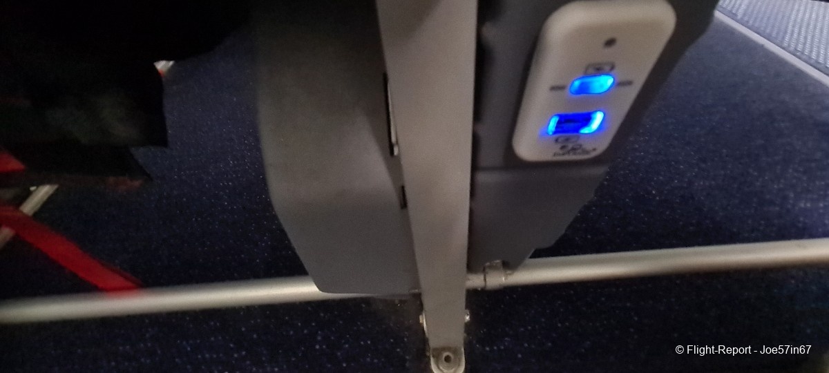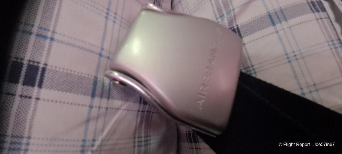 Je suis au 1D, le pas est royal. Le siège est confortable avec la têtière amovible, l'inclinaison du siège qui est correcte. La tablette se trouve dans l'accoudoir bien sûr. Il y a des prises USB pour recharger son téléphone. La ceinture est également calligraphiée. La critique que je peux faire c'est qu'avec la forme des coffres, quand on est au couloir côté droit, on a l'impression d'empiéter sur l'allée.