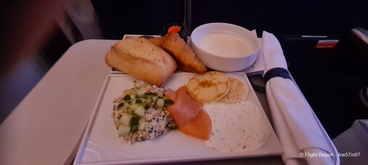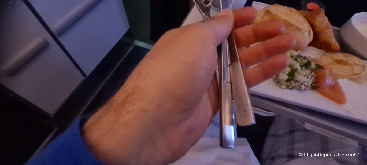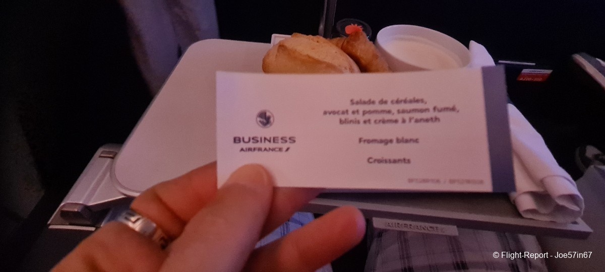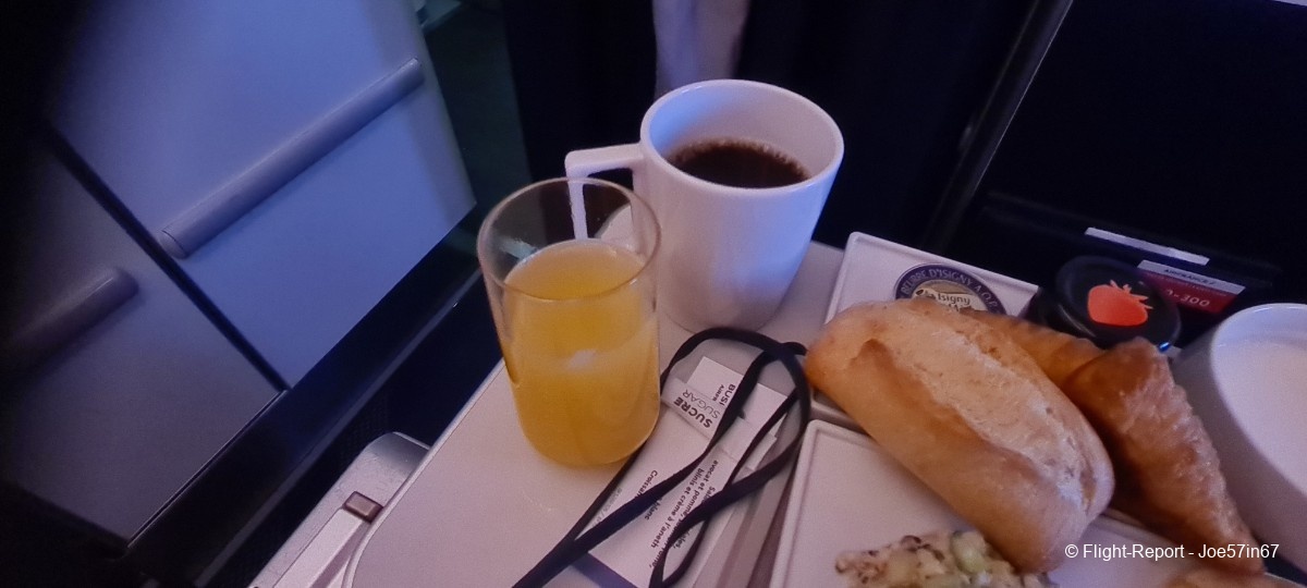 A 7h36, le service commence. Le plateau est servi individuellement. Au menu, une petite salade de céréales, saumon fumé, blinis et crème à l'aneth. Fromage blanc, croissants, pain, beurre et confiture. Le tout est joliment présenté même si le plateau est un peu petit pour tout mettre. Comme dans le salon, les couverts sont estampillés du logo de la compagnie. La quantité fût suffisante et le repas en lui-même très bon. La salade de céréales avec le concombre donne de la fraicheur. La crème d'aneth mériterait une pointe de raifort mais c'est l'Alsacien qui parle. Le CC me demande ce qui me ferait plaisir avec le repas et je demande un café et un mimosa qu'il me sert avec plaisir et entrain. A croire que cela lui faisait plaisir de servir du champagne de si bon matin !