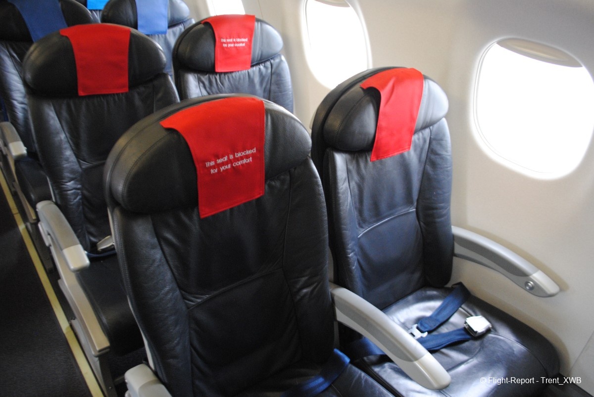 The cabin consists of 82 seats in 2-2 layout, standard for E-jets. Up to 4 front rows can be occupied by "eurobusiness" (red antimacassars) with 1 pax per duo block. On this flight "eurobusiness" occupied 3 front rows. On the 4th photo in the gallery one can see how severely misaligned can be windows and rows in Embraers. The windows are quite large, but their pitch is also large and it creates misalignment problems.