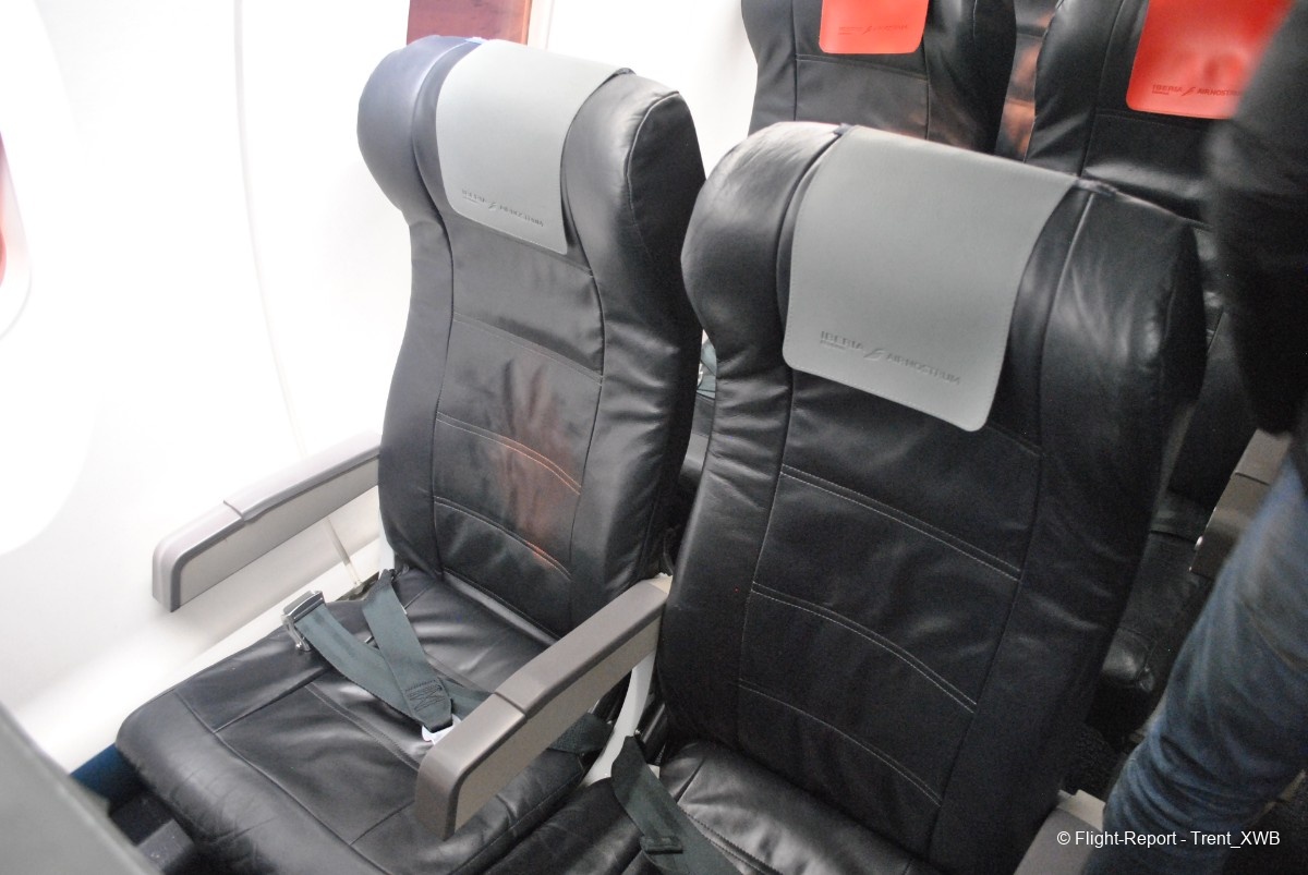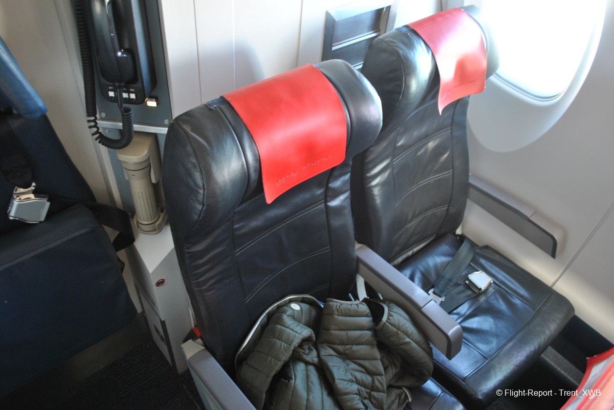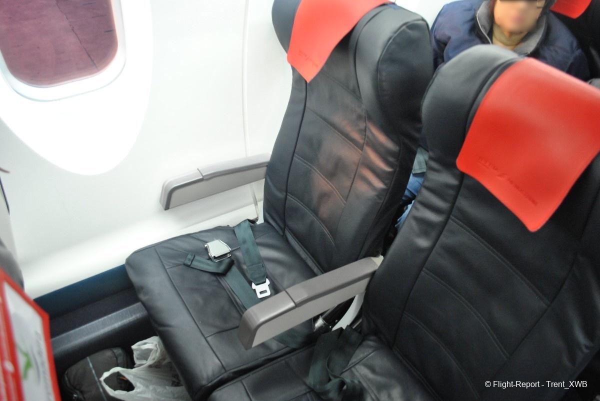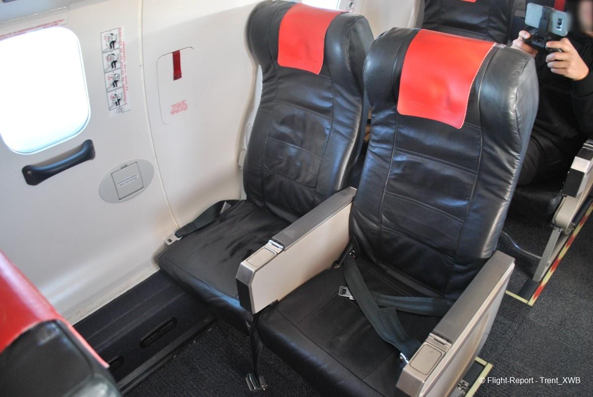 Though, the seat itself is well-padded and feels comfortable for mid-haul flights. The seat has leather upholstery, tray table and seat pocket. But the seats were showing their age and felt tired, with cracked armrests. The row pitch was OK.