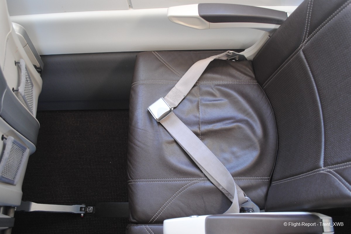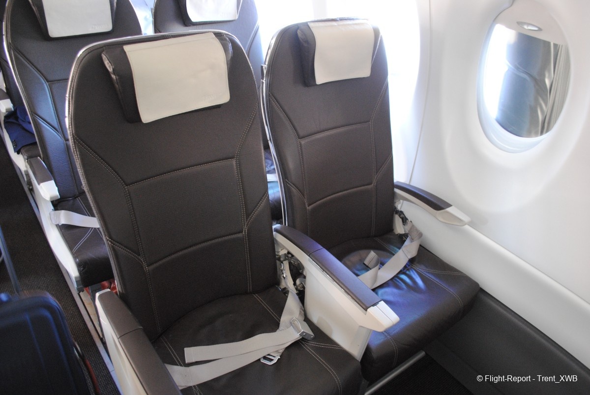 My seat is 18F in a triple seatblock after the window. I prefer duo seatblocks on the left side, but this time the sun position dictated the necessity to choose the right side. The seat manufacturer is ZIM, though, I don't remember the exact model name. The same seats are installed in airBaltic A223s. This seat is very good with comfortable (despite being slimline) shape of the seatback. The seatwidth is ample: approx. 18.3", on par with 3-3-3 B777 seats. The seat has headrest, leather upholstery, tray table, upper hard large seat pocket and two lower small soft seat pockets. The row pitch is good.