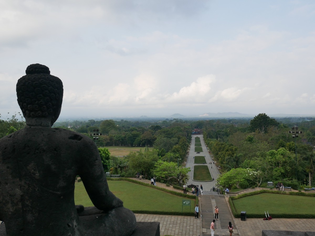 Depuis ce point culminant, la vue s’ouvre sur un paysage grandiose : la plaine de Kedu, les rizières et les montagnes lointaines.