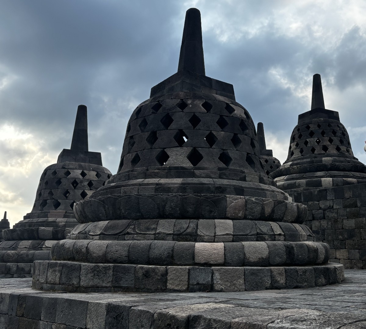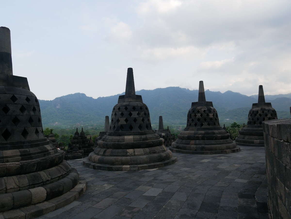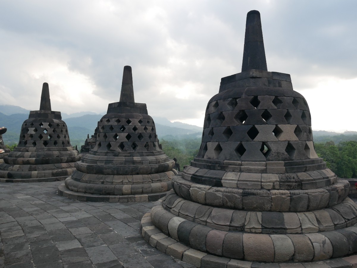 Sur les trois plateformes supérieures, se dressent 72 stupas ajourées de motifs et abritant des statues de bodhisattvas méditant.