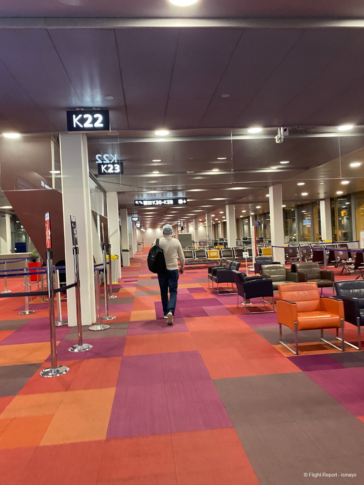 Le bus dépose mon père au niveau inférieur du hall K, avec les portes K21 à K27, ce qui l'obligera à utiliser un escalator pour monter à l'étage supérieur où se trouve sa porte d'embarquement.