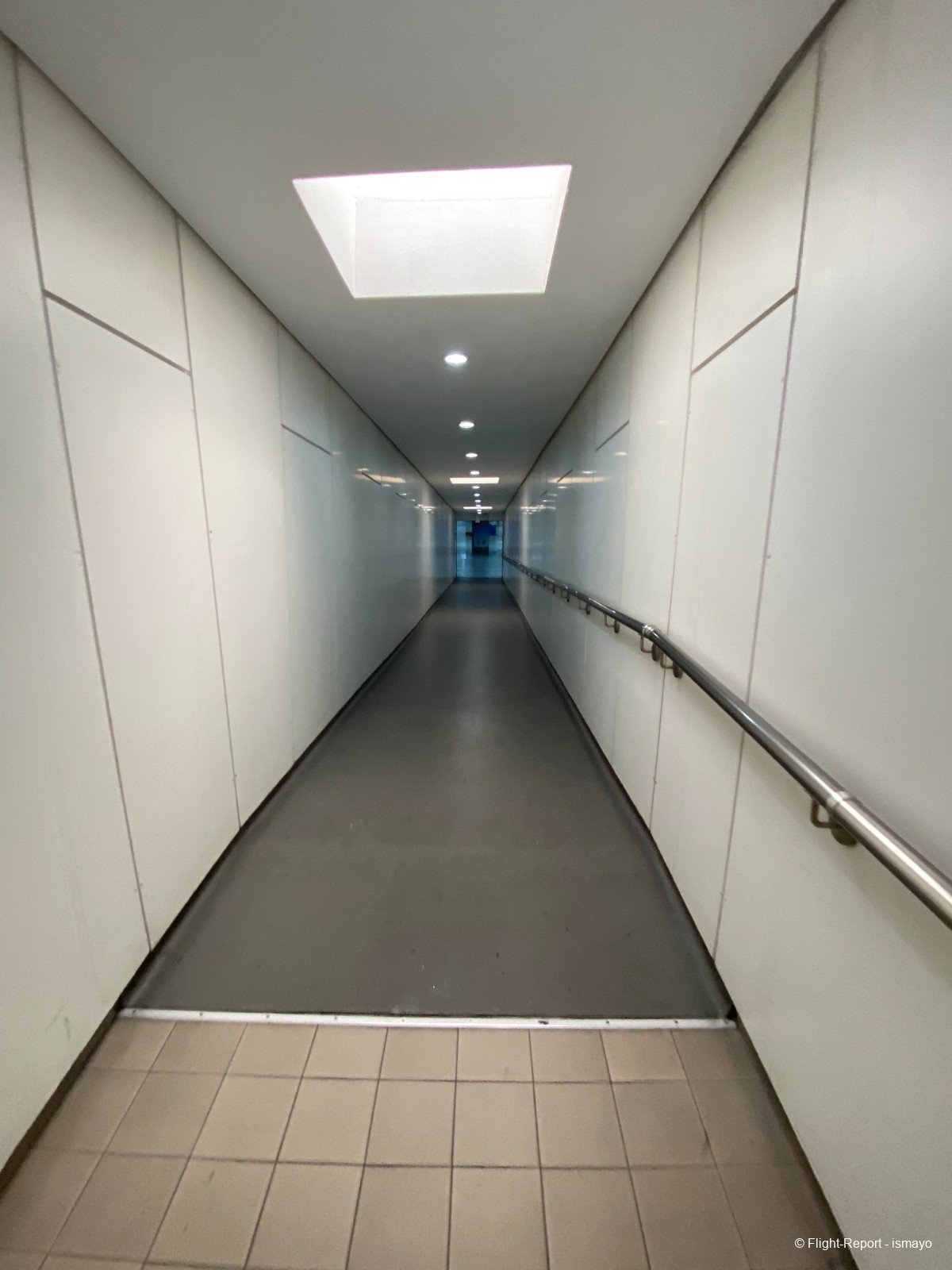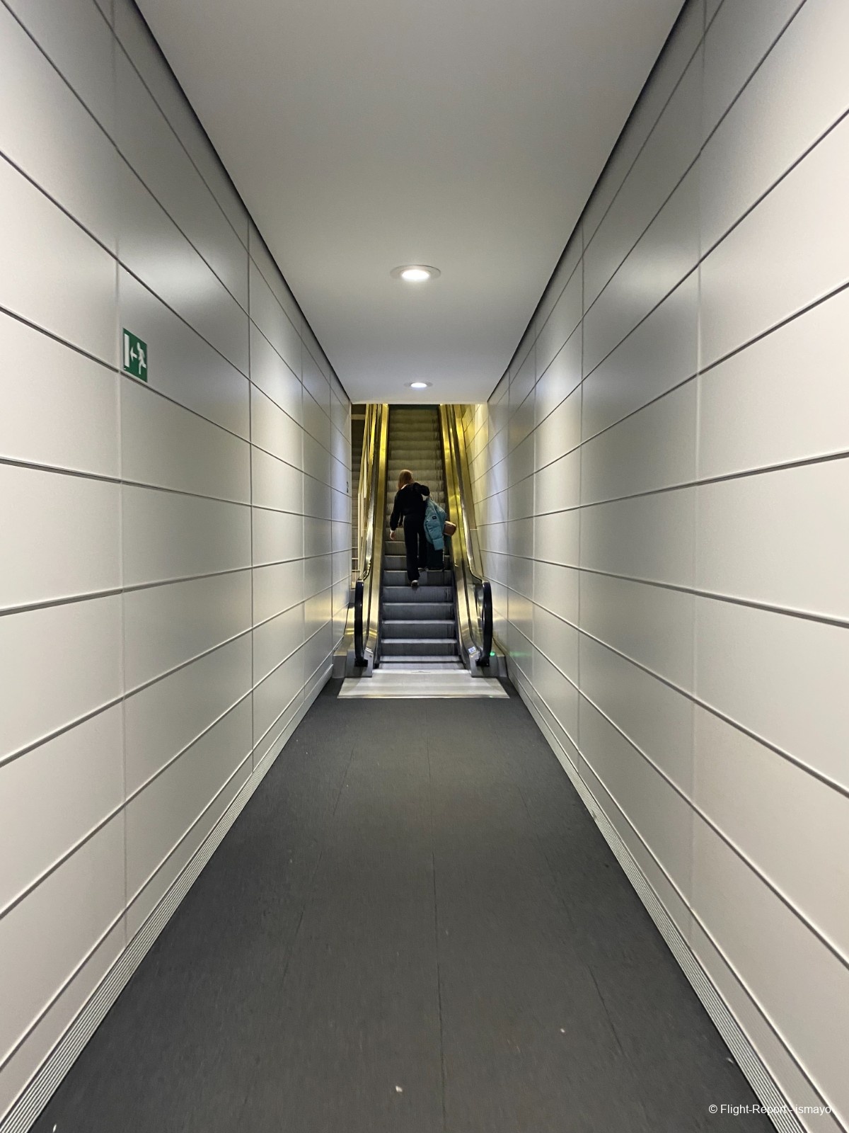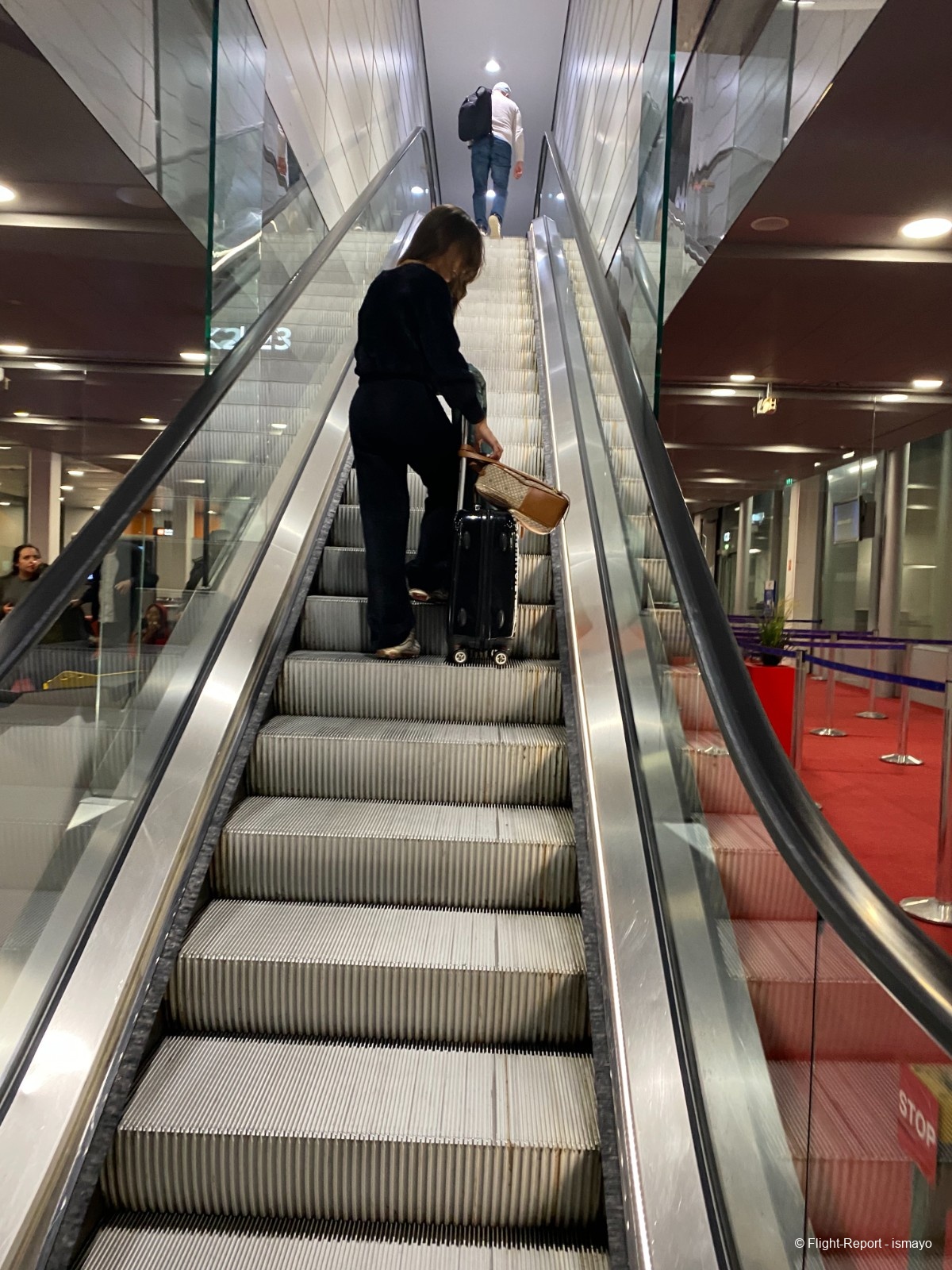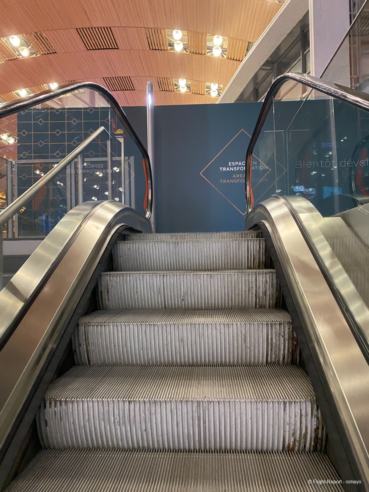 Après s'être fait scanné sa carte d'embarquement et après avoir effectué un contrôle d'identité, mon père descend les fameuses rampes d'accès aux passerelles du hall K du Terminal 2E.