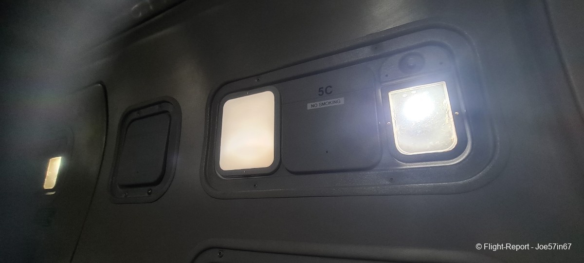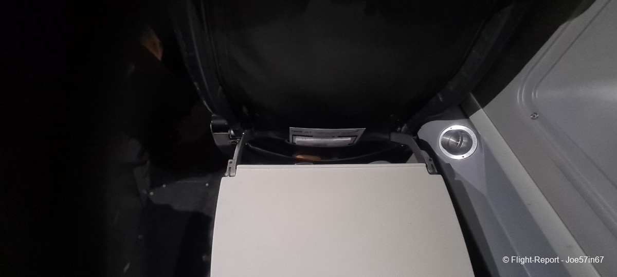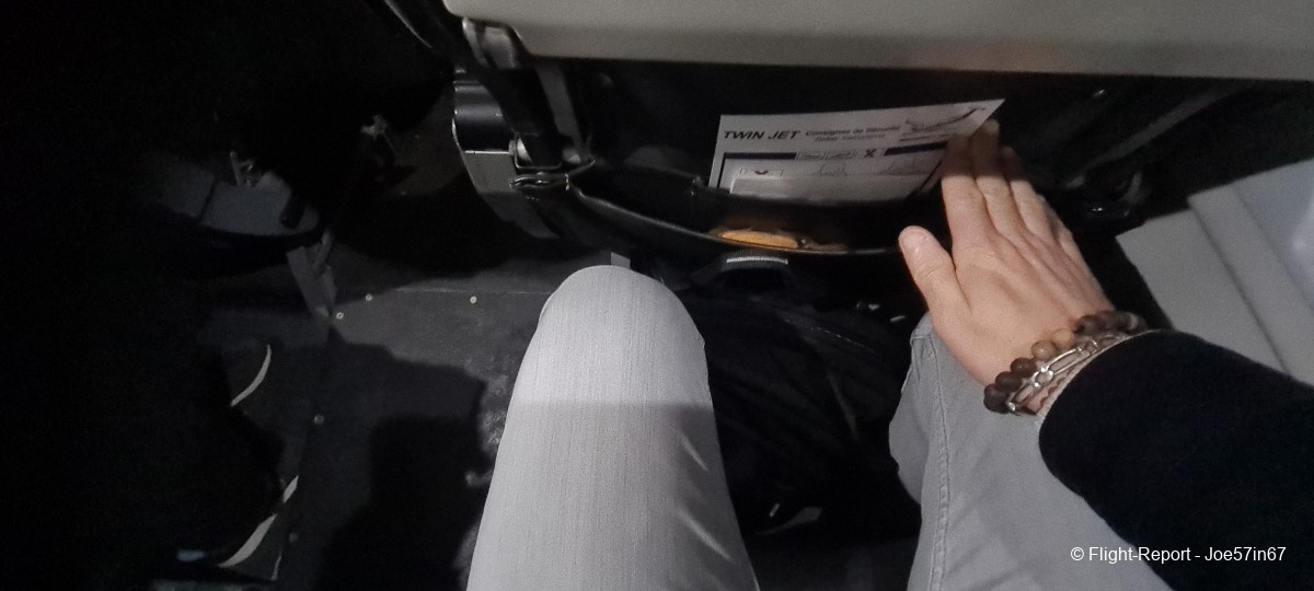 Abonné au 5C (3e fois à cette place sur 5), le pas est assez réduit. J'ai à peine de la place pour mes jambes car je ne peux pas mettre le sac à dos sous le siège devant moi à cause de cette petite boîte. Avec la tablette ouverte et le manteau, on est quand même à l'étroit et en étant de corpulence moyenne. Le siège, inclinable, reste tout de même confortable. Safety card et sac vomito sont présents.