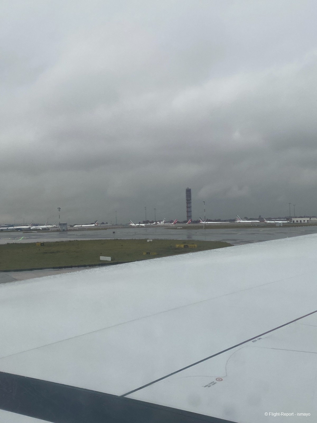 Le taxi jusqu'à la piste 08L/26R débute alors sous une grisaille typique de la région parisienne.