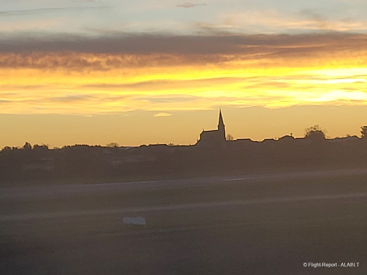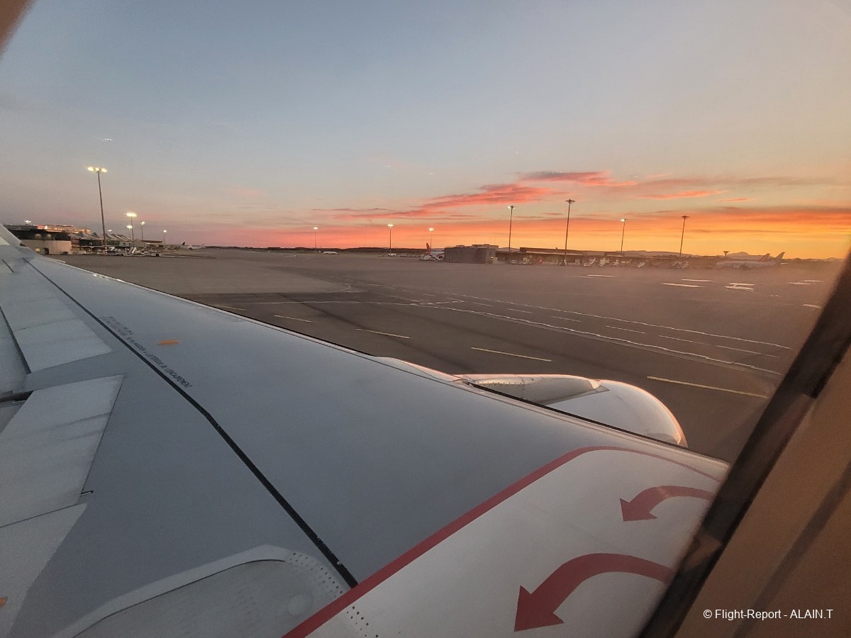J'ai la chance d'avoir un hublot et admirer ce qui se passe à l'extérieur. A la fois les aéronefs en stationnement mais aussi l'aube qui se lève.