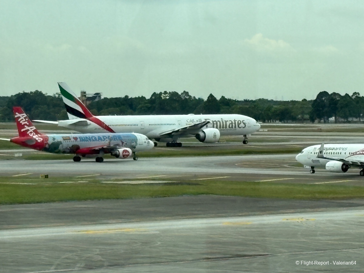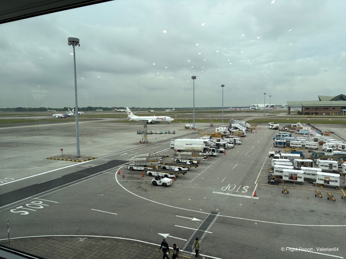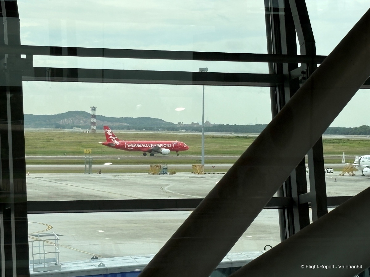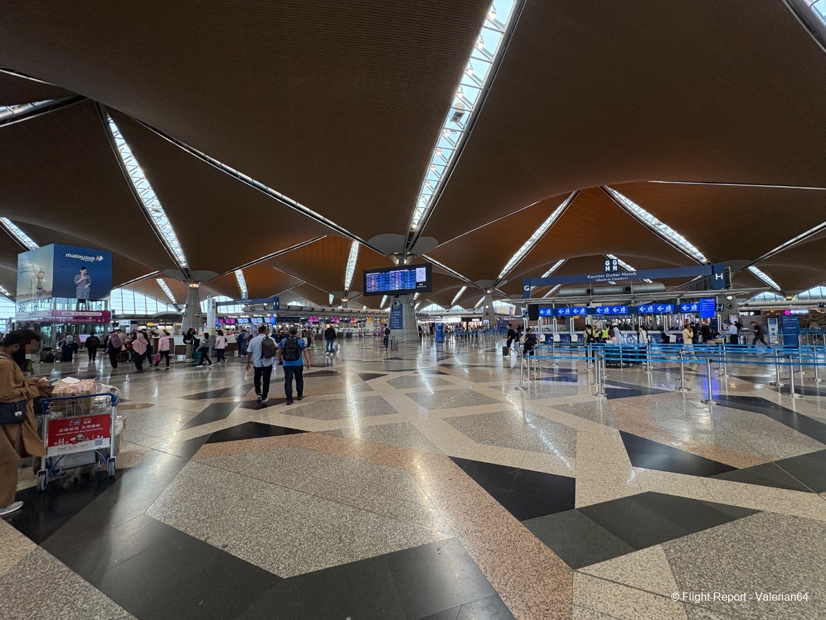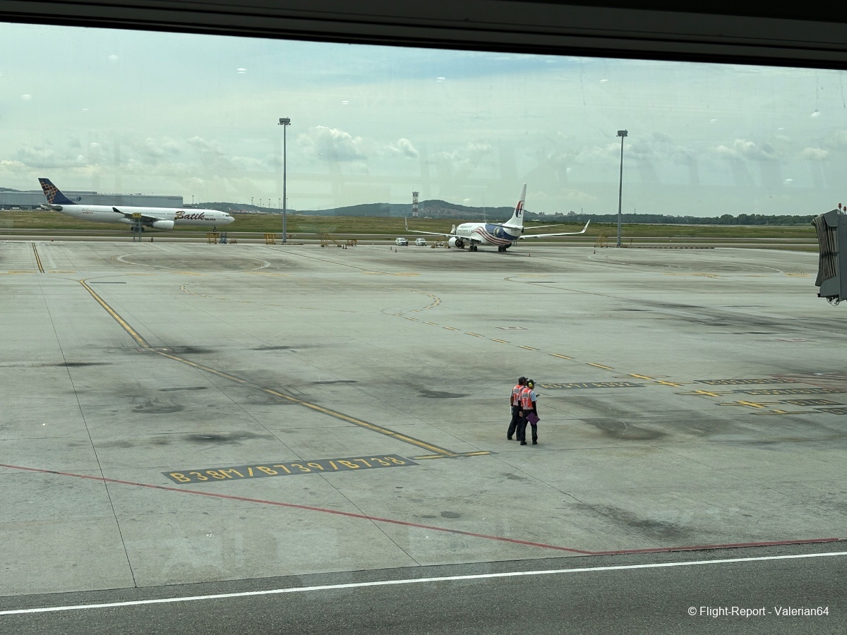La dépose des bagages fut immédiate, le passage à la PAF tout aussi fluide. Puis passage par un scan bagages. À 10h, j’étais airside. L’attente se fait dans un long et moderne couloir, avec quelques boutiques duty-free habituelles et des décors malais. De larges baies permettent de spotter, mais la multiplication des vitres rendait difficiles les prises de vues.