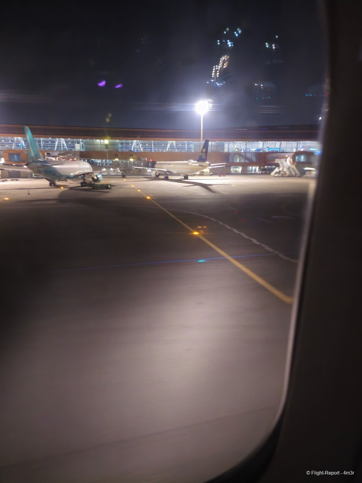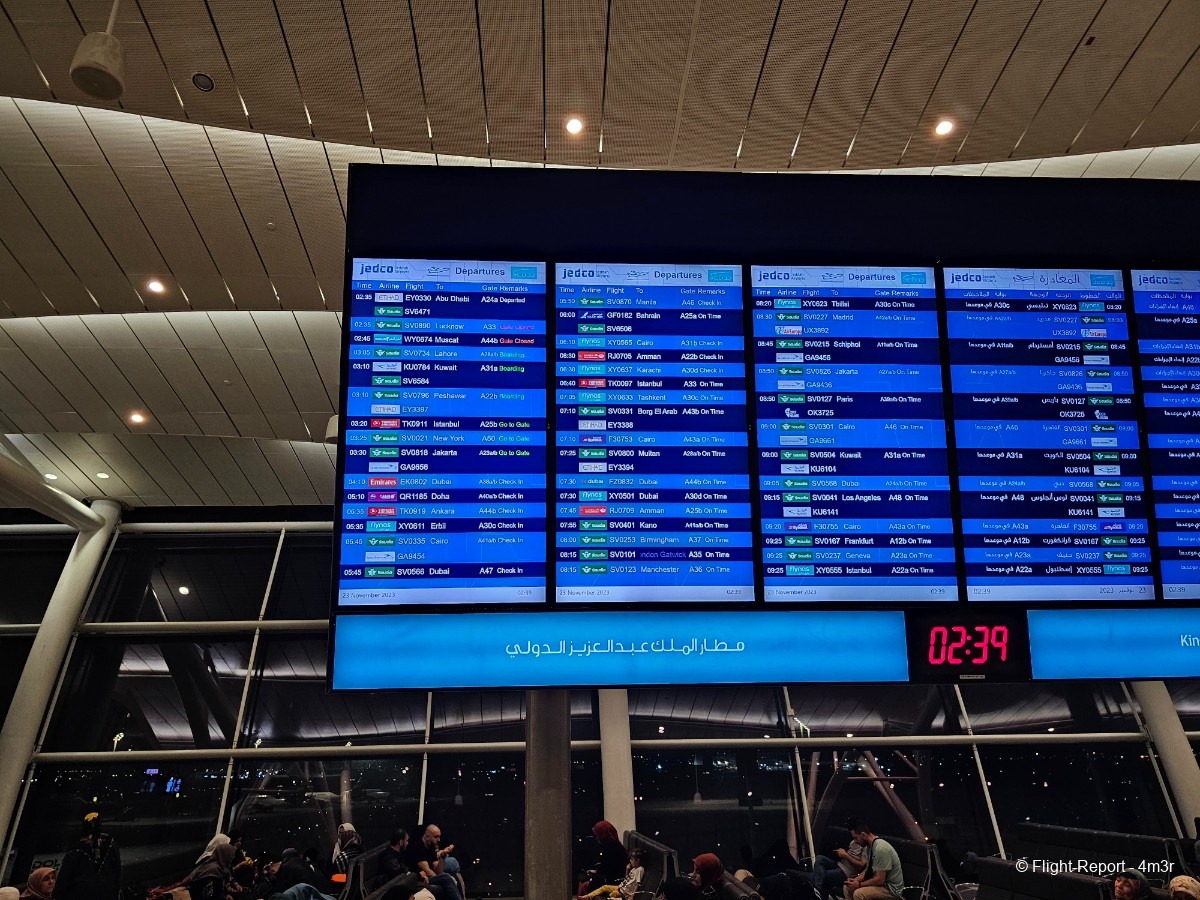 Quelques jours auparavant, Saudia m'avait averti que ce vol aurait droit à un changement d'appareil, de ce fait j'ai dû changer de siège pendant le check in & … à ma surprise je vois que ce sera le Boeing 747-400 qui prendra place, bah voilà ce sera une première pour moi et qui plus est en Business, après pour ce qui est de la cabine je m'y attendais à ce que soit du vintage mais profitons du moment