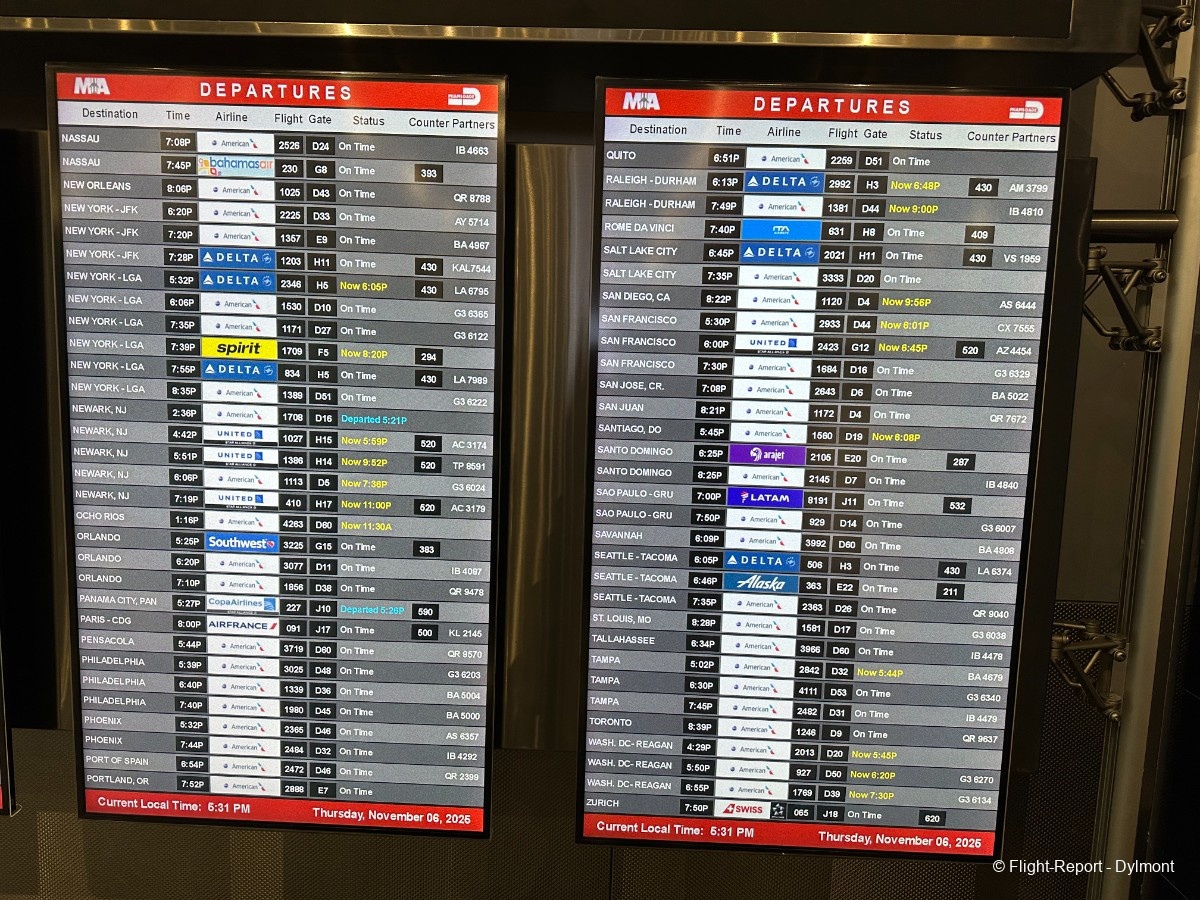 L’arrivée à l’aéroport a été particulièrement difficile en raison de la circulation dense entre Miami Beach et Miami. Heureusement, l’enregistrement ainsi que le contrôle de sécurité se sont déroulés sans la moindre encombre et avec une rapidité exceptionnelle, ce qui a largement compensé le trajet compliqué.