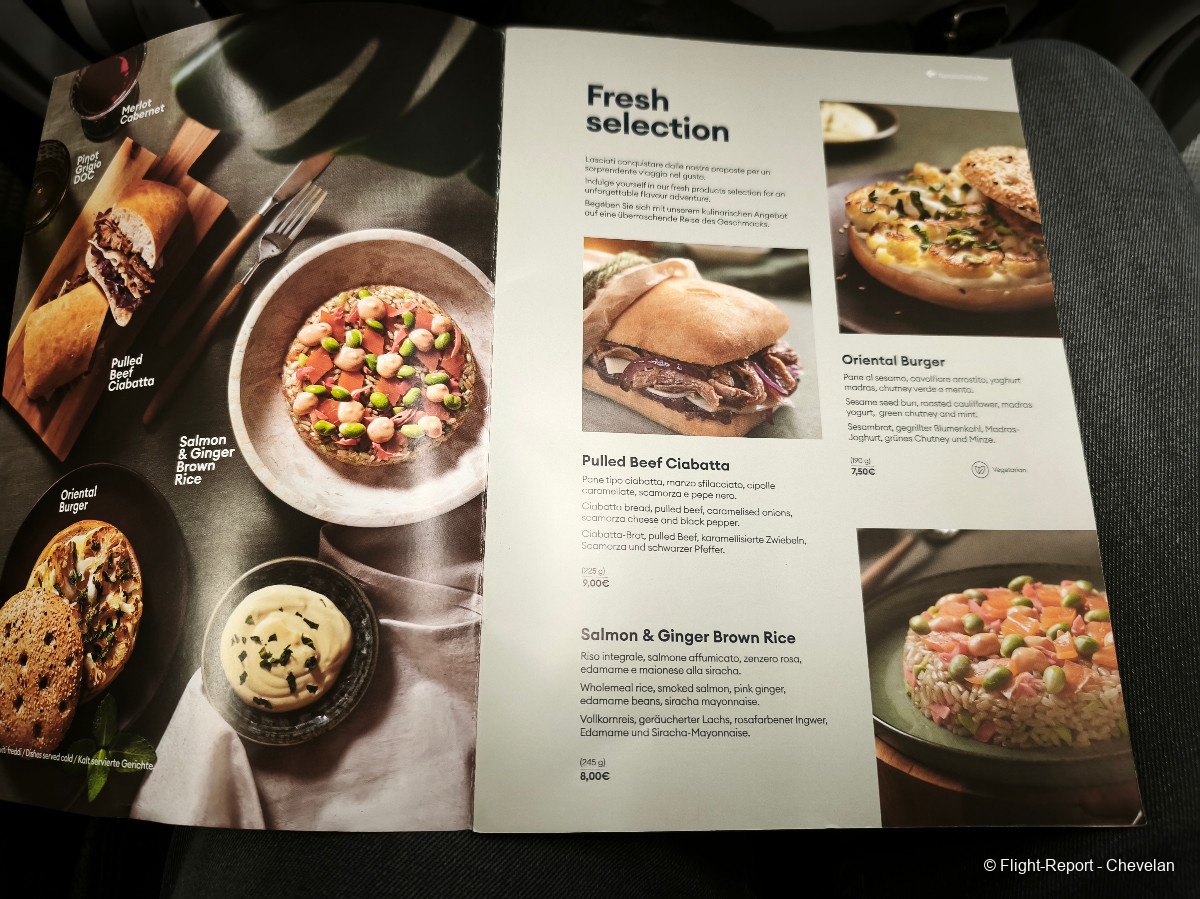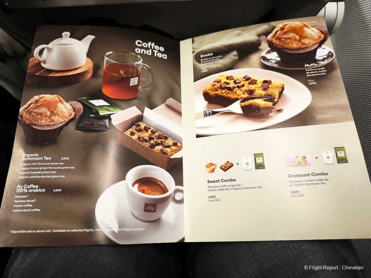 Le trolleys est de sortie dix minutes après le décollage, une bouteille d'eau ainsi qu'un biscuit emballé sont distribués, le BoB n'aura pas un large succès.