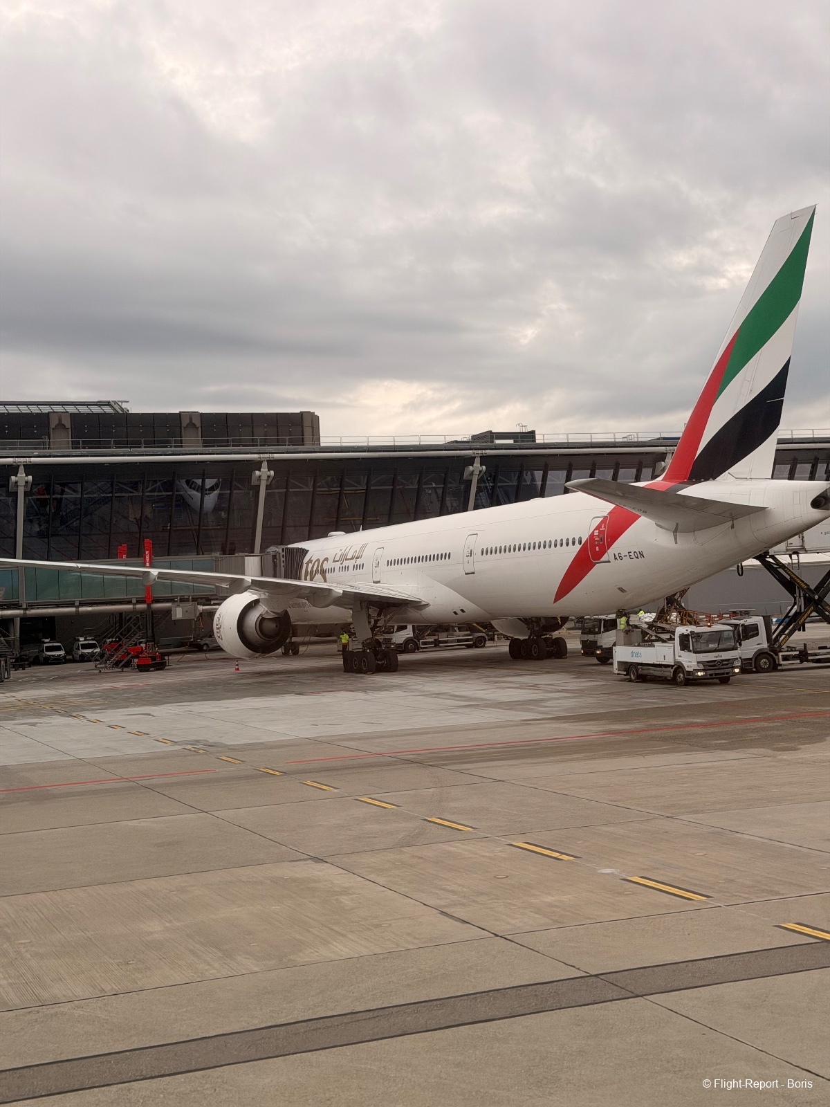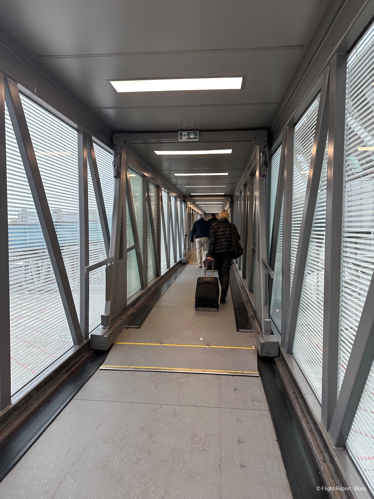Arrivés devant la porte, notre avion est déjà là. On l’aperçoit à peine, partiellement caché derrière la passerelle d’embarquement.