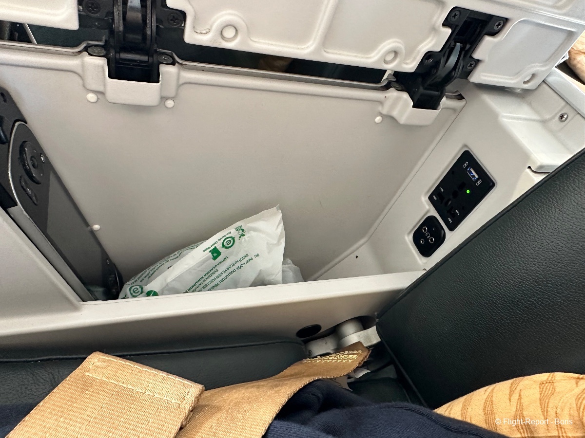 À mon siège, je retrouve un coussin, toujours appréciable, même pour un vol d’environ 3 heures. Les commandes pour incliner le siège sont simples et agréables à utiliser, permettant de se mettre rapidement à l’aise durant le vol. Entre les deux sièges, un compartiment de rangement est disponible : on y trouve la télécommande de l’IFE, les prises pour recharger son téléphone ainsi que la prise pour brancher le casque audio. Petit détail très pratique sur cet appareil, l’accoudoir peut se relever, ce qui facilite grandement l’accès au compartiment de rangement. Ce n’était pas le cas sur le vol précédent en 777, où cela s’était révélé assez contraignant.