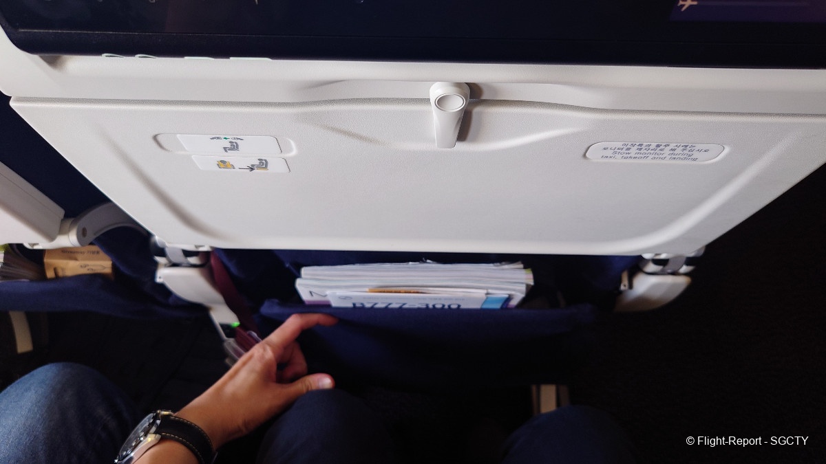 Korean Air kept its 33-34 inch seat pitch, similar to the previous flight. My 1.77m frame happily fit into the seat. However, the seat width has been made narrower. My seatmate and I are average sized Singaporean men, and our shoulders touched for the entire flight. This is on row 52 where there are only 2 seats on the left side. I can't imagine flying in the middle seats in this tight squeeze…