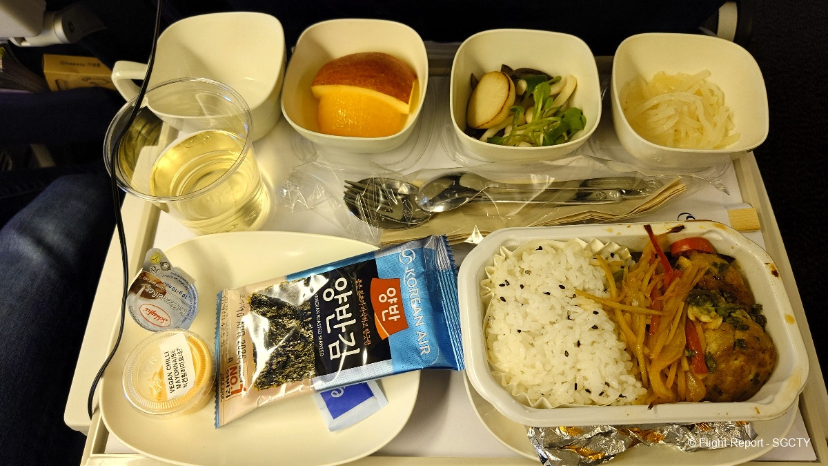 After takeoff, the crew quickly got into action and started serving meals. I got my Korean vegetarian meal before the main cabin. I caught my seatmate looking at my food but he didn't start a conversation with me. I would have happily talked the whole flight about airlines if people chatted with me!