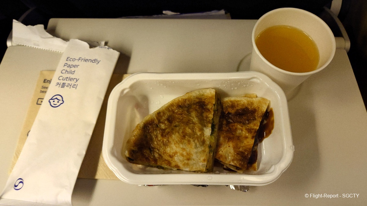 Korean Air is very generous with the meals on this route, as they served a second snack before landing. Singapore Airlines does not do this. My special meal snack consisted of rice pancakes called Hotteok. It was my first time trying and I enjoyed it.