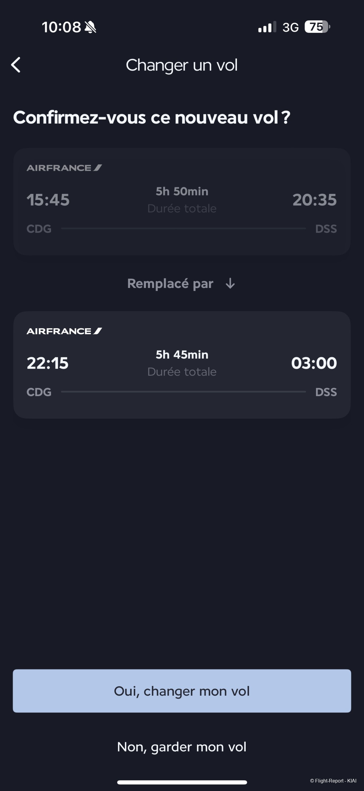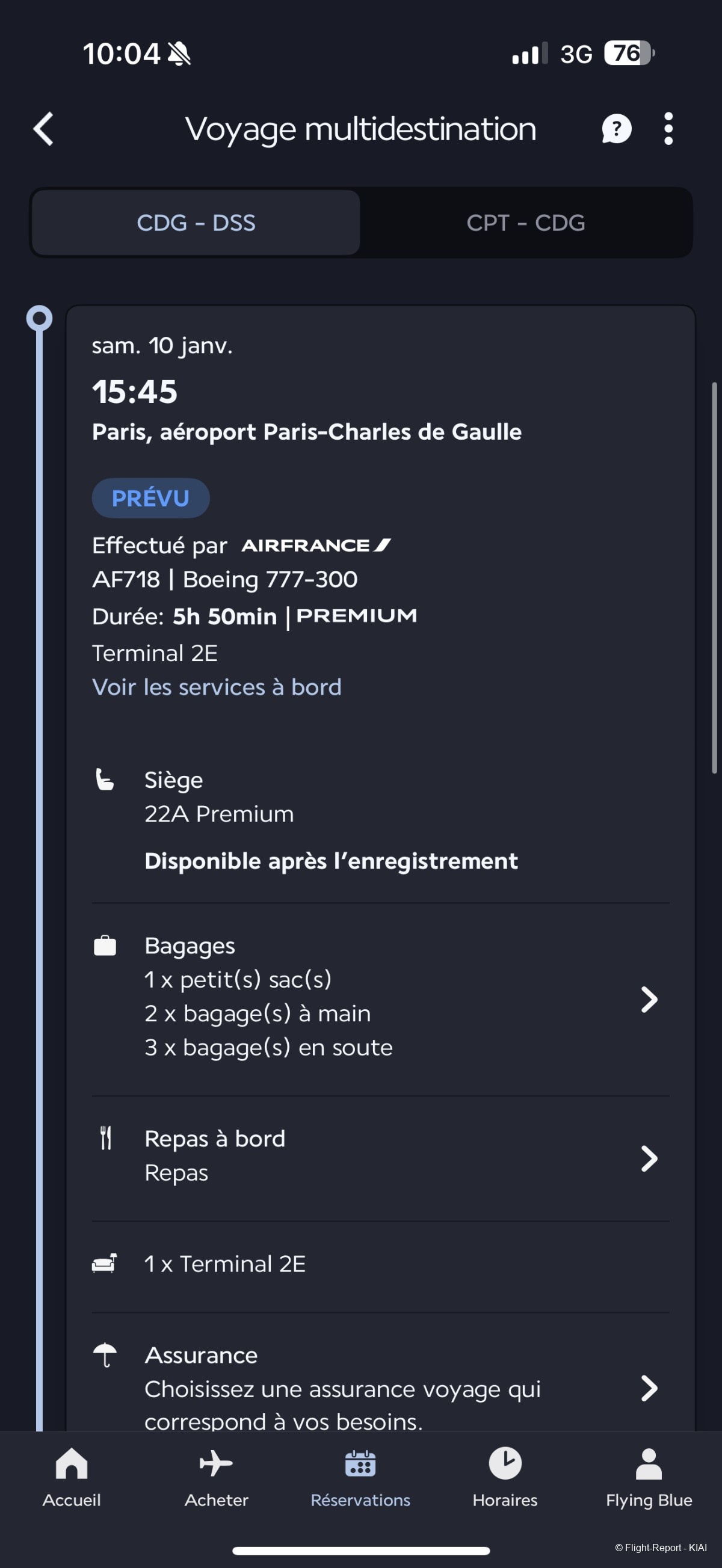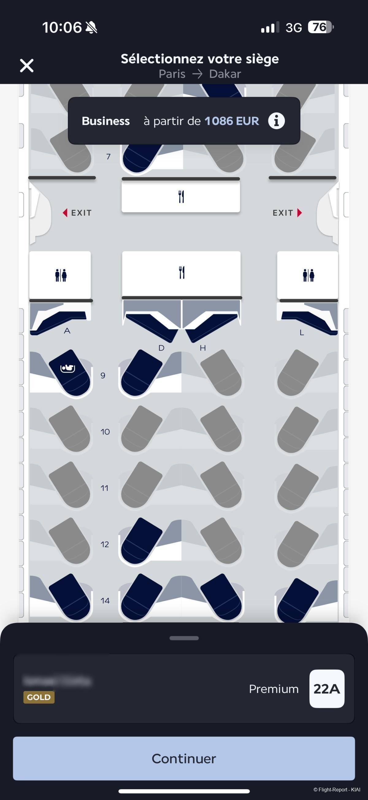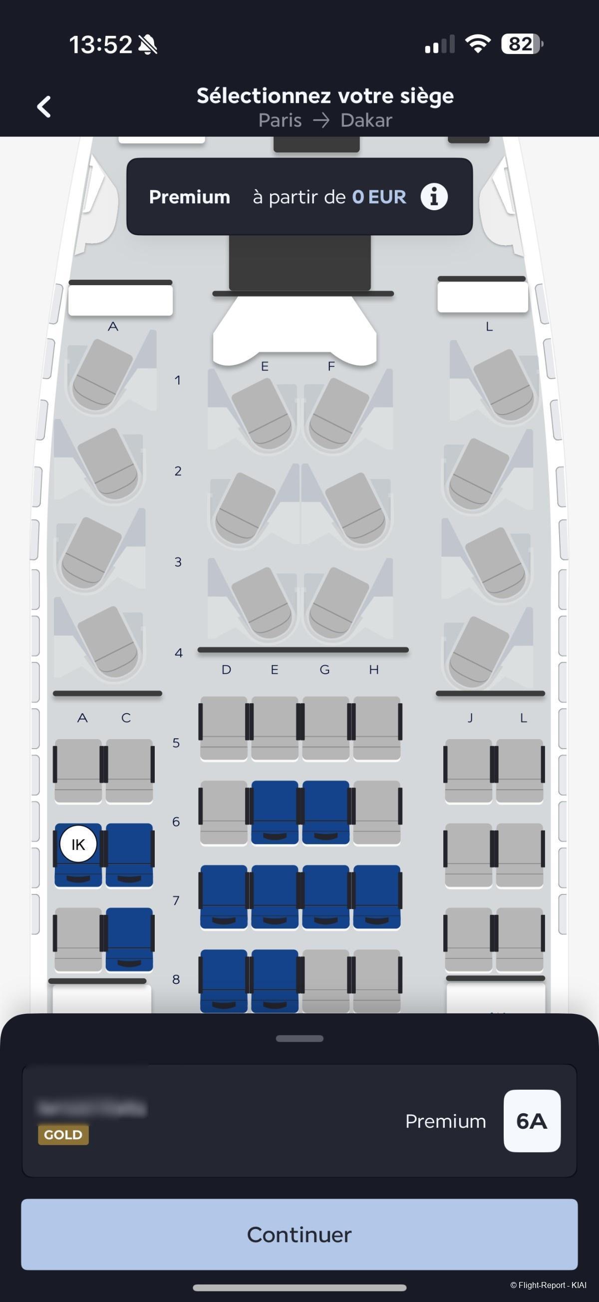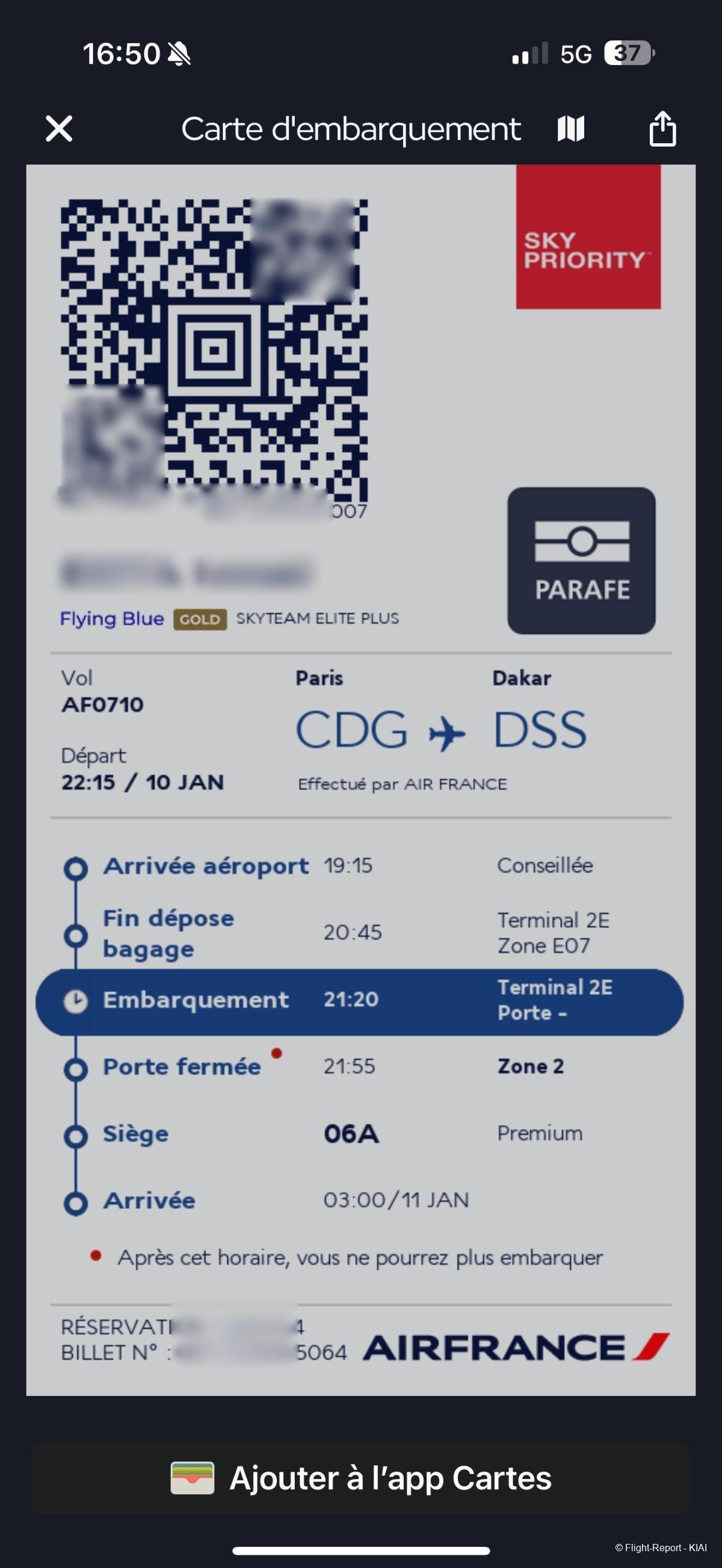 Initialement, mon vol devait partir à 15h45 avec le vol AF718, opéré par un Boeing 777-300ER (immatriculé F-GZNU), en configuration C48 W48 Y273. Cependant, à la dernière minute, j’ai dû modifier ma réservation pour pouvoir mieux préparer ce trip. Le vol suivant, AF710, décollait huit heures plus tard. Ce vol, ajouté récemment au programme, semble témoigner de la forte demande, notamment en raison de l’effervescence autour de la Coupe d'Afrique des Nations, qui influence sans doute les plans de vol.